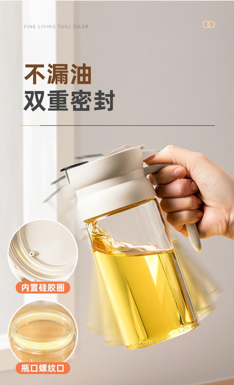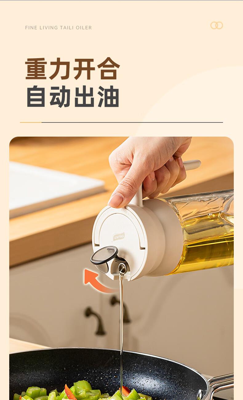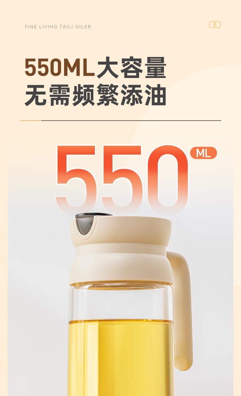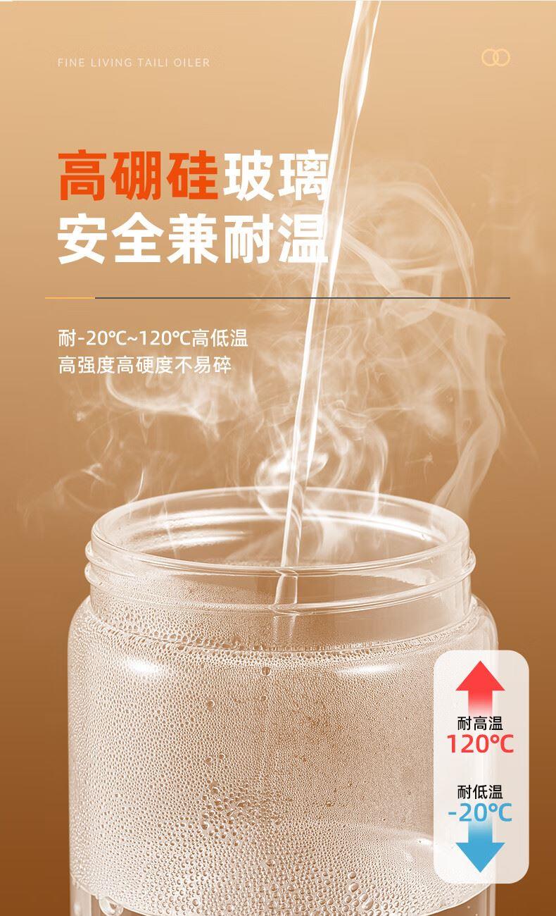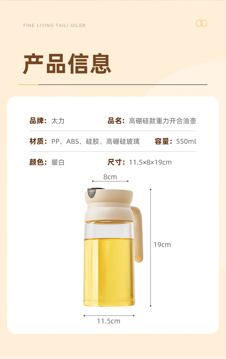 产品尺寸:11.5*8*19cm(1个装) 容量:550ml 材质:PP,ABS,硅胶,高硼硅玻璃 包装清单:高硼硅自动开合油壶550ml*1个 图案:透明 功能:自动出油,自动回油 产品描述:550ml大容量,可拆卸易清洗,高硬度高强度高透光率