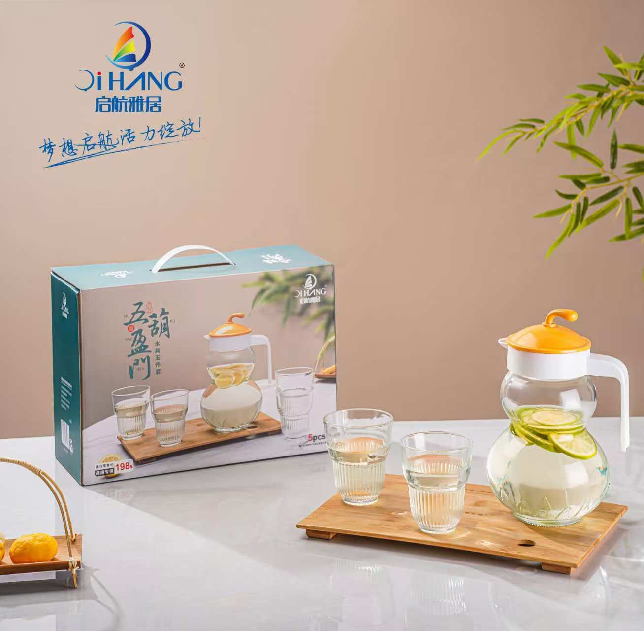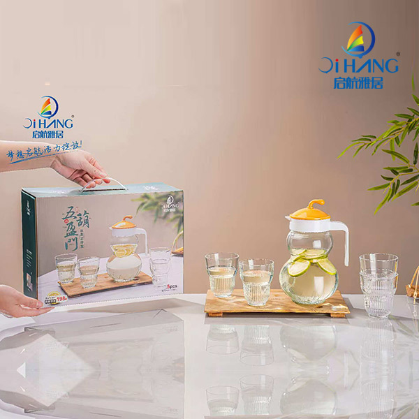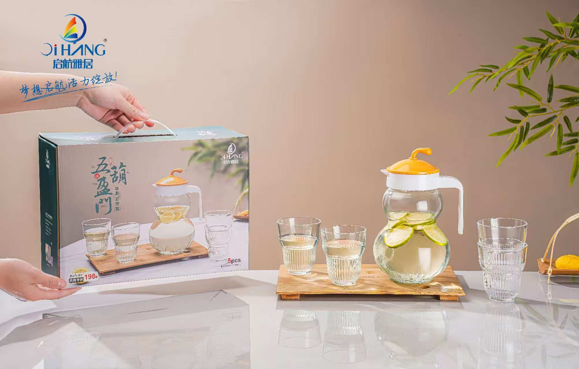 型号 : 五福盈门水具五件套 货号:WFYM-L5 配置:壶1300ml*1+杯220ml*4 材质:玻璃+PP 壶身以传统葫芦造型为灵感,采用流畅的双球曲线设计,上壶象征"天圆",下壶寓意"地方",呼应道家阴阳和谐之美。五葫盈门,“葫”谐音福,将"五福文化"转化为可触摸的生活仪式。通透材质破除传统福文化的沉重感,让吉祥寓意如水般自然流淌于日常,在斟饮往来间完成传统祝福的现代表达。壶身,杯身肌理文络清晰,拿握稳固不打滑,手柄舒适,轻松倒水不手滑。纹理设计质感满满,让人爱不释手