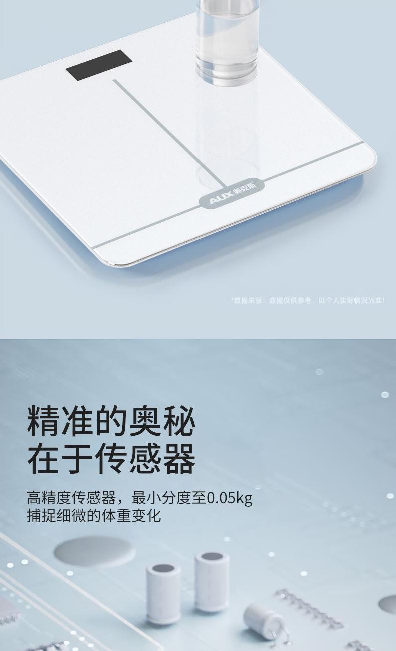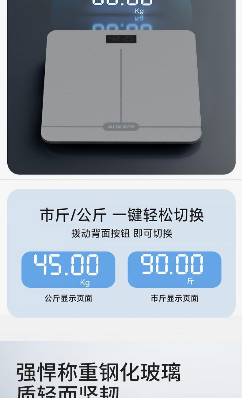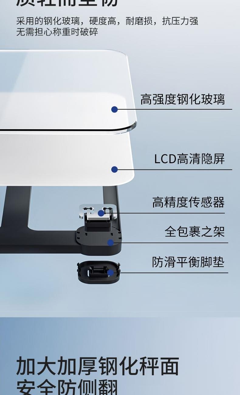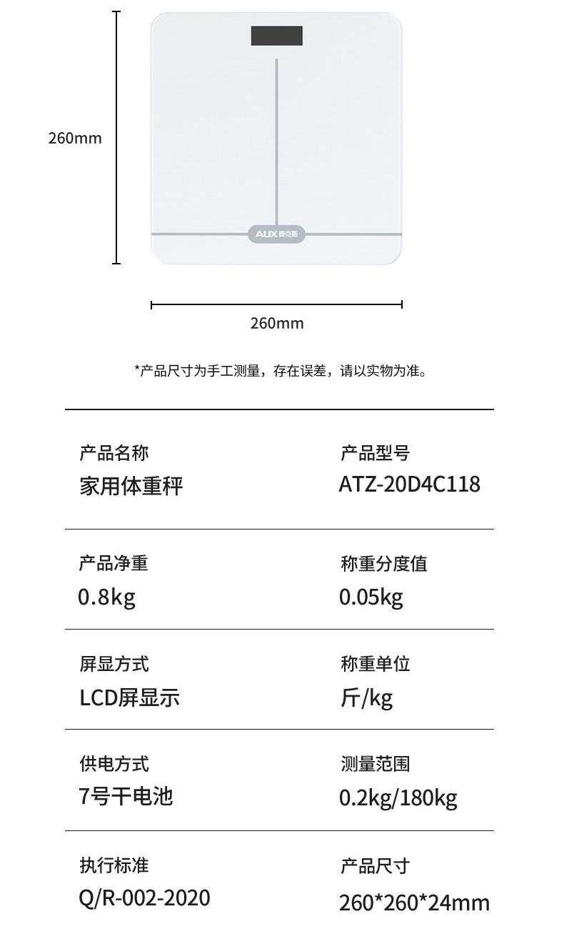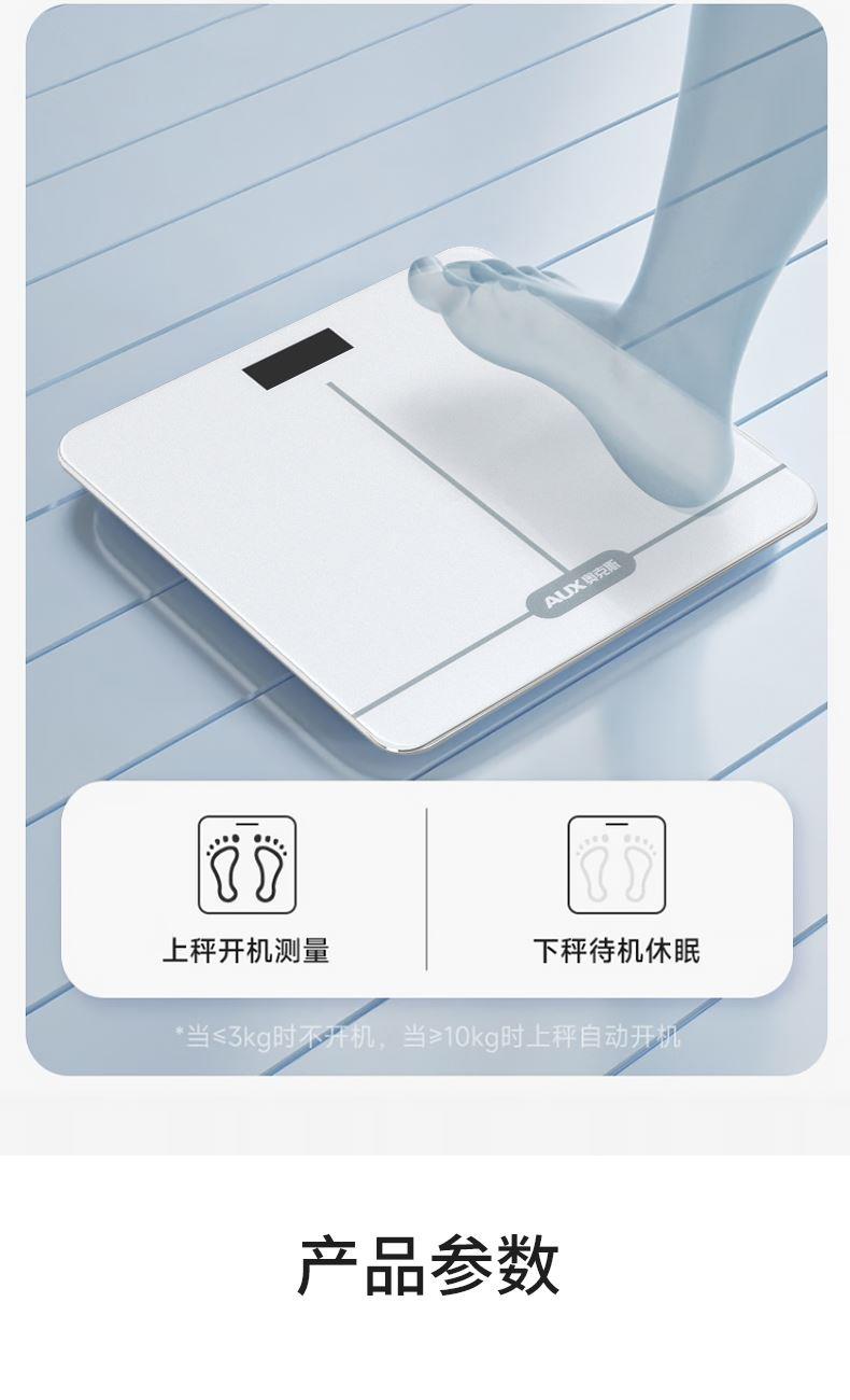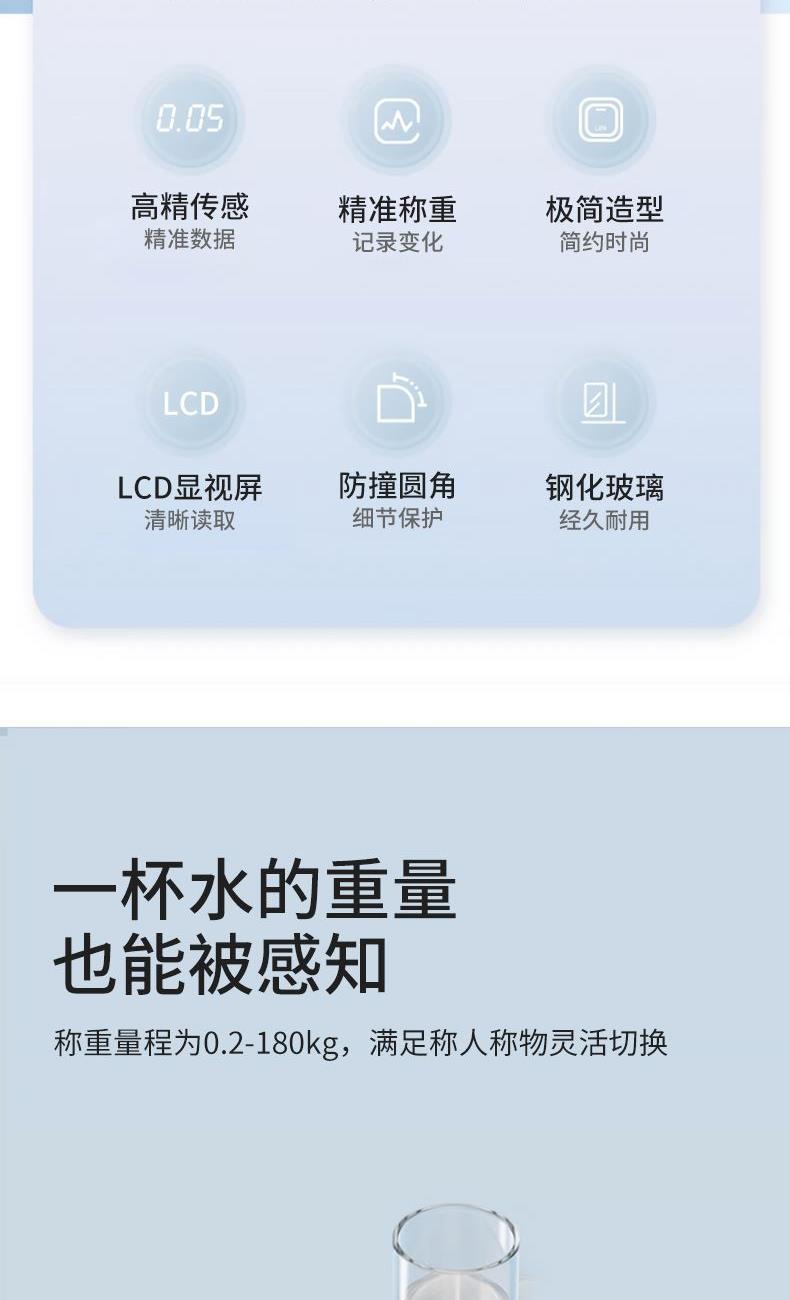 额定输出:3.7V⎓ 分度值:0.05KG 屏幕显示:LCD 可供称重:180kg/360斤 供电方式:2节7号电池 材质:面板钢化玻璃 底座ABS 一杯水的重量也能被感知 市斤/公斤 一键轻松切换 加厚钢化玻璃耐磨抗压 坚固耐用 智能感应开关节能省电 使用方便 LCD高对比度白天不模糊,夜间不刺眼