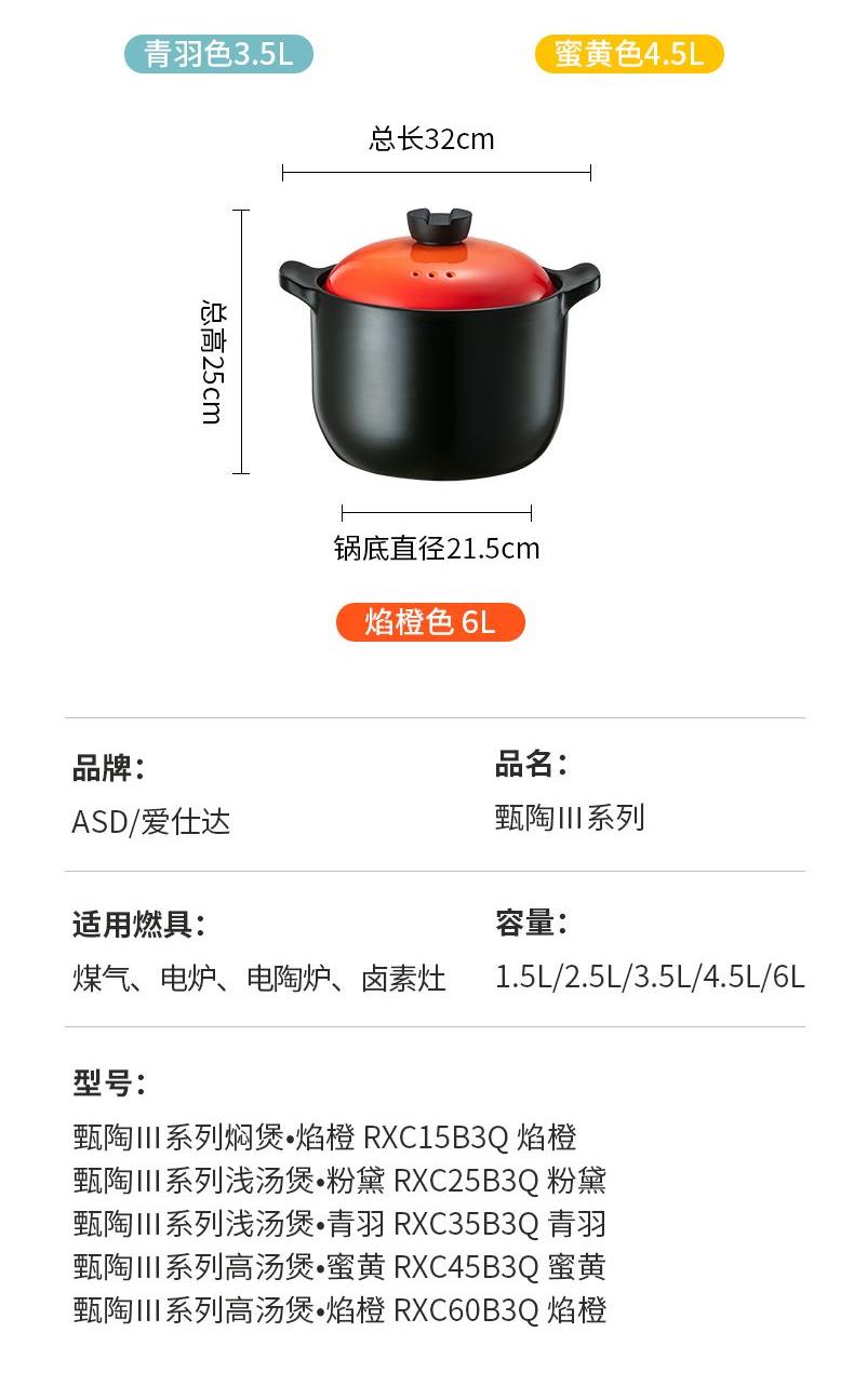 ASD爱仕达甄陶Ⅲ系列高汤煲RXC60B3Q(焰橙)6.0L