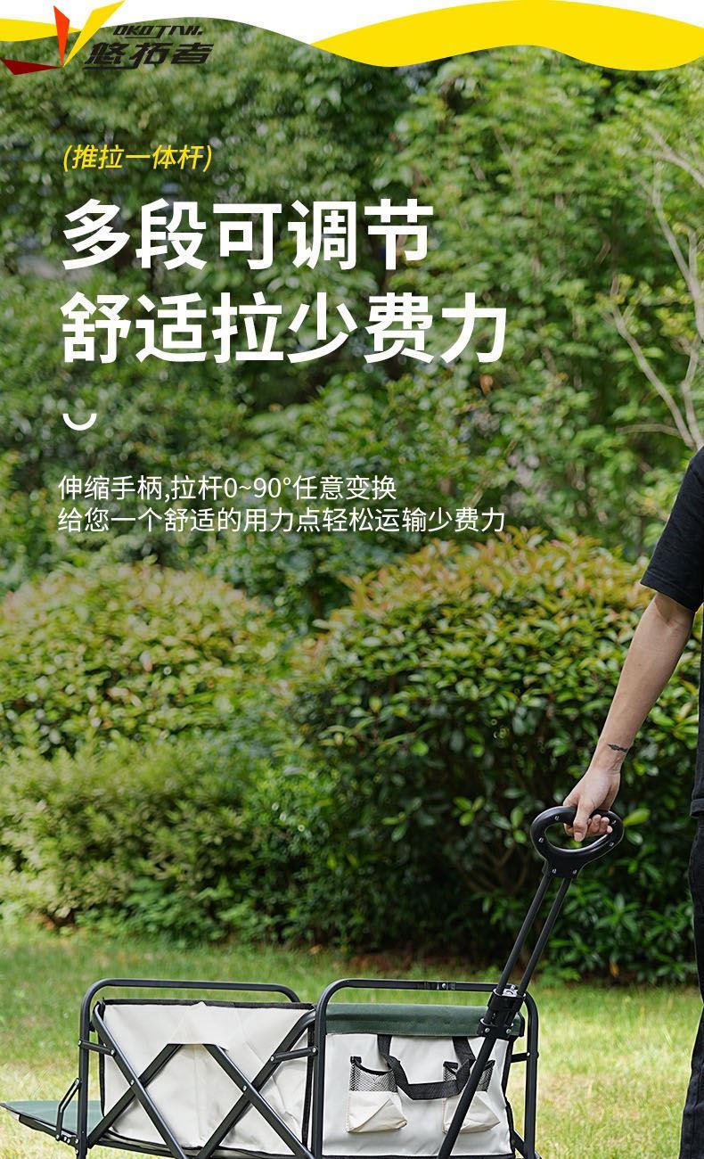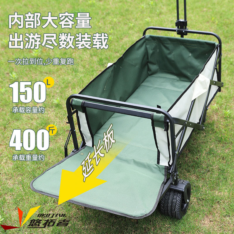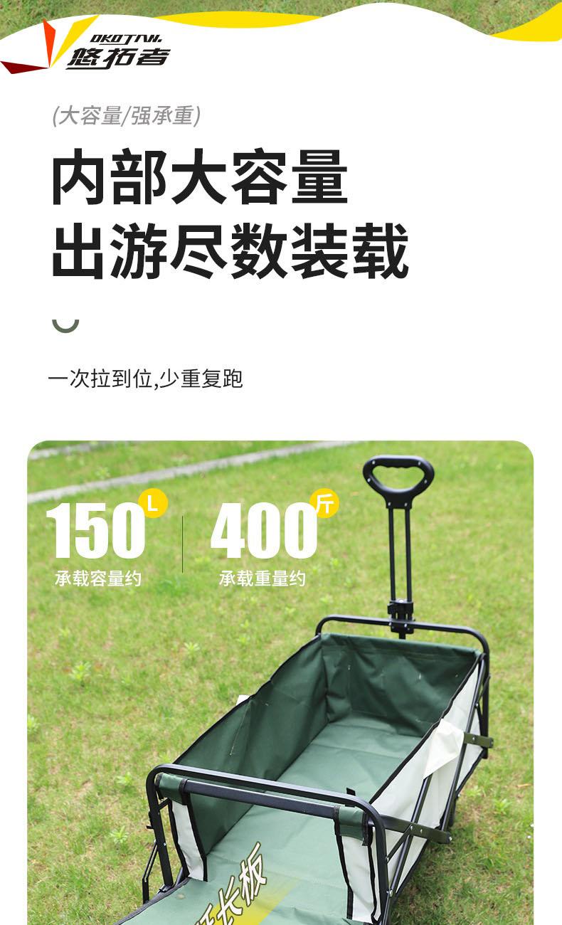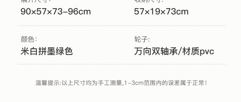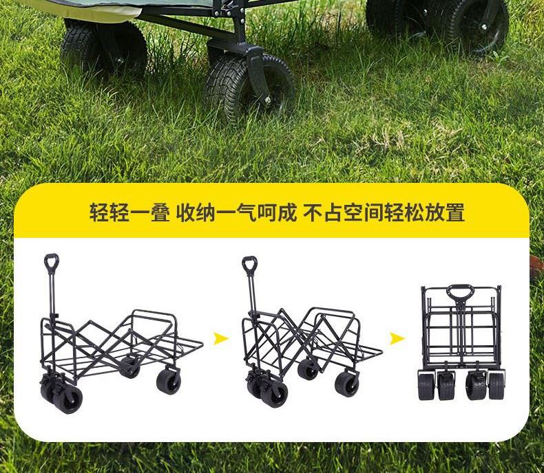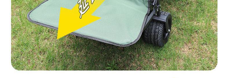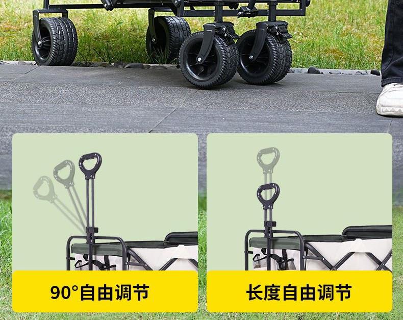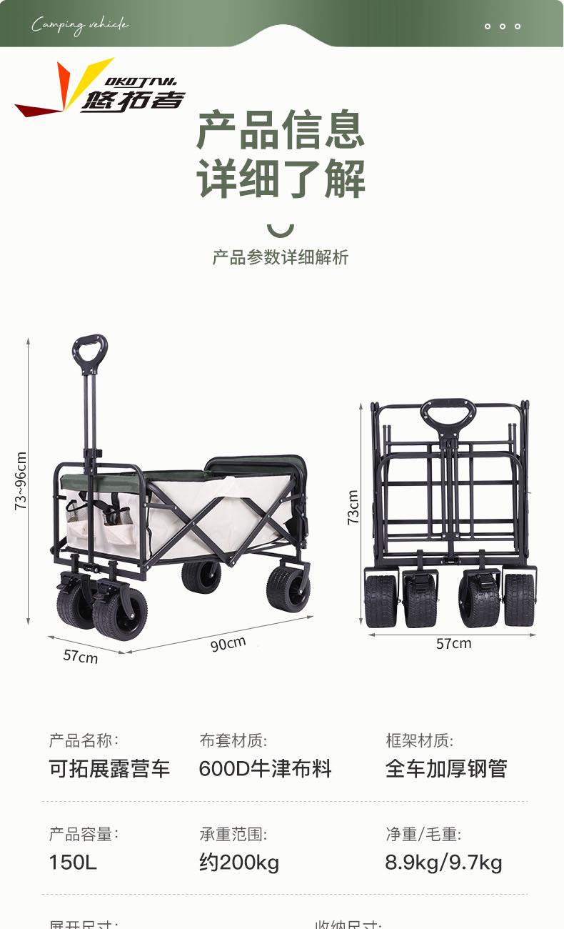 展开尺寸 :90-120*57*73-96cm 布套尺寸 :76*46*27cm 包装尺寸 :57*20*77cm 净重 :8.4kg毛重 :9.6kg ;承重 :200kg 容量 :200L 材质:车身喷塑钢管,面料600D牛津布; 颜色:米色(内绿色) 卖点: 双刹车设计,30°压力转向轴承,越野宽轮,适合各种地形;折叠后开,升级大容量。可调节拉手,收纳方便,适合野营,郊游,钓鱼等户外活动