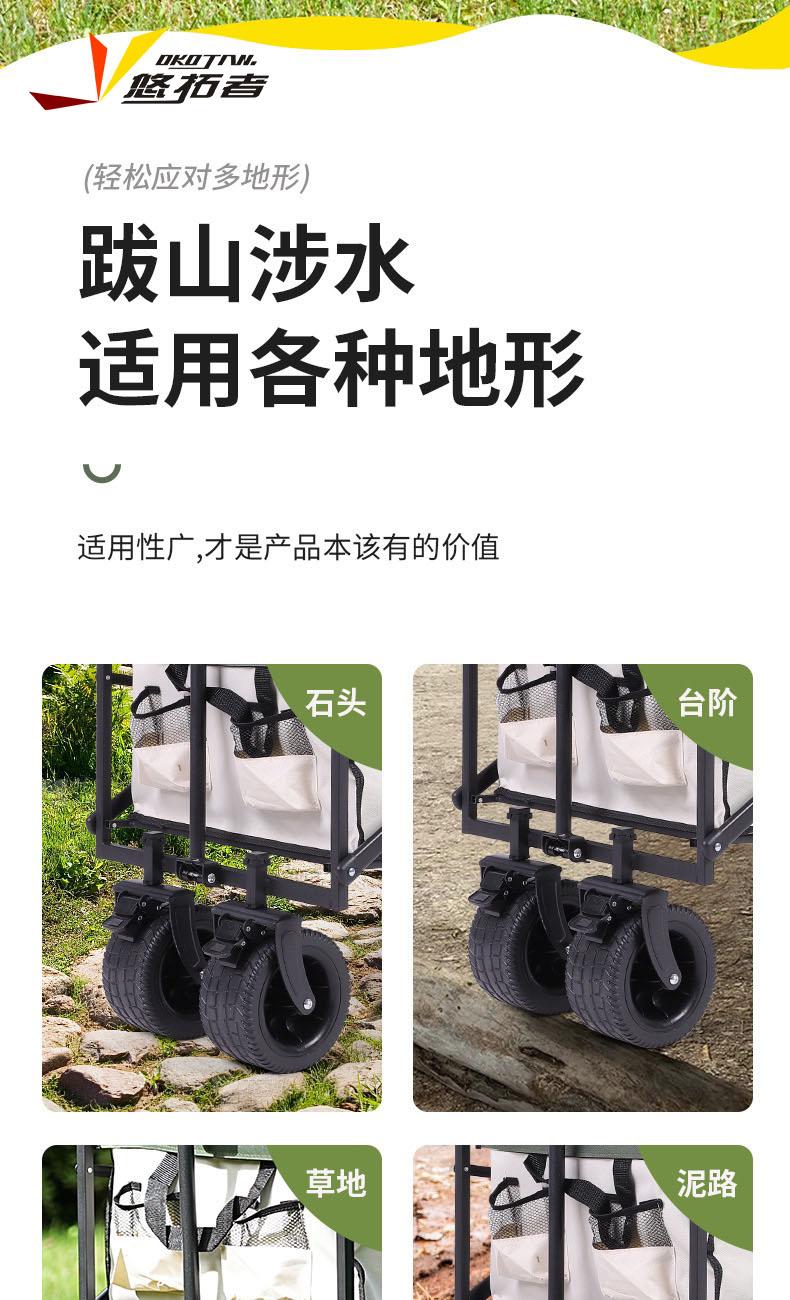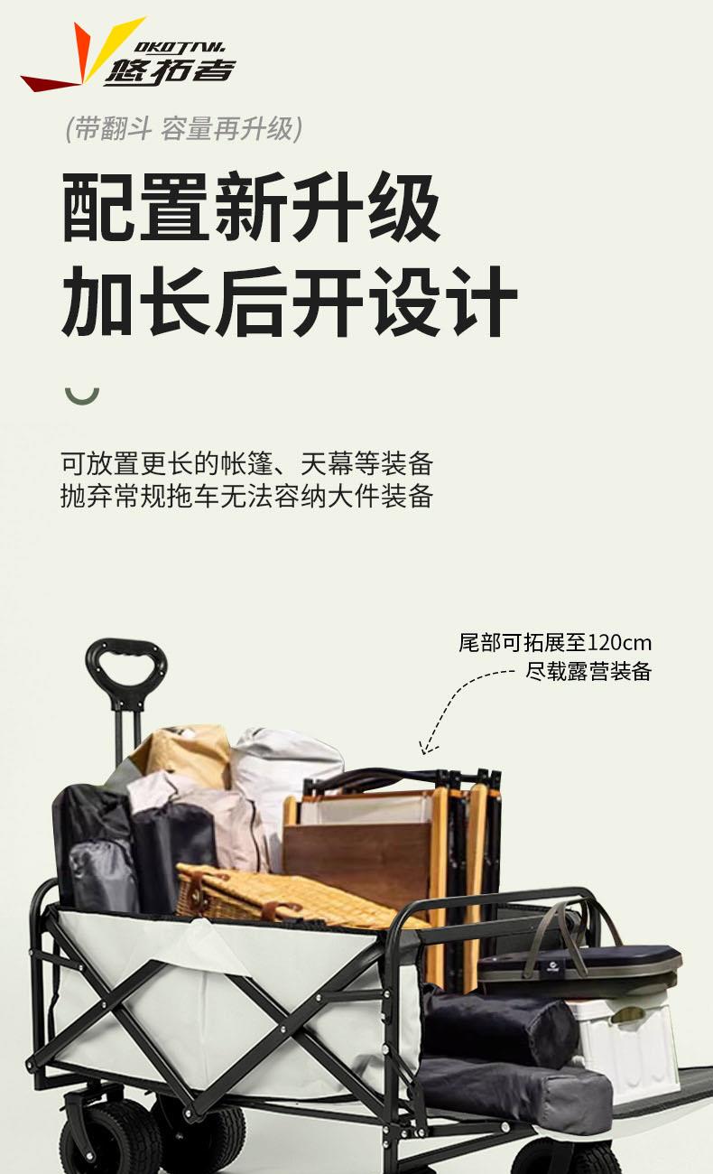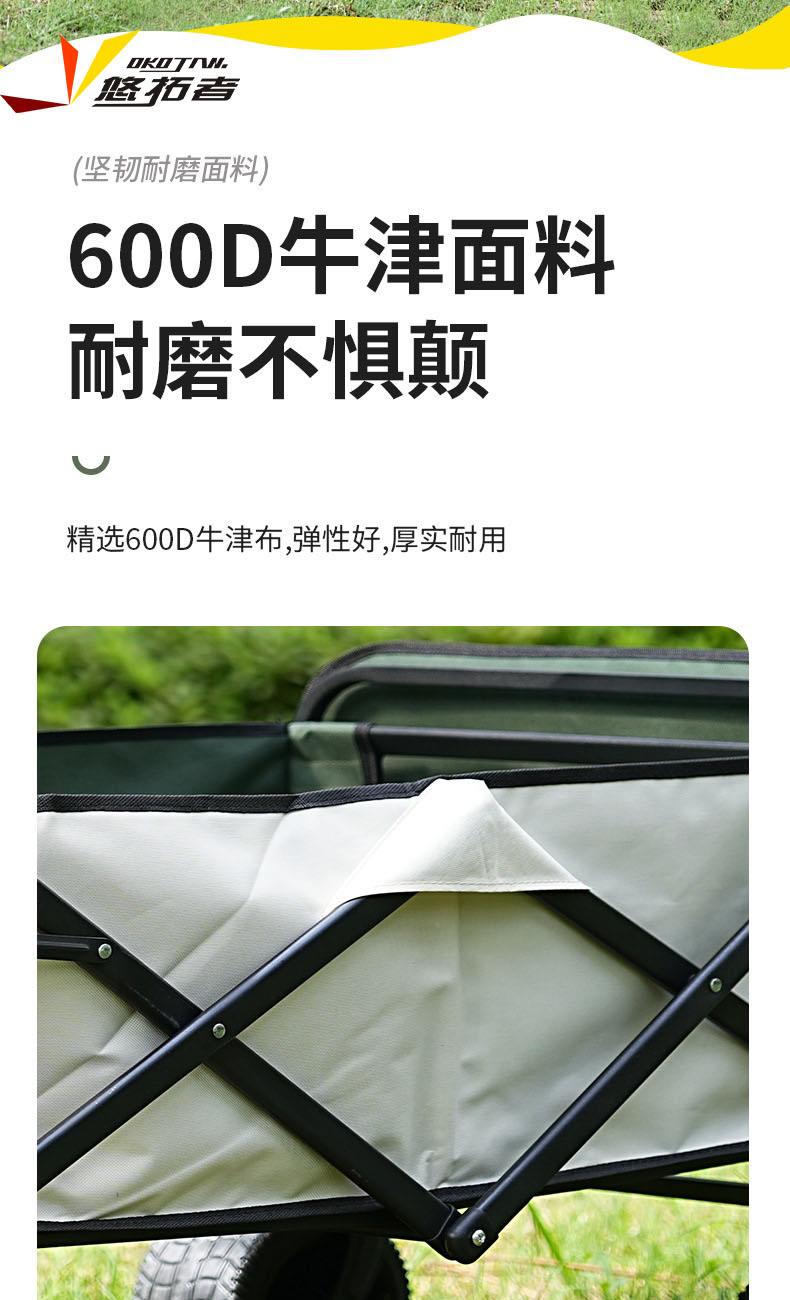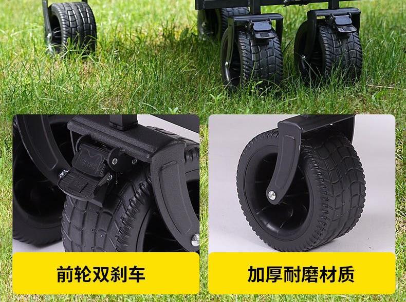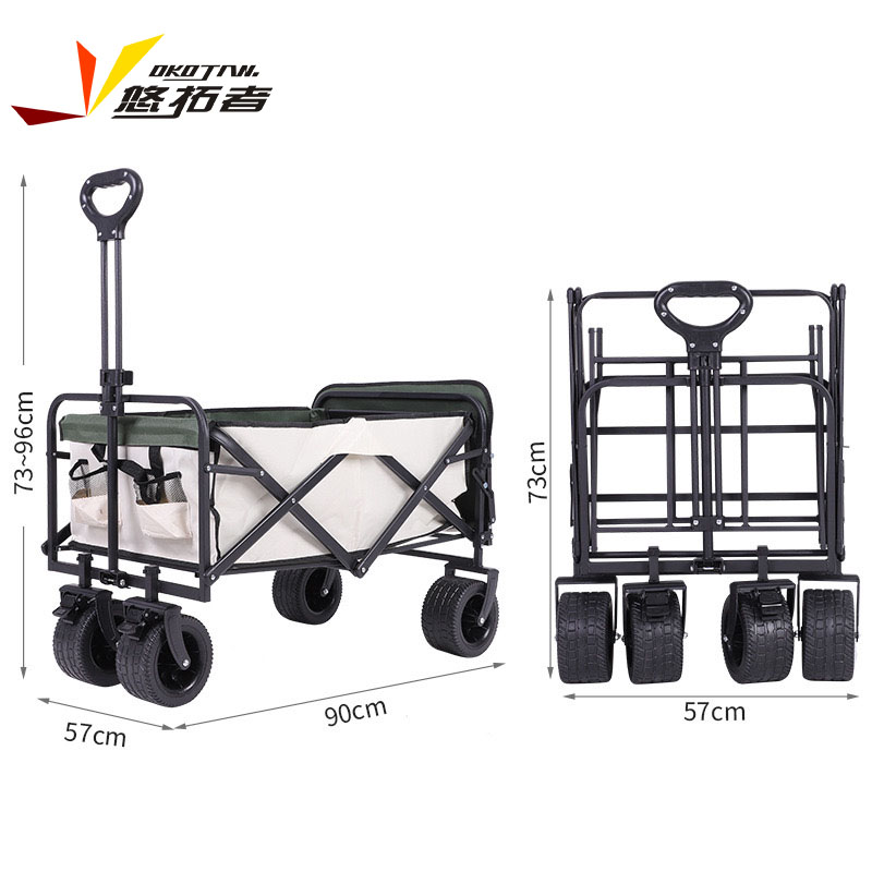 展开尺寸 :90-120*57*73-96cm 布套尺寸 :76*46*27cm 包装尺寸 :57*20*77cm 净重 :8.4kg毛重 :9.6kg ;承重 :200kg 容量 :200L 材质:车身喷塑钢管,面料600D牛津布; 颜色:米色(内绿色) 卖点: 双刹车设计,30°压力转向轴承,越野宽轮,适合各种地形;折叠后开,升级大容量。可调节拉手,收纳方便,适合野营,郊游,钓鱼等户外活动