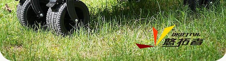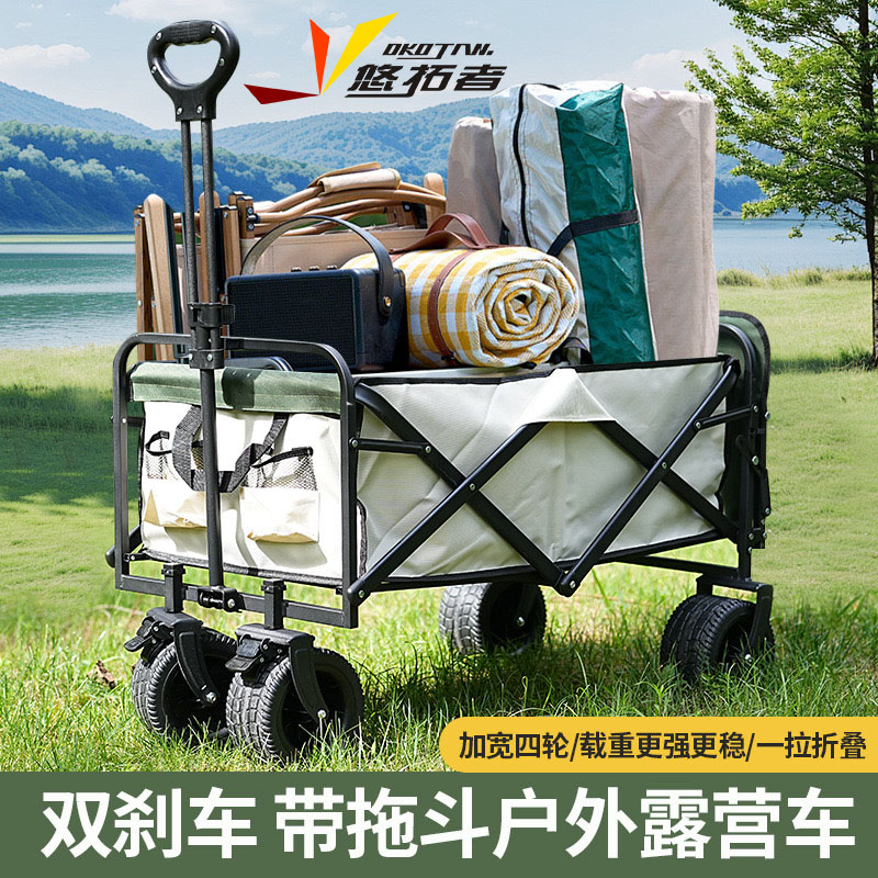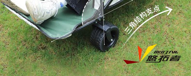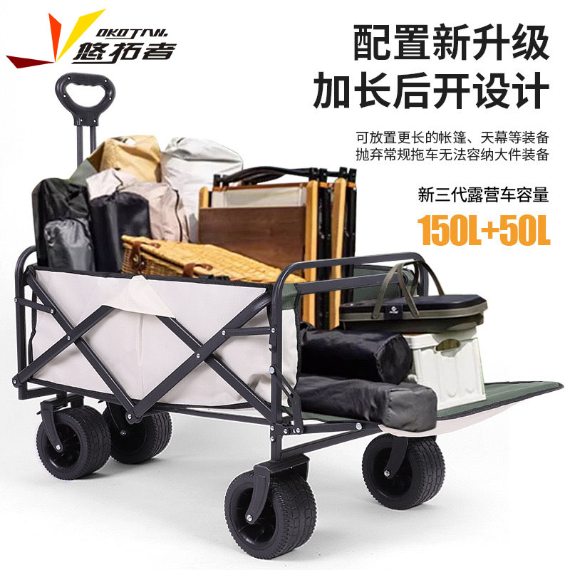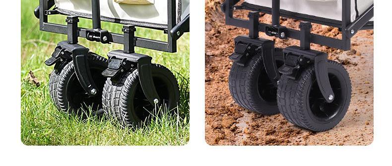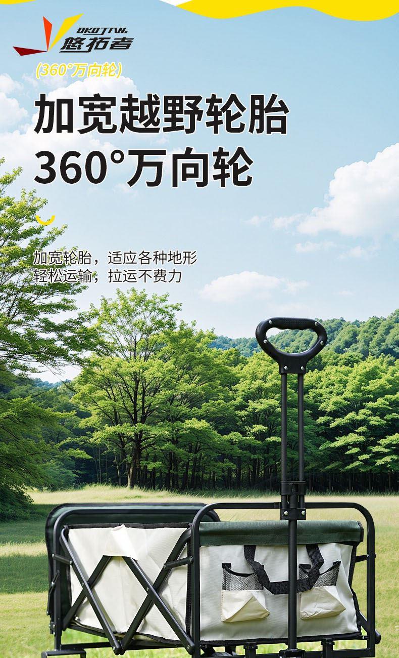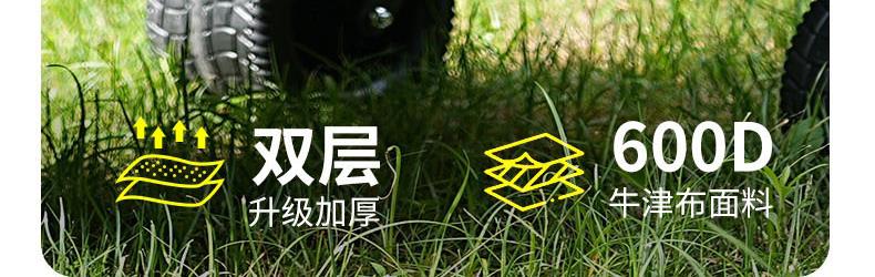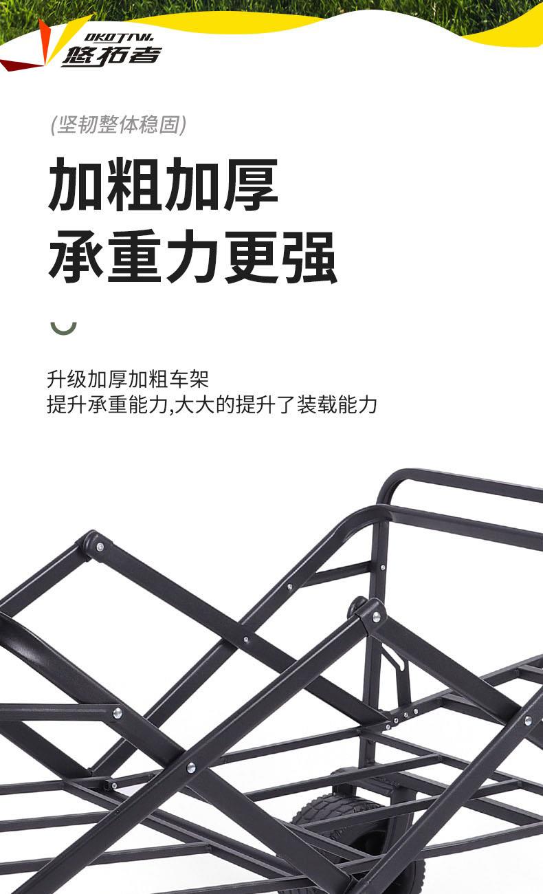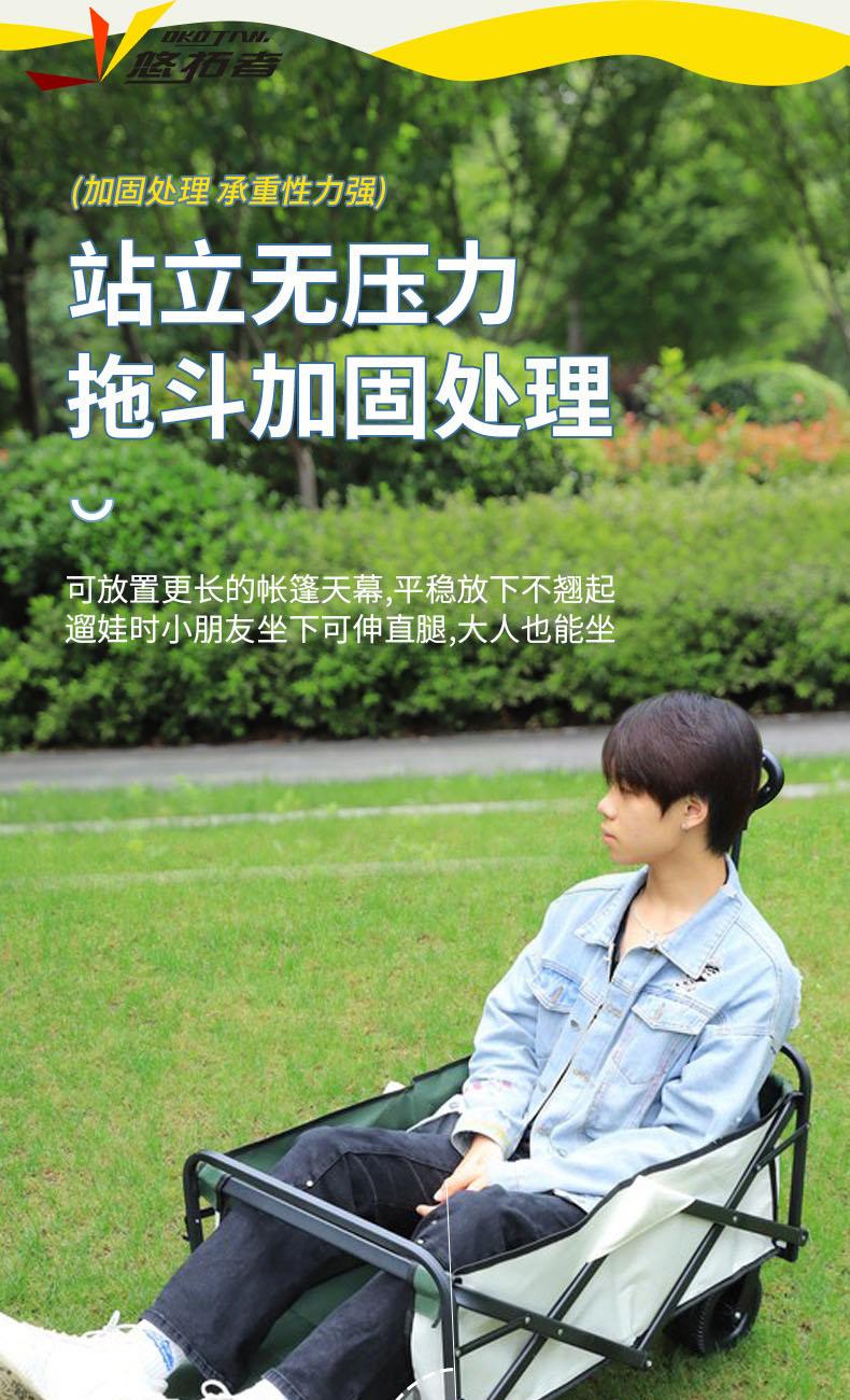 展开尺寸 :90-120*57*73-96cm 布套尺寸 :76*46*27cm 包装尺寸 :57*20*77cm 净重 :8.4kg毛重 :9.6kg ;承重 :200kg 容量 :200L 材质:车身喷塑钢管,面料600D牛津布; 颜色:米色(内绿色) 卖点: 双刹车设计,30°压力转向轴承,越野宽轮,适合各种地形;折叠后开,升级大容量。可调节拉手,收纳方便,适合野营,郊游,钓鱼等户外活动