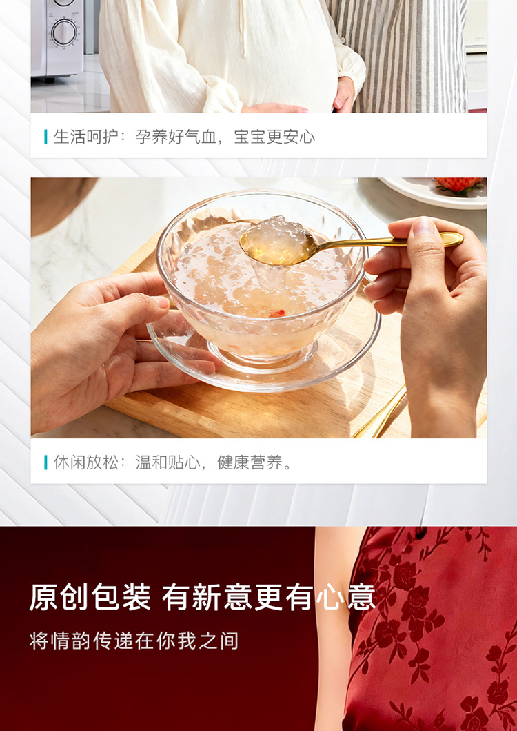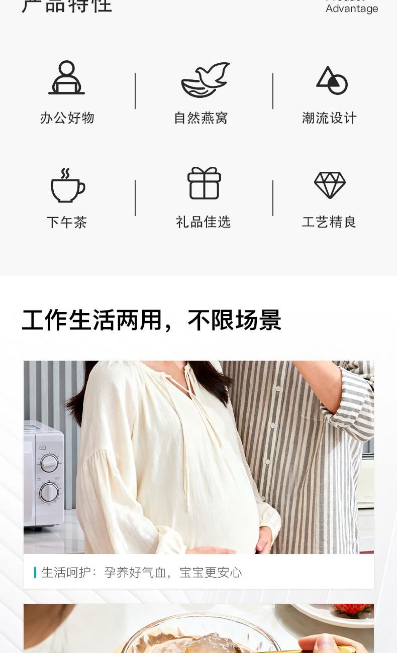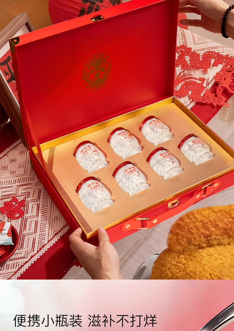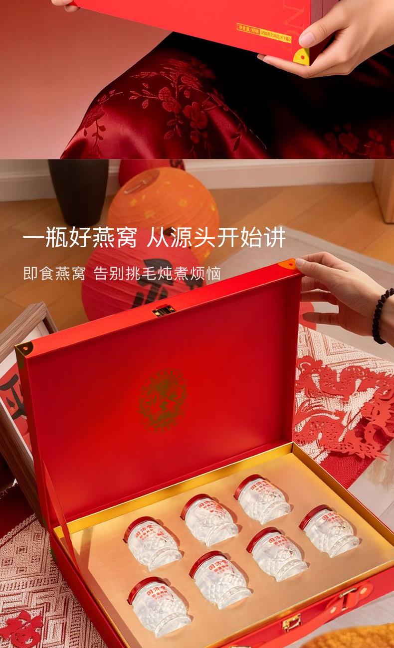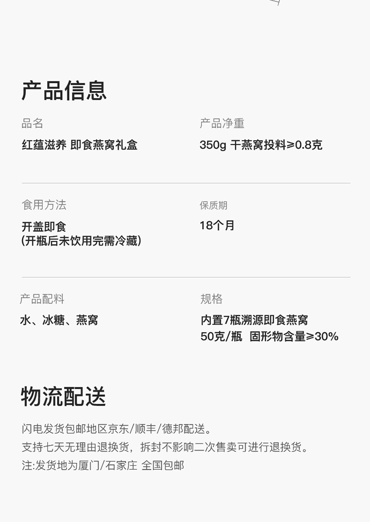 配置:50g*7瓶/盒 固形物含量≥30%/瓶 干燕窝投料≥0.8克/瓶 配料表:水、冰糖、燕窝 食用方法:开盖即食 (开瓶后未饮用完需冷藏保存) 净含量:350克/盒 保质期:18个月 储存方法:存放于通风干燥处