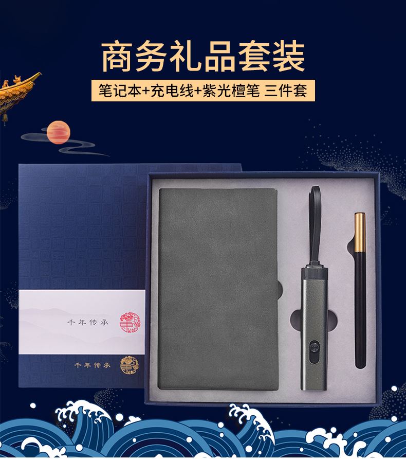 礼盒配置 : 1、A6平装小笔记本 2、一线倾心数据线,小巧便捷、随身携带、快速充电;苹果、安卓、TYPE-C充电接口设计,满足不同机型的充电需求;外观简洁、美观、时尚,尊贵典雅。 3、黄铜紫光檀木笔 4、蓝色包装盒尺寸 : 228*228*35mm 5、蓝色手提袋尺寸 :270*270*55mm 6、重量:约30kg/箱
