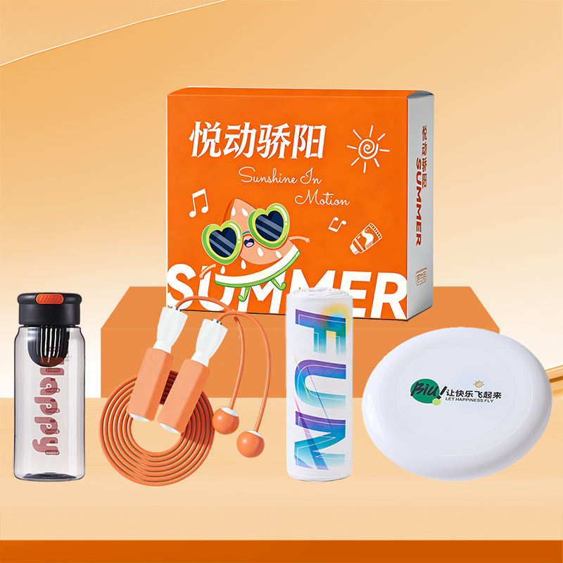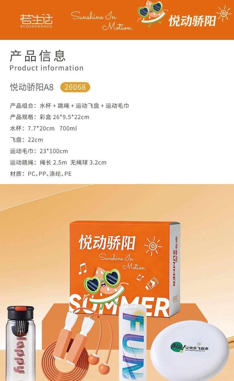 产品组合:水杯+跳绳+运动飞盘+运动毛巾 水杯:7.7*20cm 700ml 飞盘:22cm 运动毛巾:23*100cm 运动跳绳: 绳长2.5m 无绳球3.2cm 材质:PC、PP、涤纶、PE 包装:彩盒
