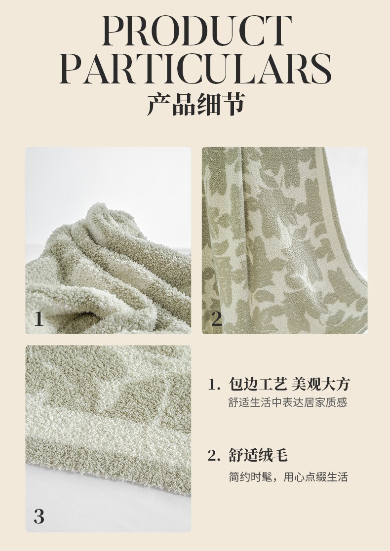 4.长时间使用摩擦,长时间光照, 多次水洗, 沾染汗渍后,均能保持毯子颜色持久如新。越洗越漂亮,久洗不坏; 5.从手感来讲,毯子柔软性好、蓬松感强、面料弹力高, 能快速散热、拒绝闷热 , 既简洁,又耐用;