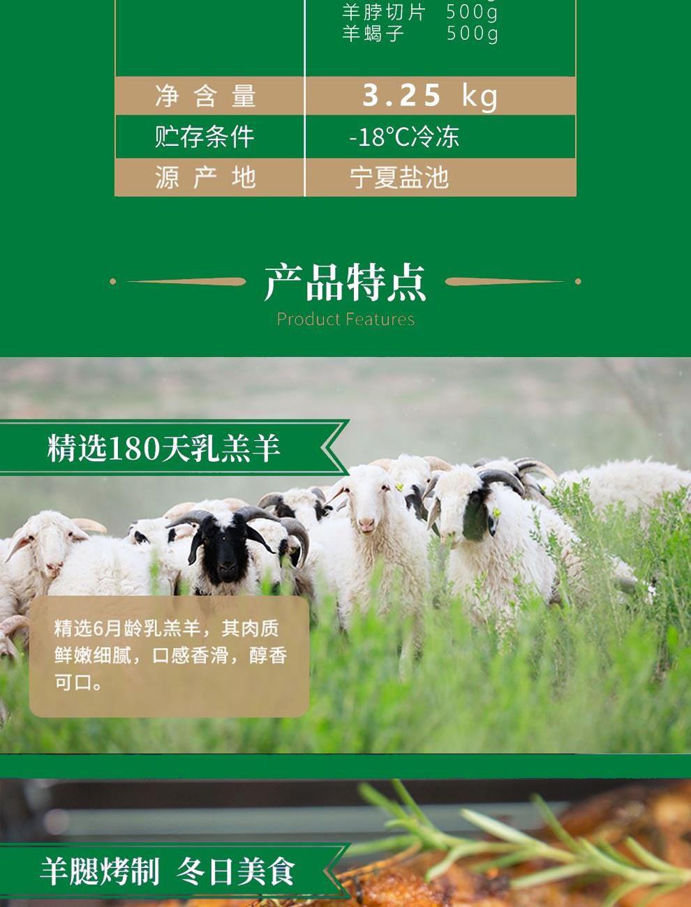 配置: 羊 排 1750g 羊腱子 500g 羊脖切片 500g 羊蝎子 500g 一方水土,养育一方特色滩羊盐池滩羊食百草 “吃中草药 (甘草、苦豆子)喝弱碱水"长大的羊。 中和体内酸性,使得肉质鲜嫩细腻,脂肪分布均匀原切滩羊羊肉不腥不膻。 宁夏盐池县 自然环境优异,气候冬长夏短 日照充足, 土地呈盐碱化,使得水源呈弱碱性, 盐池草原呈半沙漠化,其中含名贵中草药约110种左右 新鲜屠宰,保证肉质鲜美!