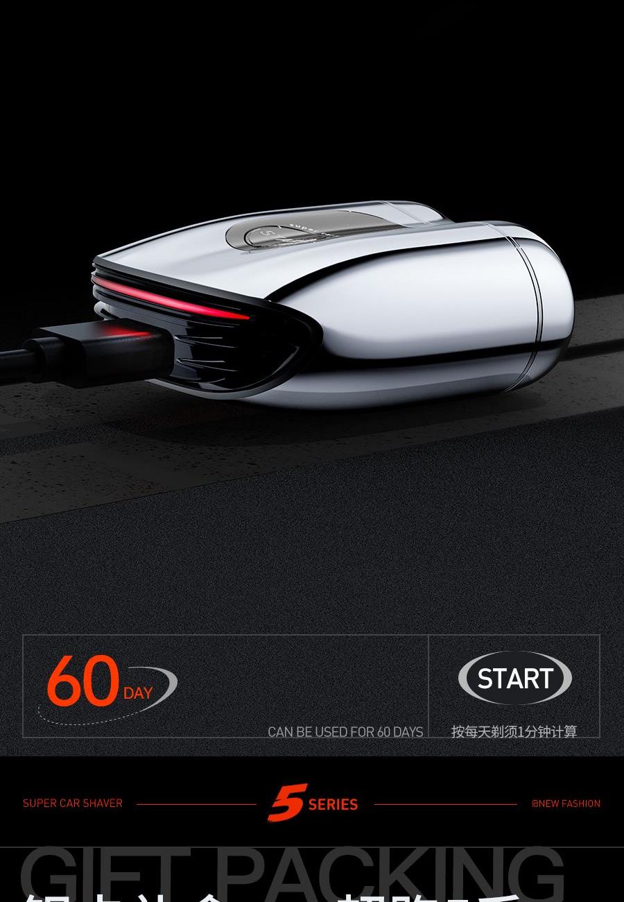 电机转速:9000转/min 机身材质:锌合金 刀头材质:精钢 刀头数量:2个 产品尺寸:长74mm;宽54mm;高30mm 产品净重:0.17kg 电压:5V 防水等级:IPX7,可全身水洗 充电时间:1小时快充 续航:60天 1、设计精致小巧,超高颜值,轻松随行; 2、电镀合金机身,溜背流线型设计,贯穿式尾灯; 3、双环弧面刀网,3D浮动刀头; 4、8000转高速静噪电机,够性能才够快; 5、54组双层刀片, 顺滑贴肤,干湿两剃; 6、IPX7级防水等级,可全身水洗;