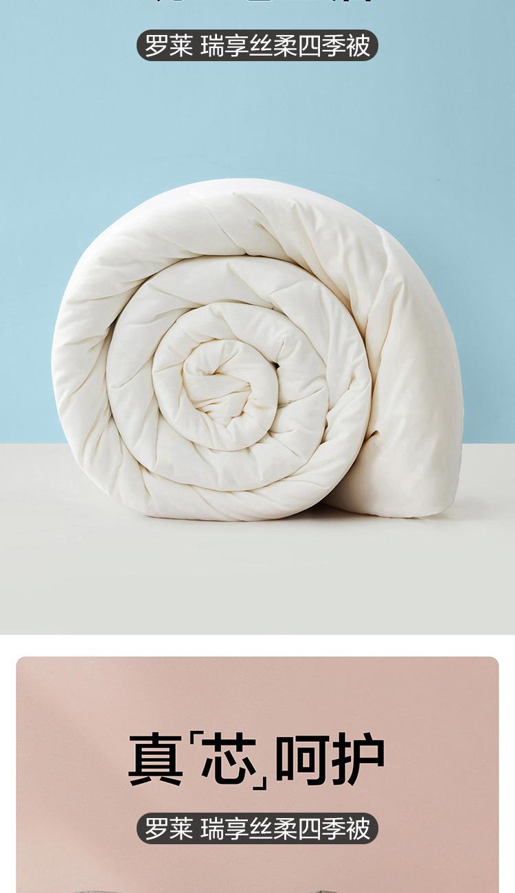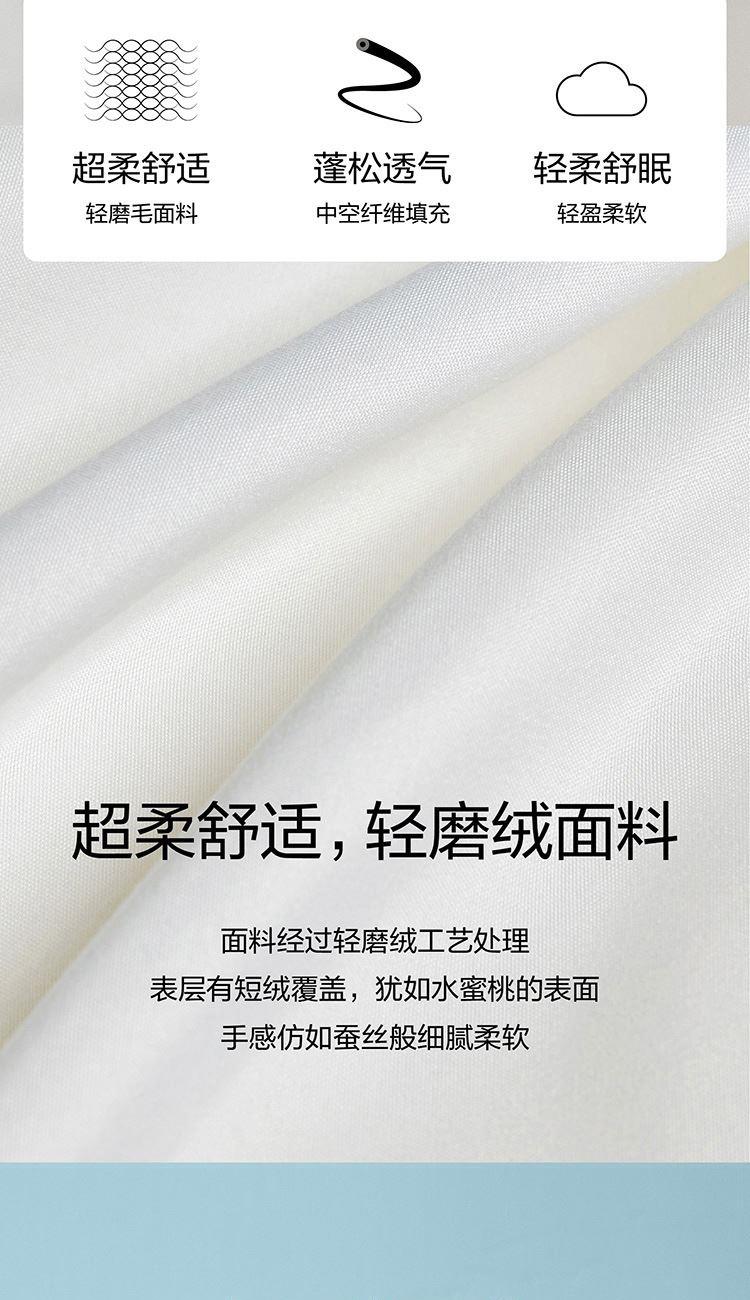 面料材质:聚酯纤维 填充材质:聚酯纤维 规格尺寸:200*230cm 填充重量:800g 外箱尺寸: 55*65*120cm 采用桃皮绒磨毛压花面料,表面附有细密的绒毛,手感绵密,亲肤舒适; 可迅速排湿;此外中空结构减少了纤维20%的重量,被芯保持轻柔且在挤压后纤维不易纠缠打结,更加蓬松,即便长期使用,也能保持良好的回弹性,带来舒柔温暖的睡眠体验。