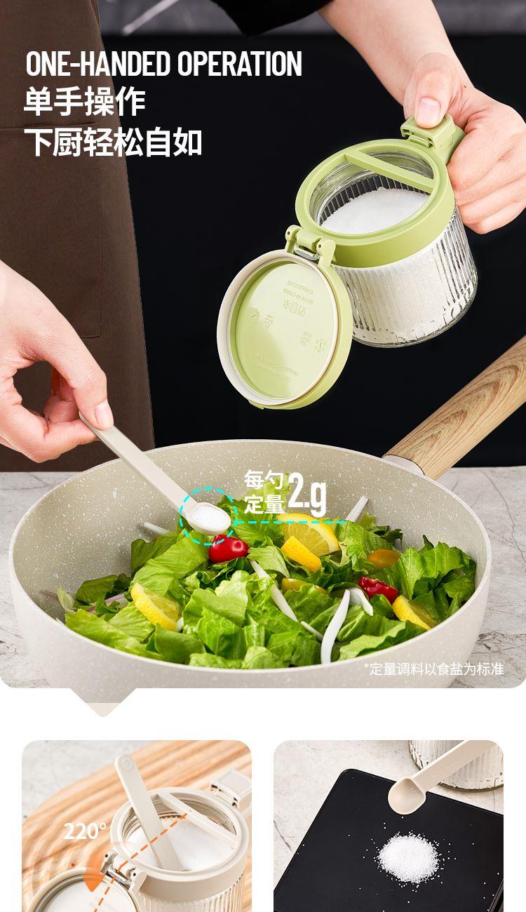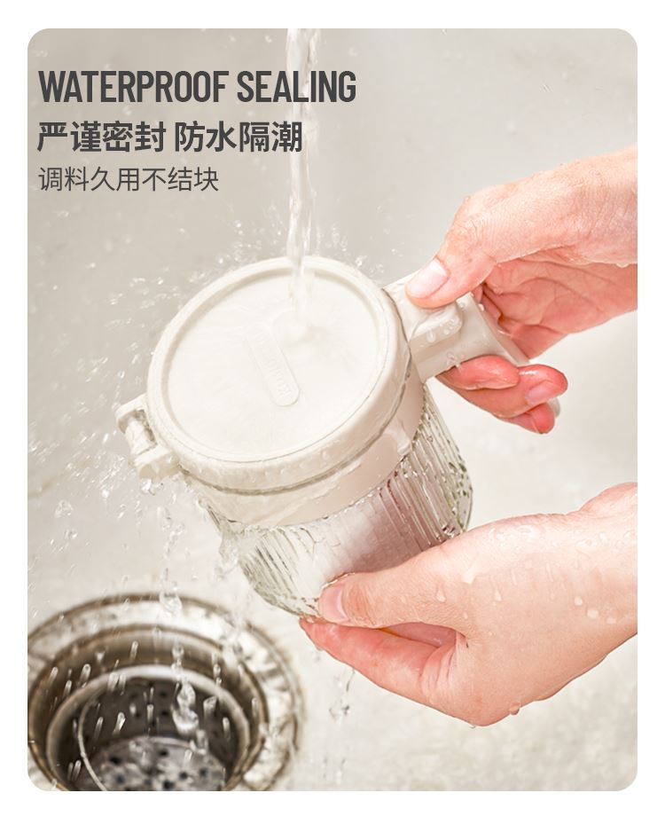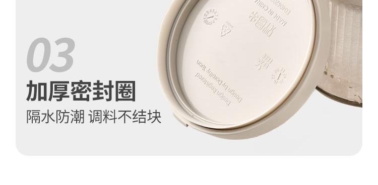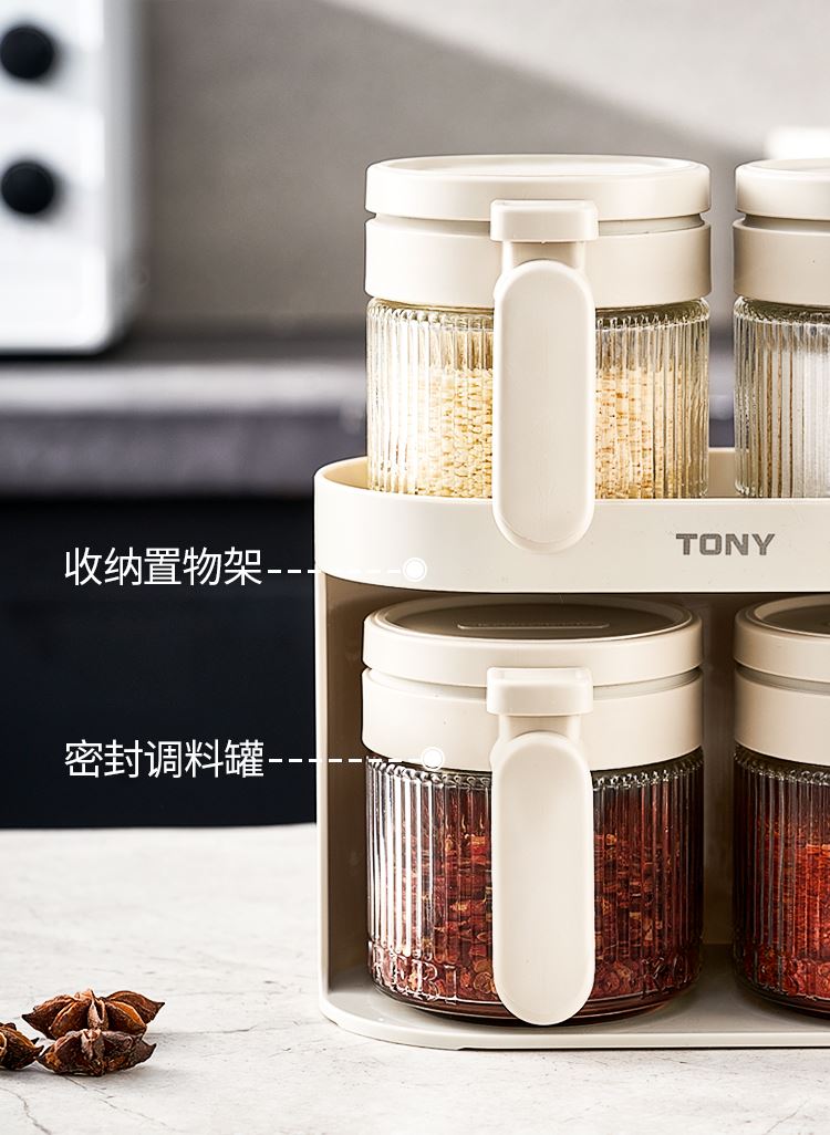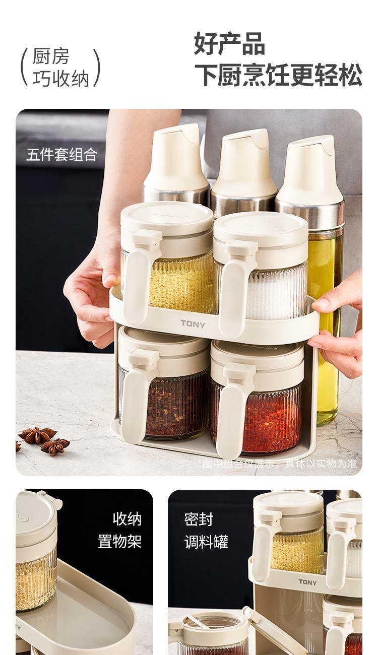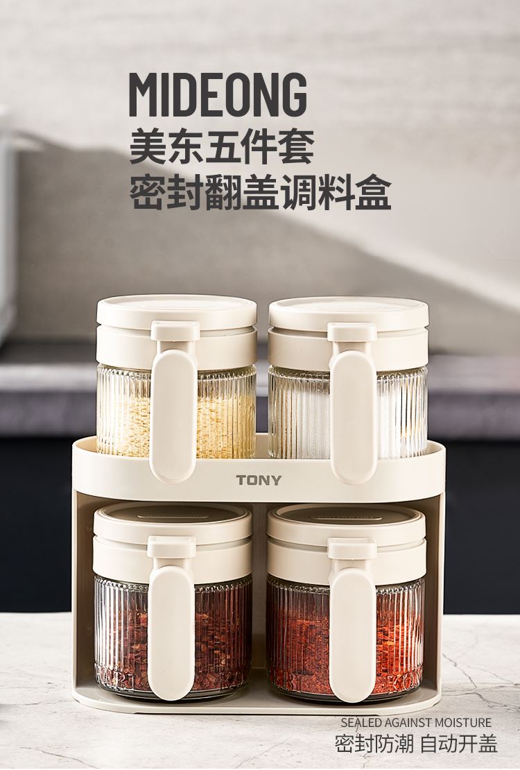 美东五件套密封翻盖调料盒 收纳置物架+4个密封调料罐 内外兼修好产品好结构 PP盖子+加厚硅胶圈+定量勺子+钠钙玻璃 每日2g,定量精致生活,防滑手握处理 超强密封无惧回南天,调料不受潮不结块强密封 加厚硅胶圈。防护瓶内的调料