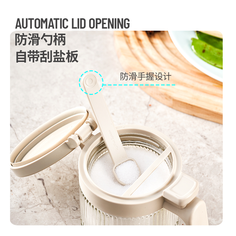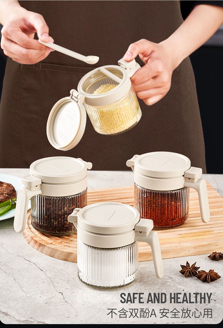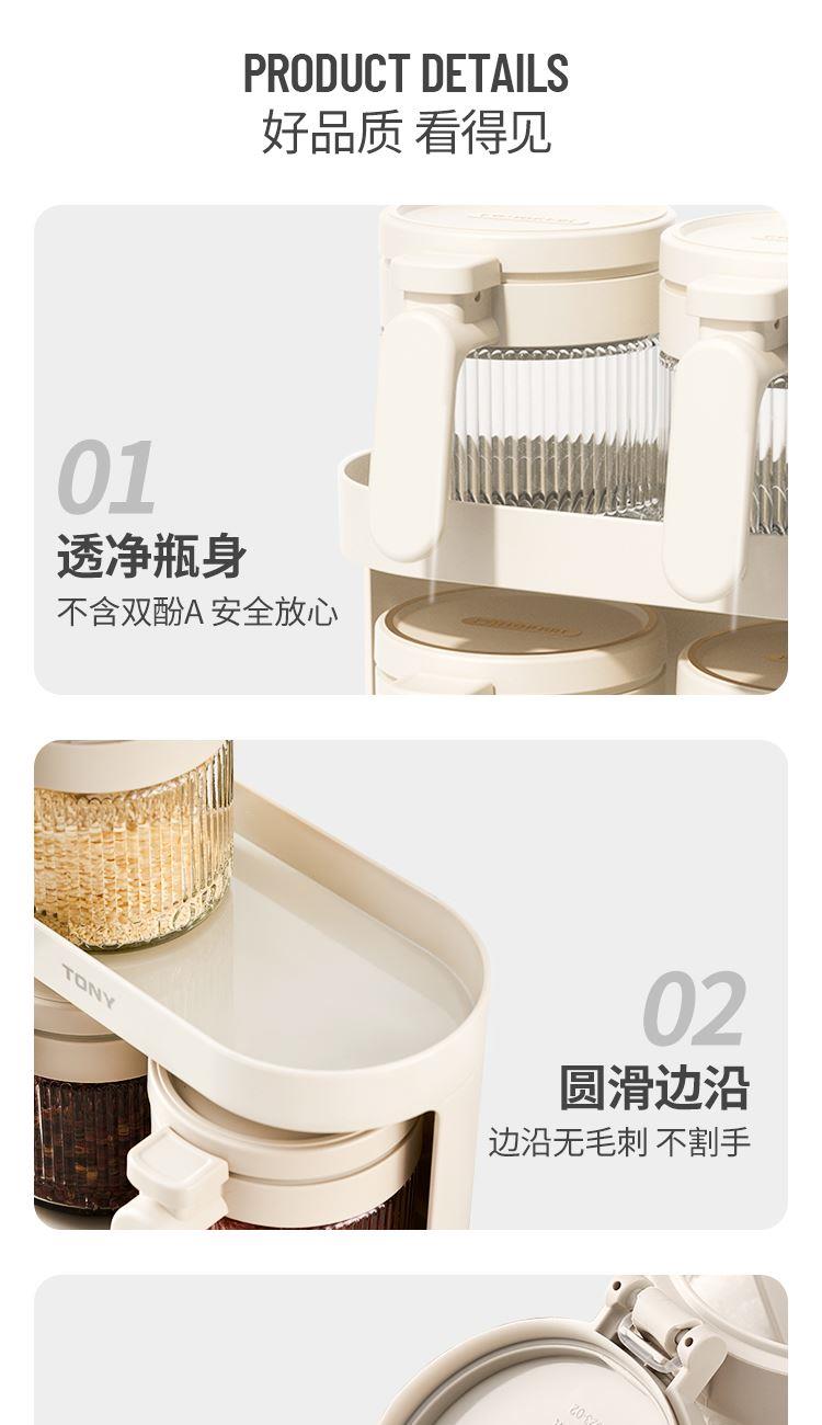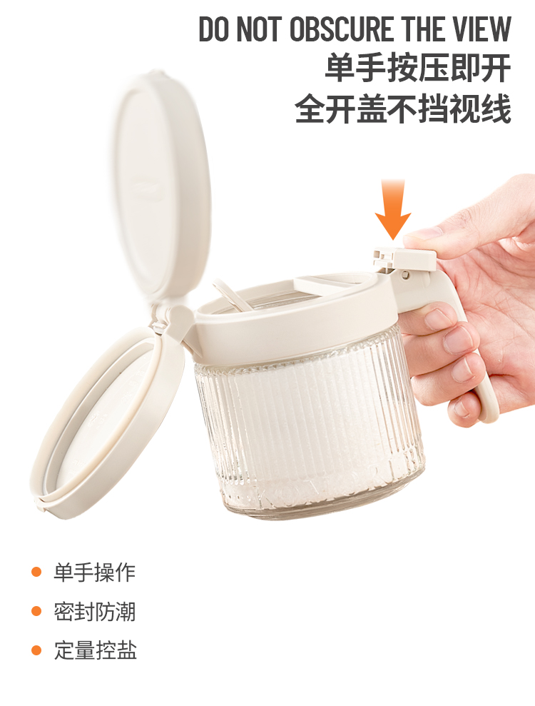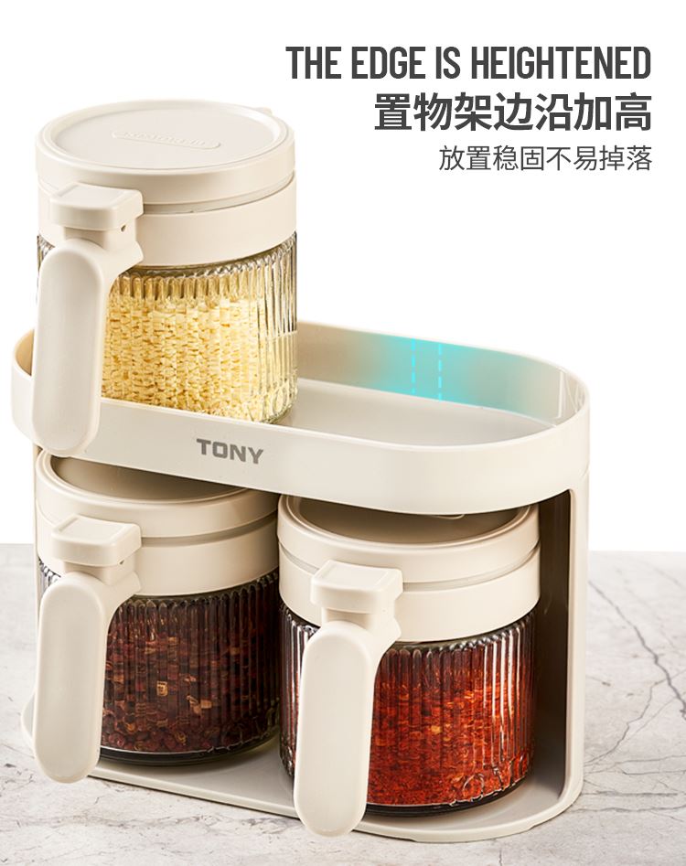 美东五件套密封翻盖调料盒 收纳置物架+4个密封调料罐 内外兼修好产品好结构 PP盖子+加厚硅胶圈+定量勺子+钠钙玻璃 每日2g,定量精致生活,防滑手握处理 超强密封无惧回南天,调料不受潮不结块强密封 加厚硅胶圈。防护瓶内的调料