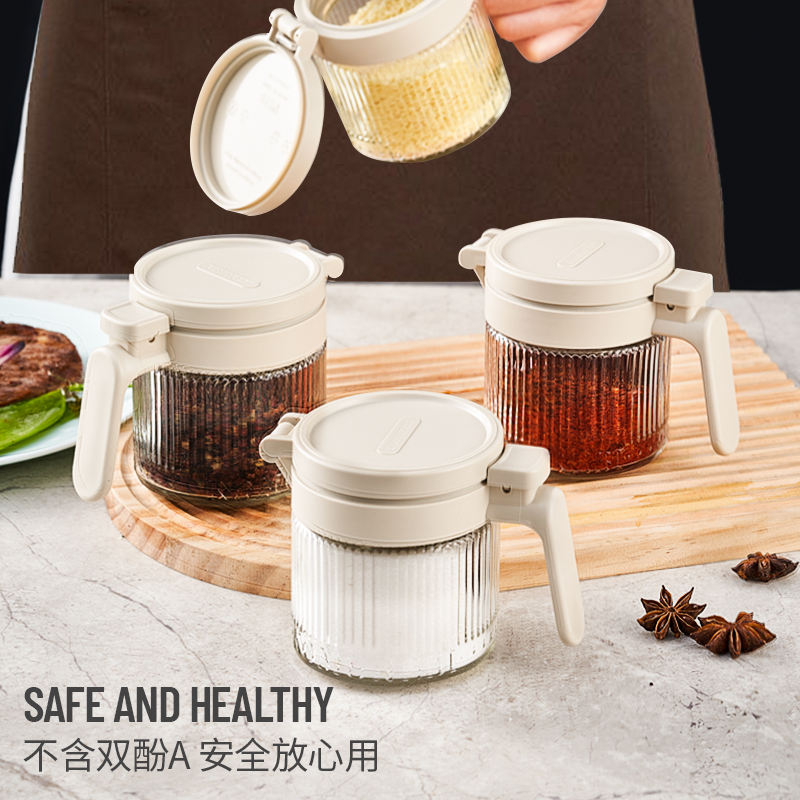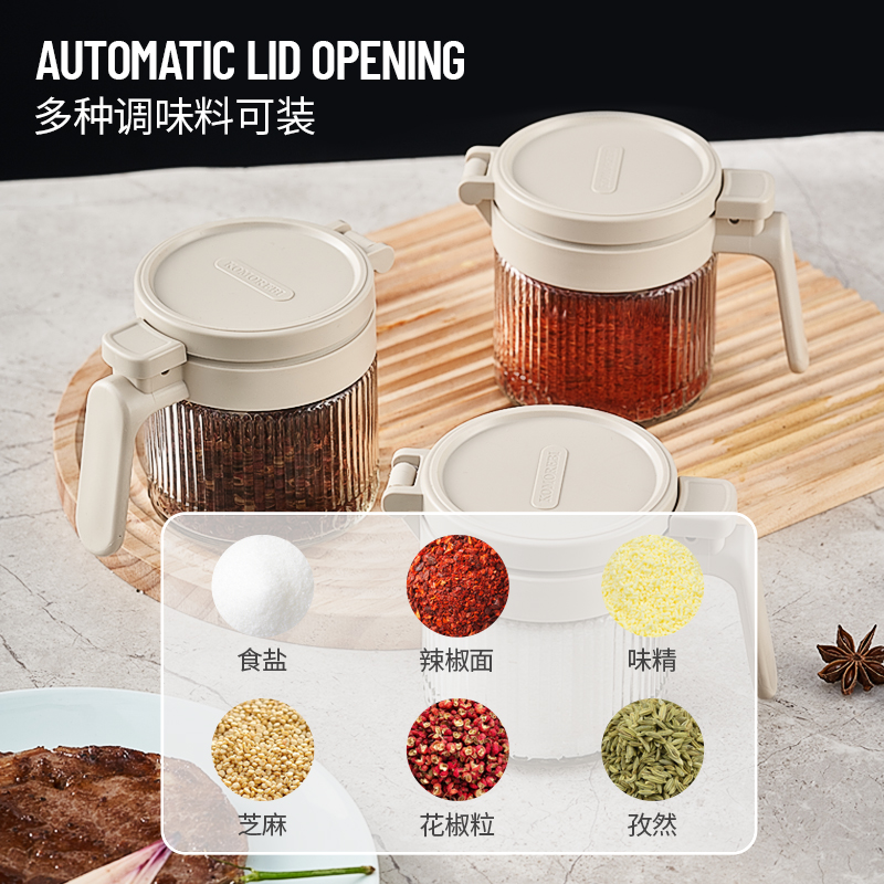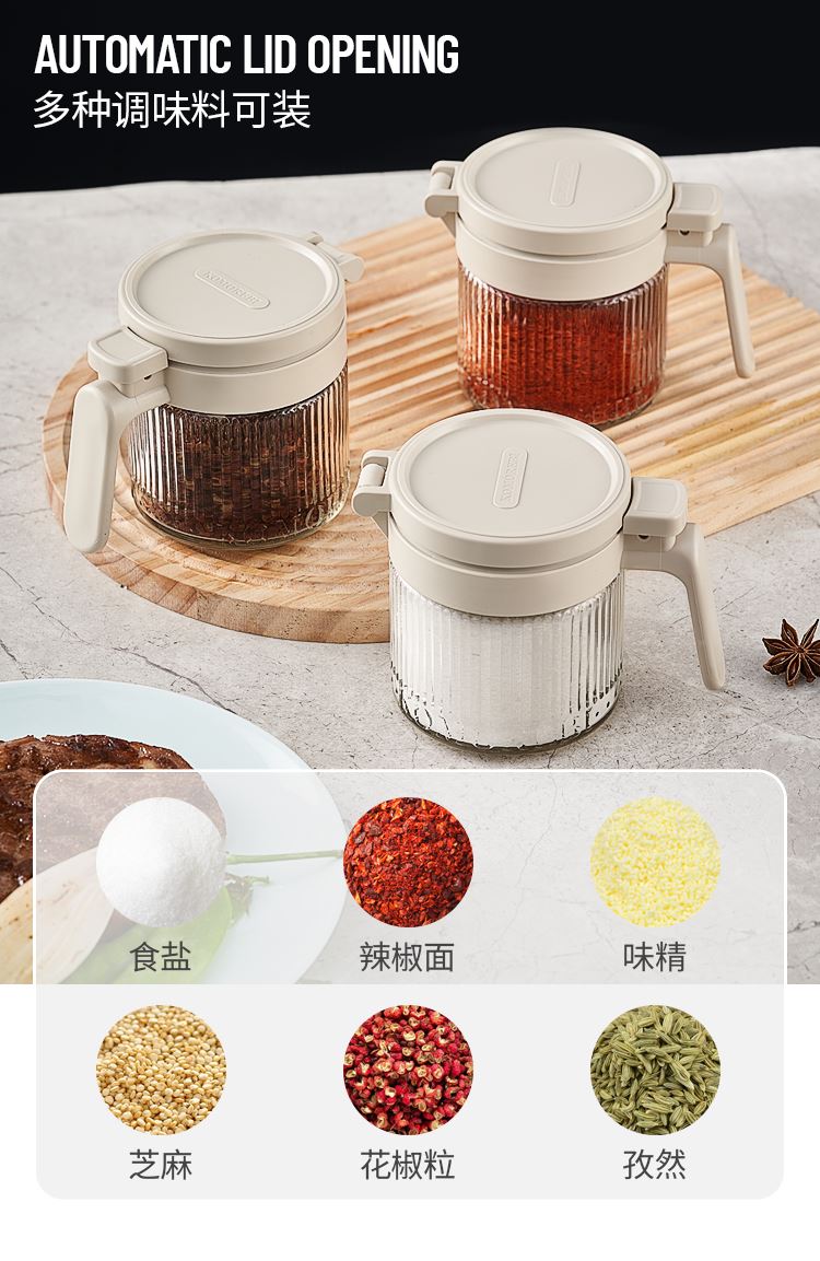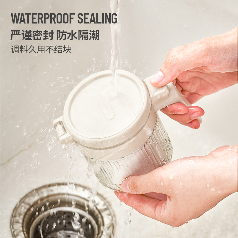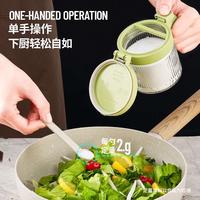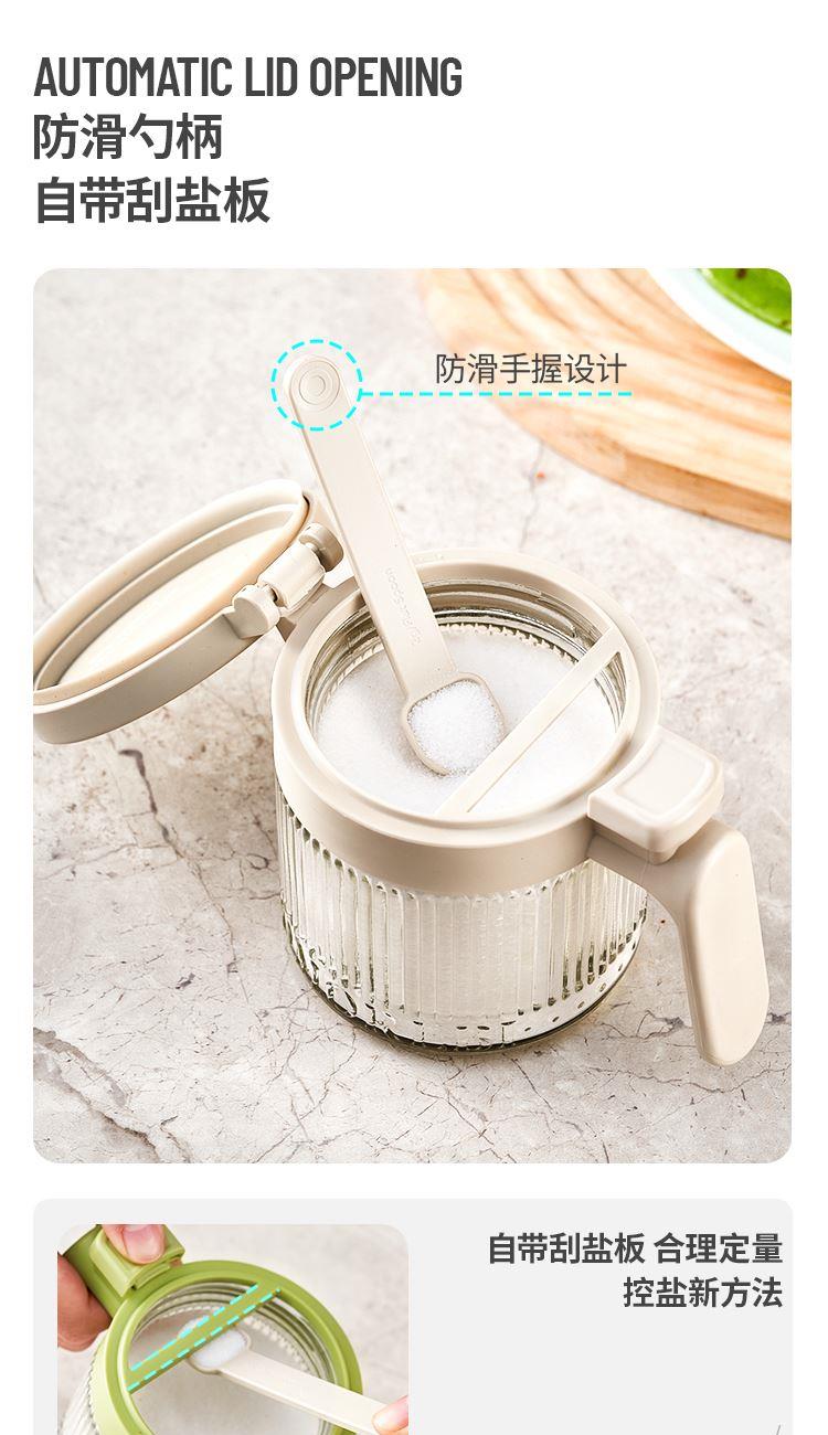 美东五件套密封翻盖调料盒 收纳置物架+4个密封调料罐 内外兼修好产品好结构 PP盖子+加厚硅胶圈+定量勺子+钠钙玻璃 每日2g,定量精致生活,防滑手握处理 超强密封无惧回南天,调料不受潮不结块强密封 加厚硅胶圈。防护瓶内的调料