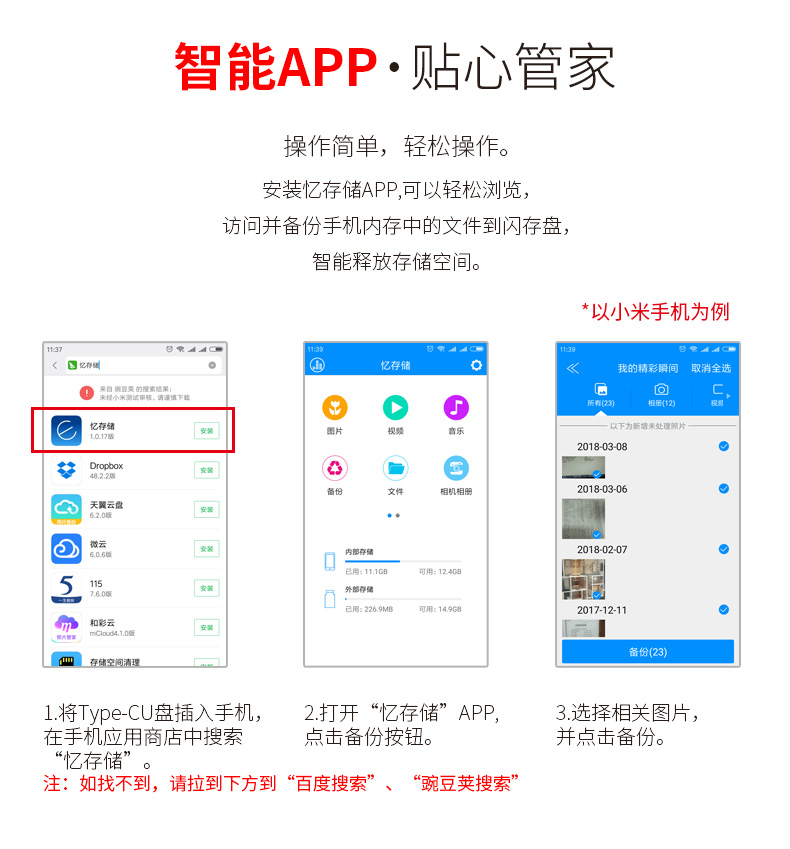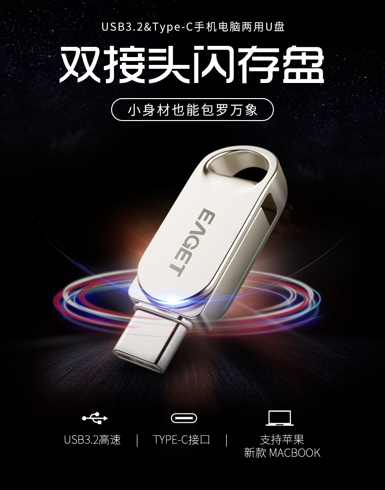 USB3.2 Type-c 双接口 全金属设计,质感超群 小巧便携,个性化设计 安全防水 防震性强 手机、电脑硬盘两用广泛兼容性 360°钢环挂钩,轻松切换 产品尺寸:约36.5*12.2*7.5mm 包装尺寸:11.3*9*cm 单品重量:6.8g