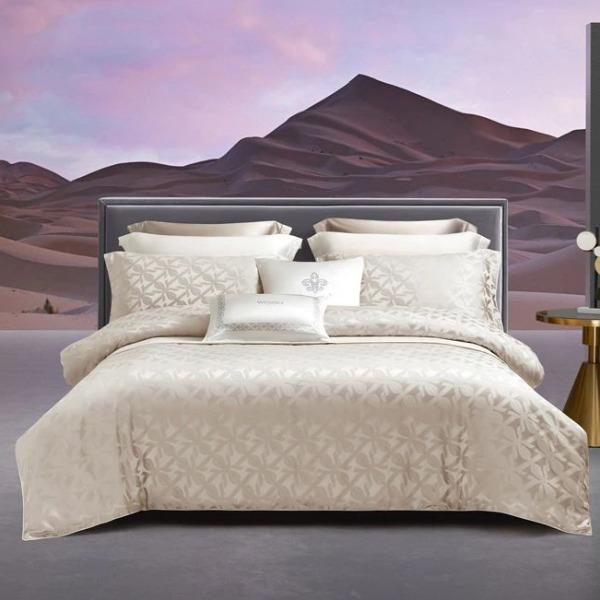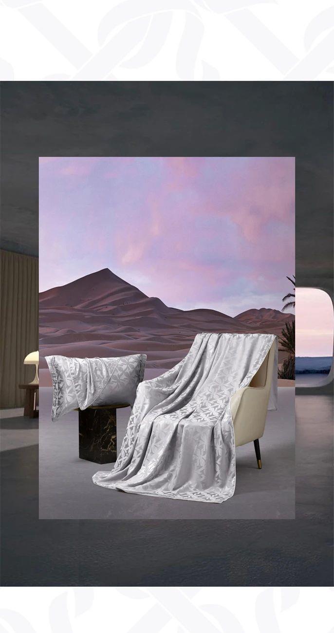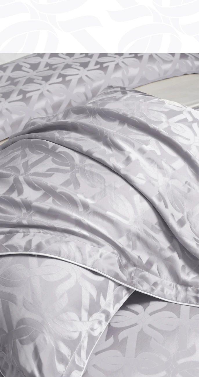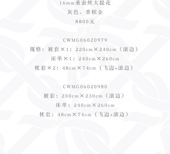 材质:16mm桑蚕丝大提花 颜色:灰色、香槟金 大尺寸编码:CWMG06020979 规格:被套ㄨ1:220cmX240cm(滚边) 床单X1:240cmX260cm 枕套×2:48cmX74cm(飞边+滚边) 小尺寸编码:CWMG06020980 被套:200cmX230cm(滚边) 床单:240cmX260cm 枕套:48cmX74cm(飞边+滚边)