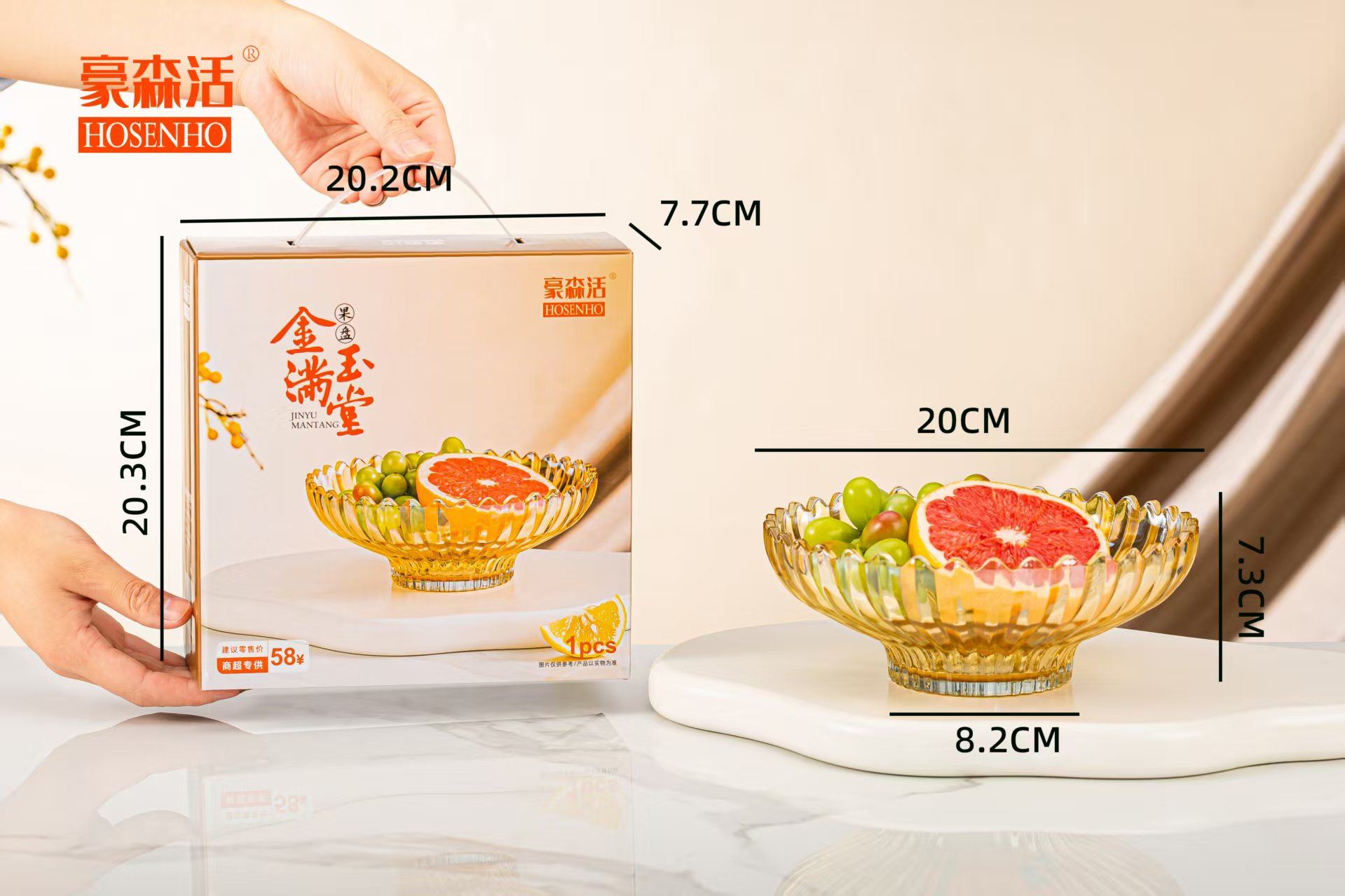 金玉满堂果盘单只 规格:1*24套 货号:JYMT-L1 尺寸:口径:20cm,底:8.2cm,高:7.3cm 彩盒尺寸:20.2*7.7*20.3cm 外箱尺寸:49.2*41.6*41.8cm 条 码:6976254570535