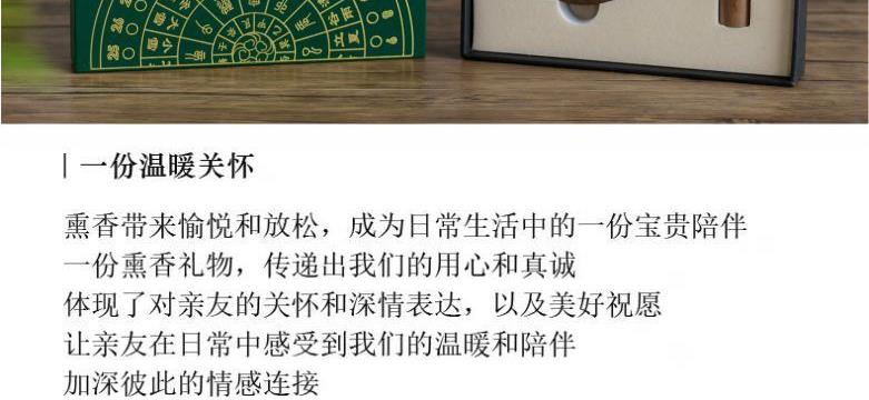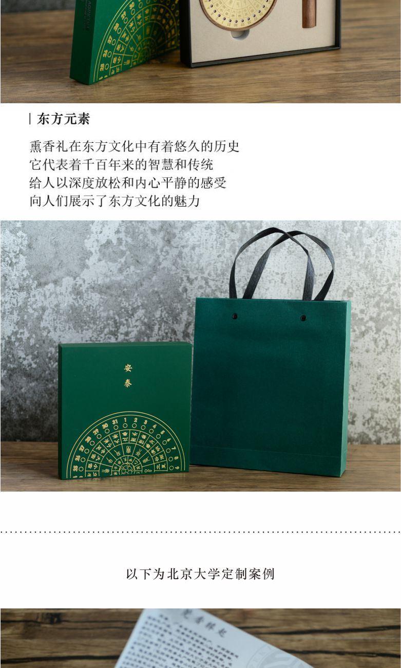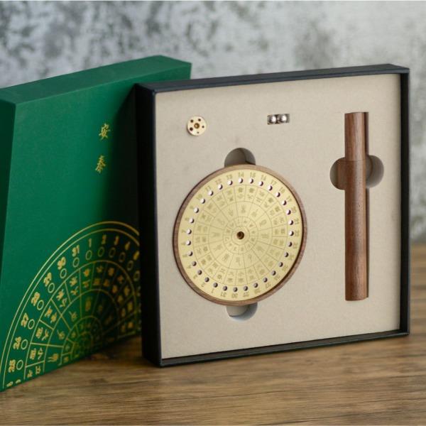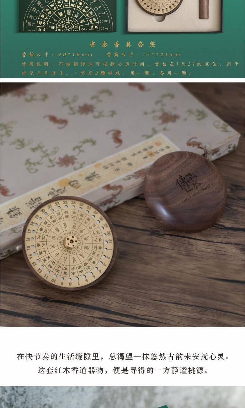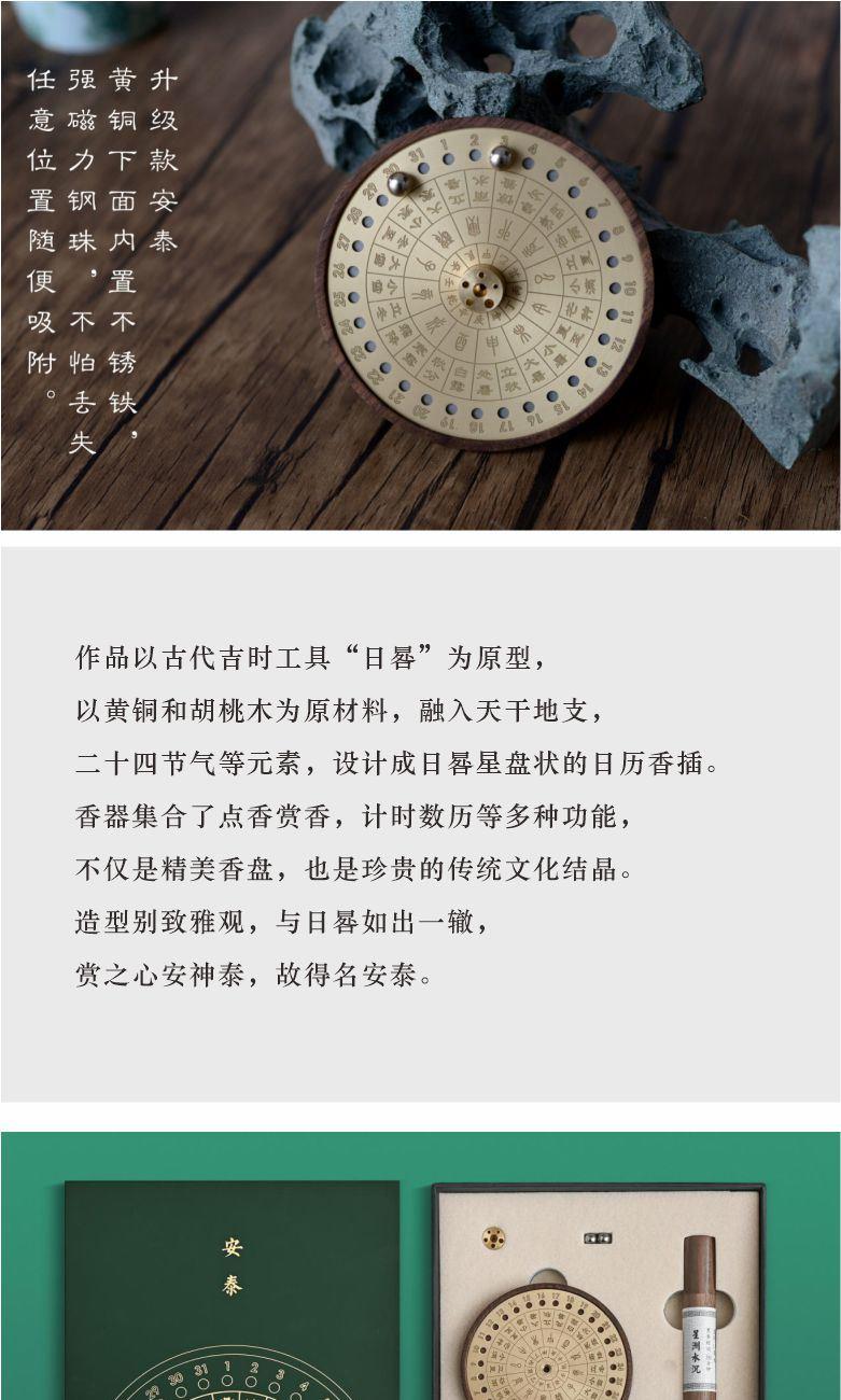 安泰·香器 作品以古代吉时工具“日晷”为原型,以黄铜和胡桃木为原材料,融入天干地支,二十四节气等元素,设计成日晷星盘状的日历香插。 香器集合了点香赏香,计时数历等多种功能,不仅是精美香盘,也是珍贵的传统文化结晶。造型别致雅观,与日晷如出一辙,赏之心安神泰,故得名安泰。 安泰香器 组合:香插+香管+强磁铁钢珠 材质:黑胡桃+铜 工艺:精车+切割 规格: 香座:φ9cm*1.8cm 包装盒:18cm*18cm*3cm 袋子:22*24*5.5cm 配香:星洲水沉