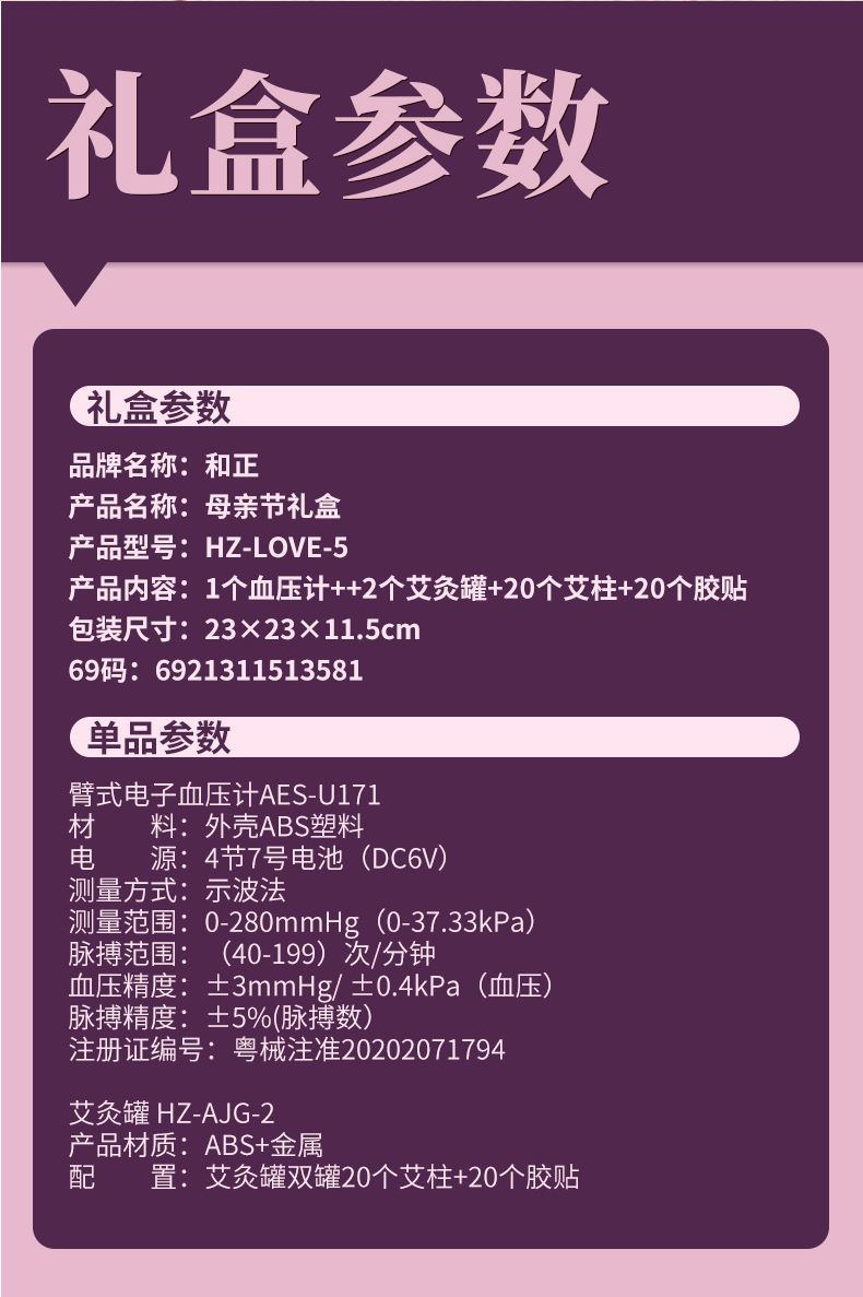 产品内容:1个血压计++2个艾灸罐+ 40个艾柱+40个胶贴 包装尺寸:230×230×115mm 69码:6921311513581 包装方式:精品盒+手提袋 艾灸罐 HZ-AJG-1 产品材质:ABS+金属 配置:艾灸罐双罐20个艾柱+20个胶贴 臂式电子血压计AES-U171 材 料:外壳ABS塑料 电 源:4节7号电池(DC6V) 测量方式:示波法 测量范围:0-280mmHg(0-37.33kPa)