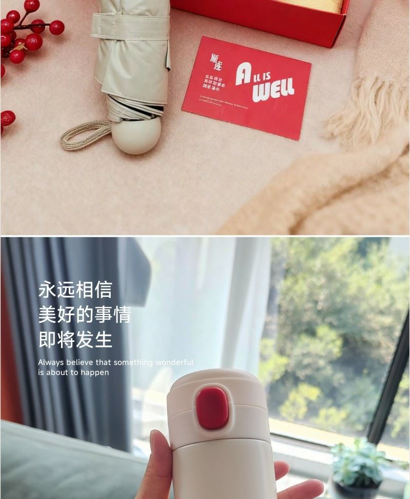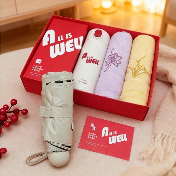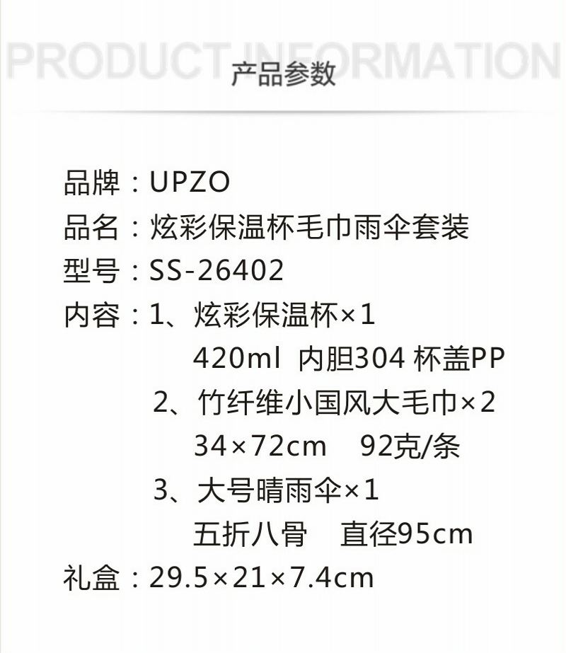 型号: SS-26402 产品内容: 1、竹纤维小国风毛巾×2 每条克重92克 34*72CM 2、大号晴雨伞 ×1 五折八骨 伞下直径95CM 3、炫彩保温杯 ×1 420毫升容量 内胆304 杯盖PP 礼盒: 29.5×21×7.4cm 天地盖+拎袋 1、大号晴雨伞主题设计融入 五折八骨大伞 外观靓丽 实用性强 2、420毫升高颜值保温杯 304内胆 精美设计文案 3、小国风系列毛巾精选竹纤维材质 结合国风刺绣 优质好礼