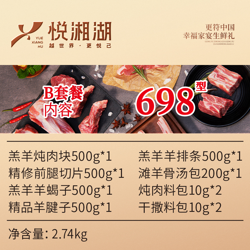 羔羊炖肉块500g*1 精修前腿切片500g*1 羔羊羊蝎子500g*1 精品羊腱子500g*1 羔羊羊排条500g*1 滩羊骨汤包200g*1 炖肉料包10g*2 干撒料包10g*2 净含量:2.74kg