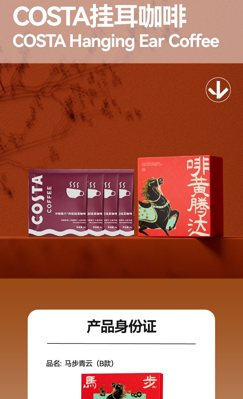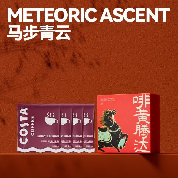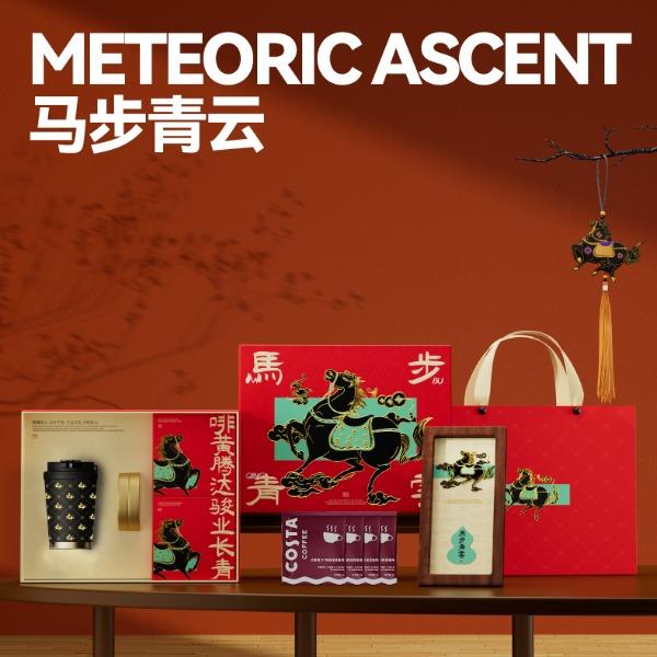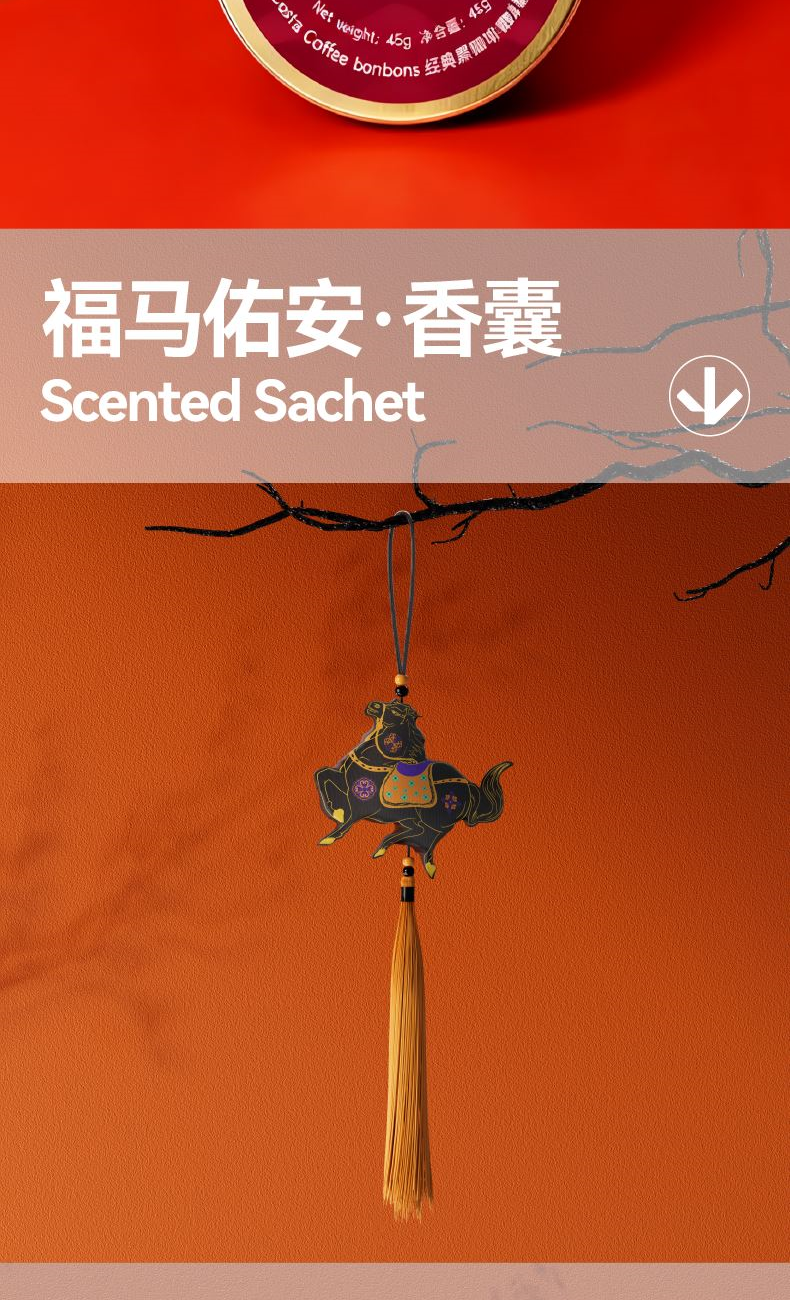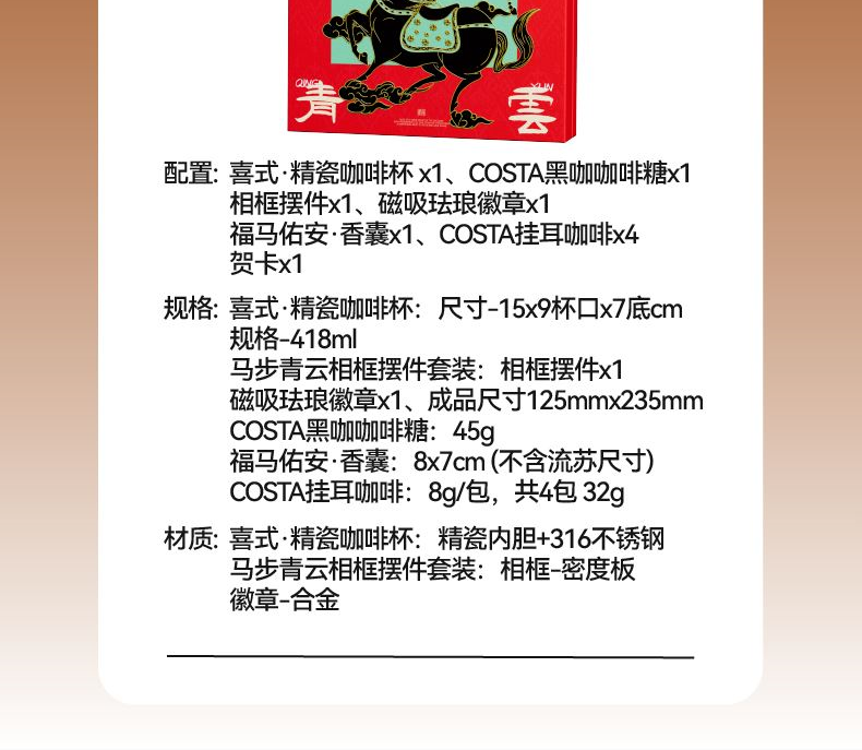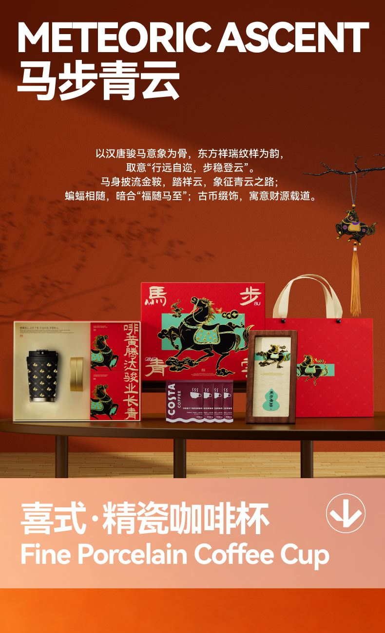 以汉唐骏马意象为骨,东方祥瑞纹样为韵,取意“行远自迩,步稳登云”。马身披流金鞍,踏祥云,象征青云之路;蝙蝠相随,暗合“福随马至”;古币缀饰,寓意财源载道。礼盒整体以中国红为基色,点缀以赤金、青绿,勾勒出古典雅韵与当代审美的交融。 杯盏描金,映照饮马江湖的胸襟,咖啡氤氲间,恰似人生百味沉淀后的澄明;马踏祥云相框,留白处可藏山河岁月,亦隐喻“心有所持,身自端行”。 赠此礼,愿君步履生风,志在千里;心有乾坤,步上青云。 礼盒配置 精装礼盒&手提袋 x1、喜式·精瓷咖啡杯 x1 COSTA黑咖咖啡糖x1、相框摆件x1、磁吸珐琅徽章x1 福马佑安·香囊x1、COSTA挂耳咖啡x4、贺卡x1