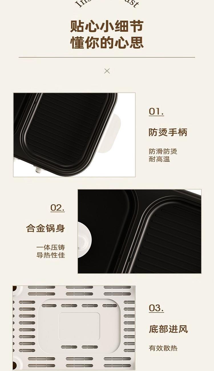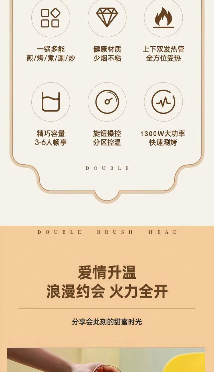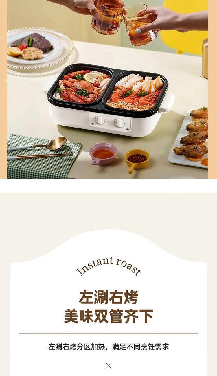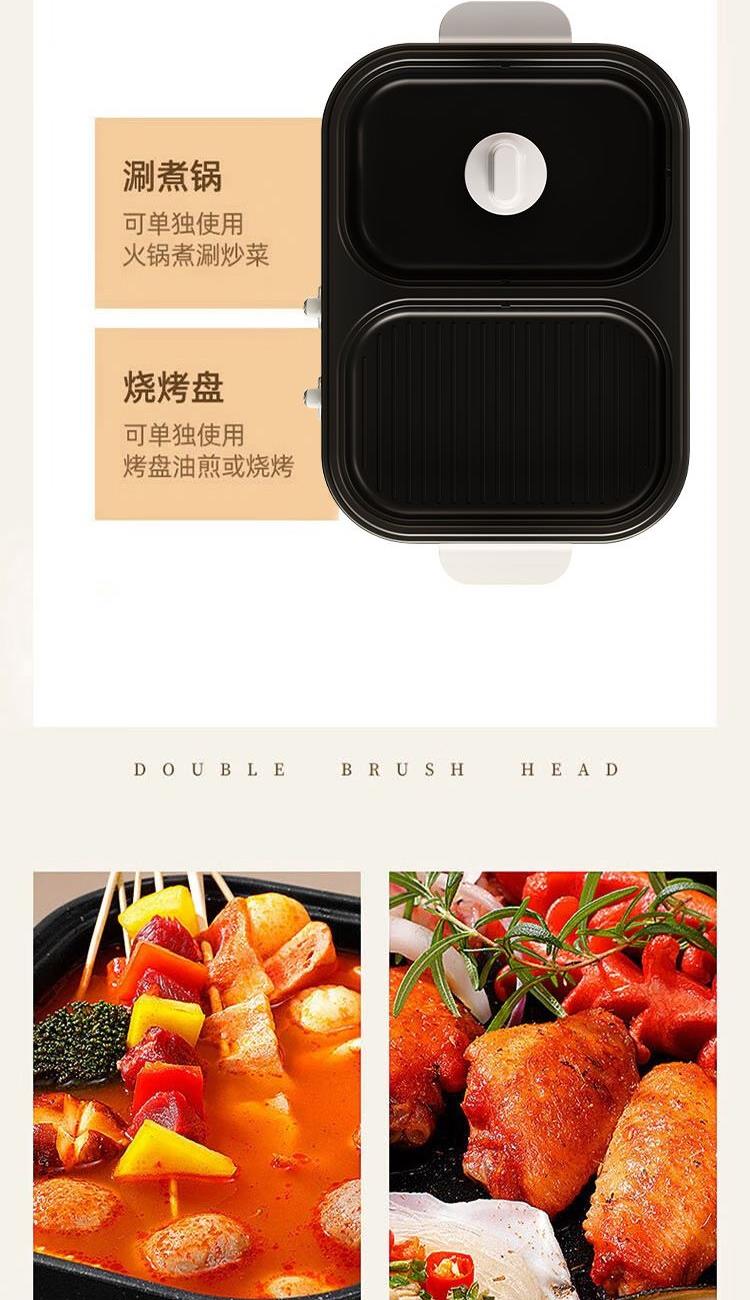 小身材多用途,1L火锅容量,可煎可涮可煮 1300W大火力,火锅650W,煎锅650W 分区独立控温,更方便 不粘烤盘不粘锅,方便清洗
