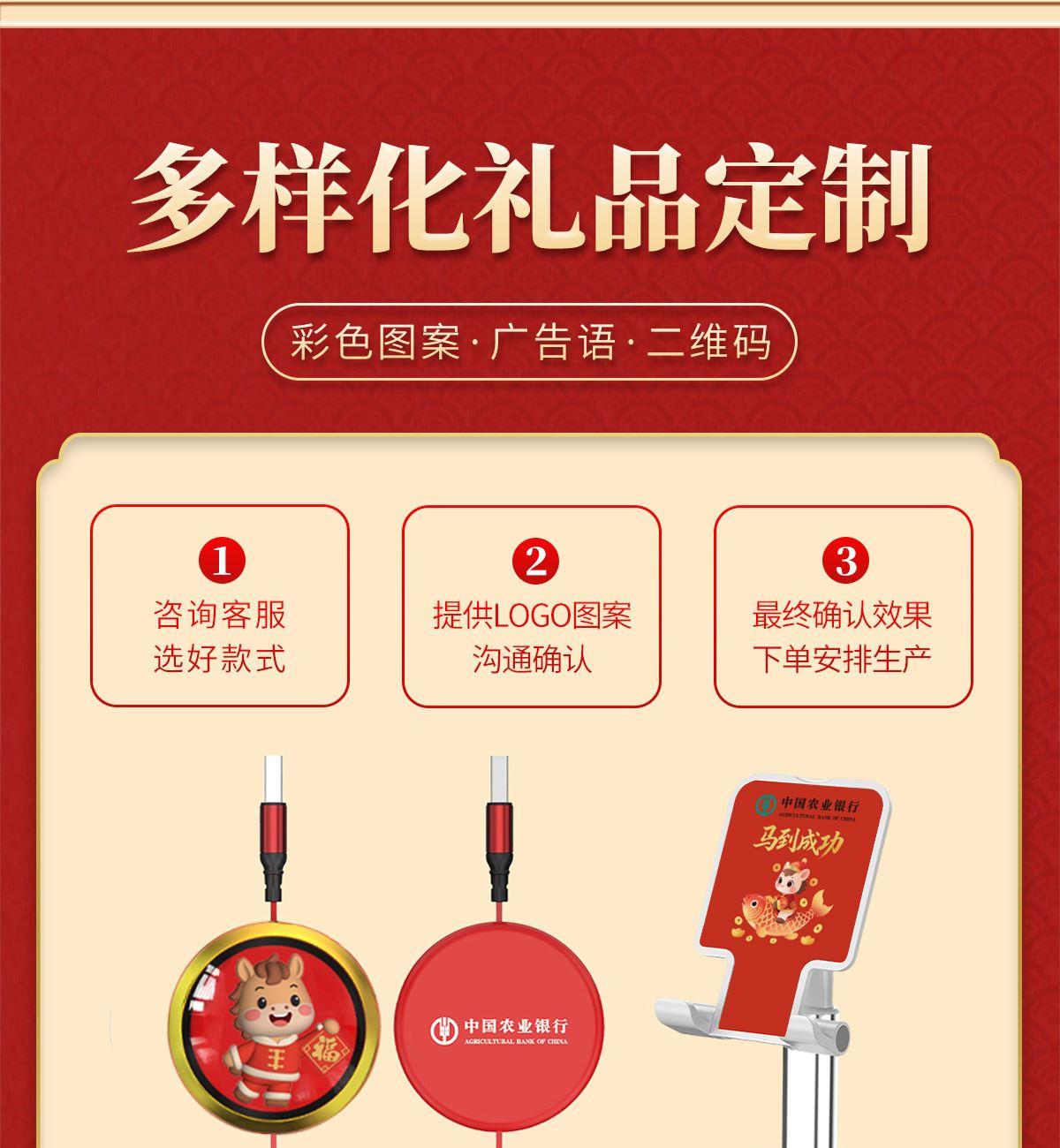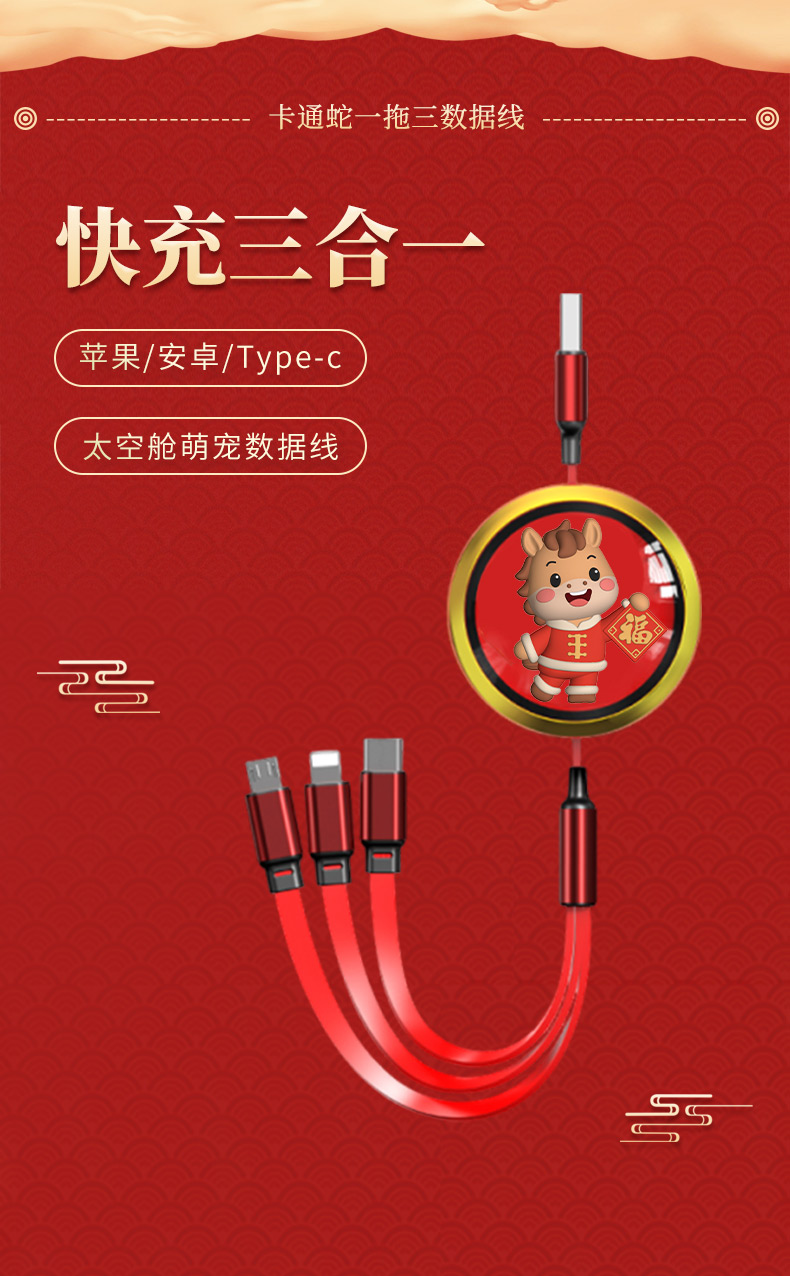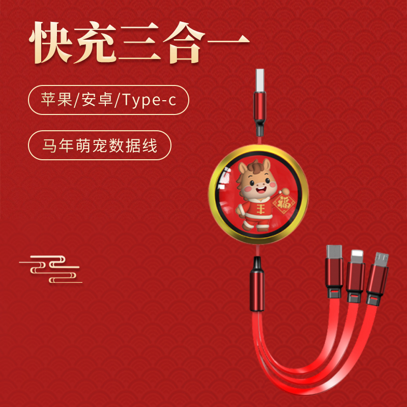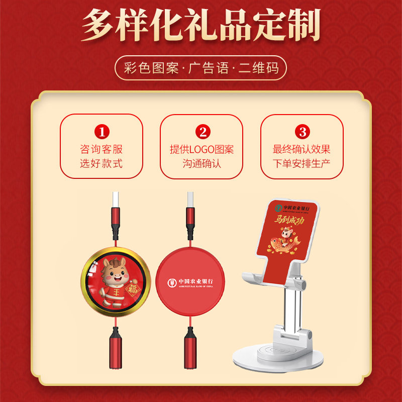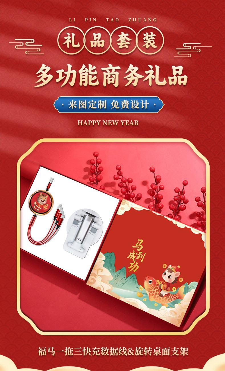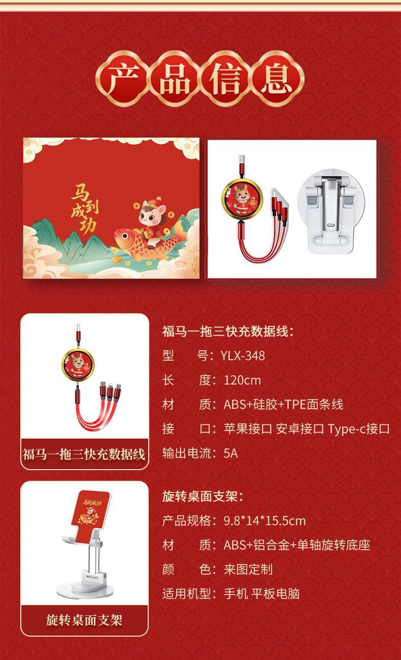 福马一拖三快充数据线: 长 度:120cm 材 质:ABS+硅胶+TPE面条线 接 口:苹果接口 安卓接口 Type-c接口 输出电流:5A 旋转桌面支架: 产品规格:9.8*14*15.5cm 材 质:ABS+铝合金+单轴旋转底座 颜 色:来图定制 适用机型:手机 平板电脑 工艺:UV彩印(可定制图案+LOGO) 礼盒尺寸:22.4x18*3.4cm 标配:礼盒
