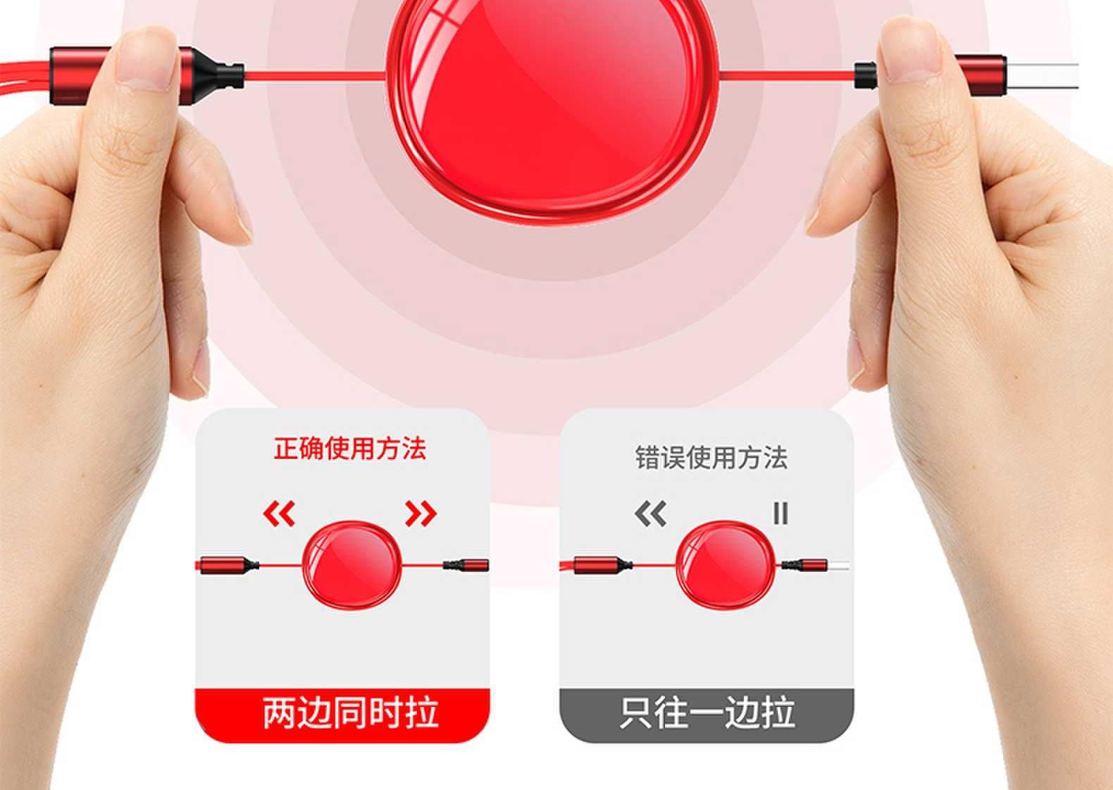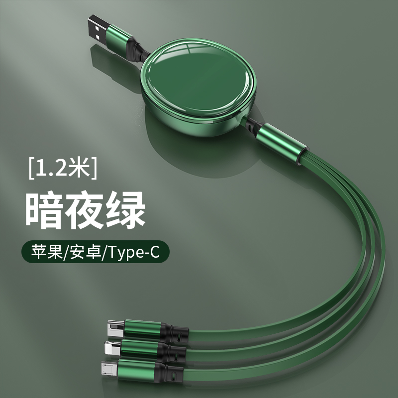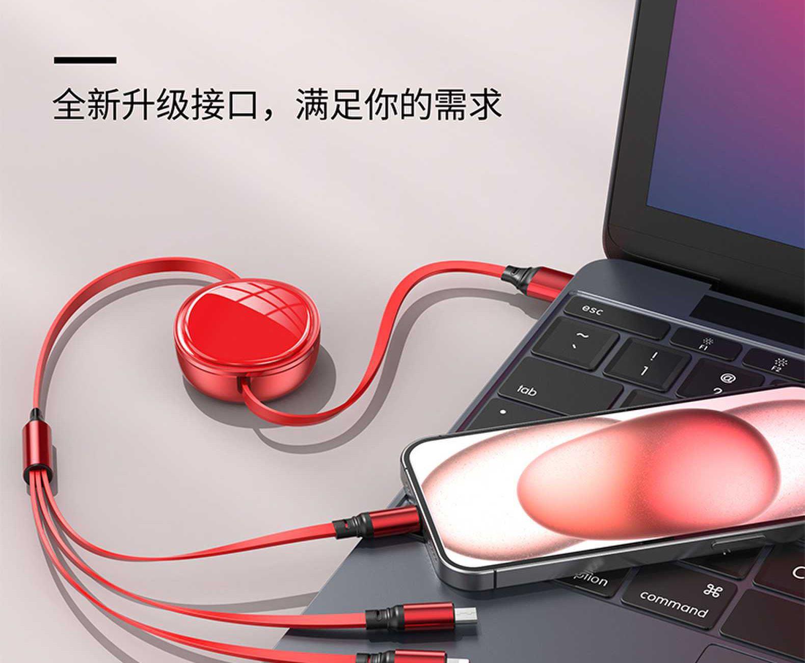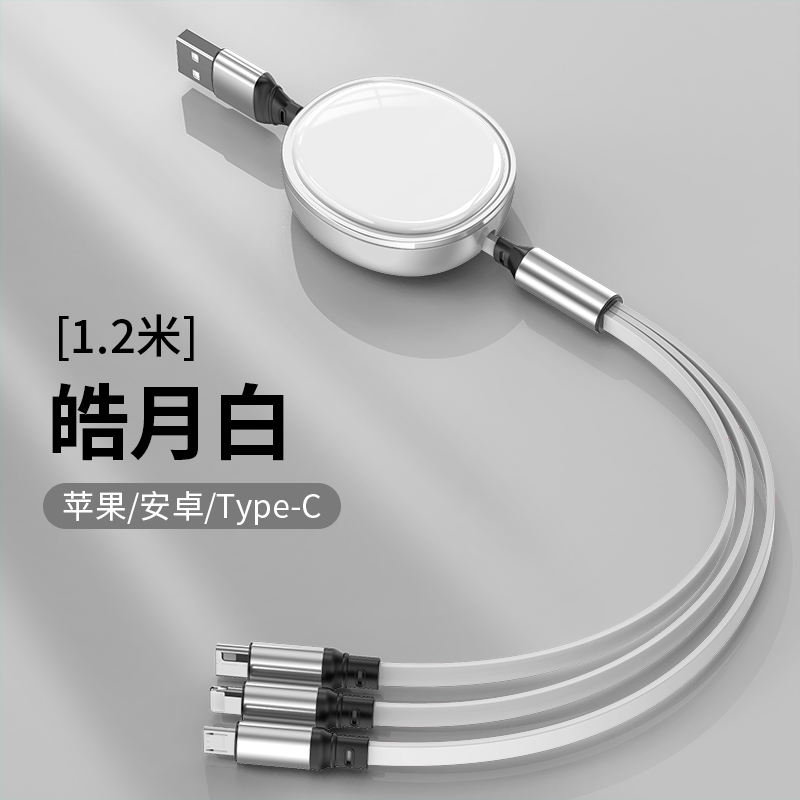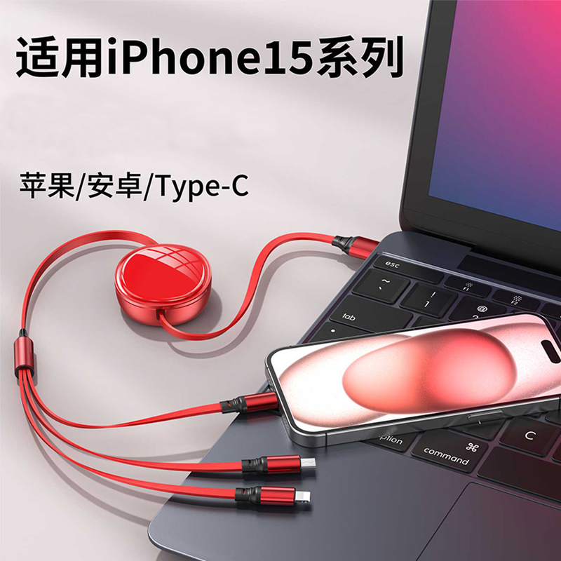 S8魔镜一拖三66W快充伸缩数据线 颜色:白色 黑色 绿色 蓝色 红色 材质:TPE 尺寸:1.2M 包装:彩盒包装 【功能特点】: 一拖三伸缩设计,兼容苹果15系列 66W超级快充,充电更快 三种接口满足各种手机 1.2米长度设计,使用方便 TPE材质耐用,不易折断 五档伸缩调节