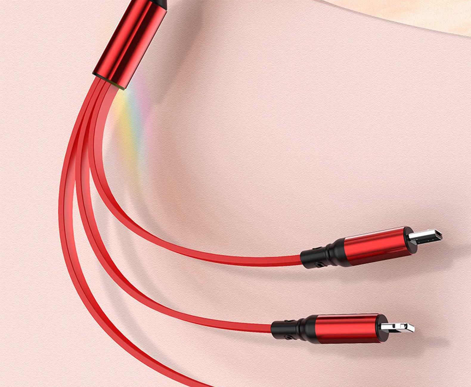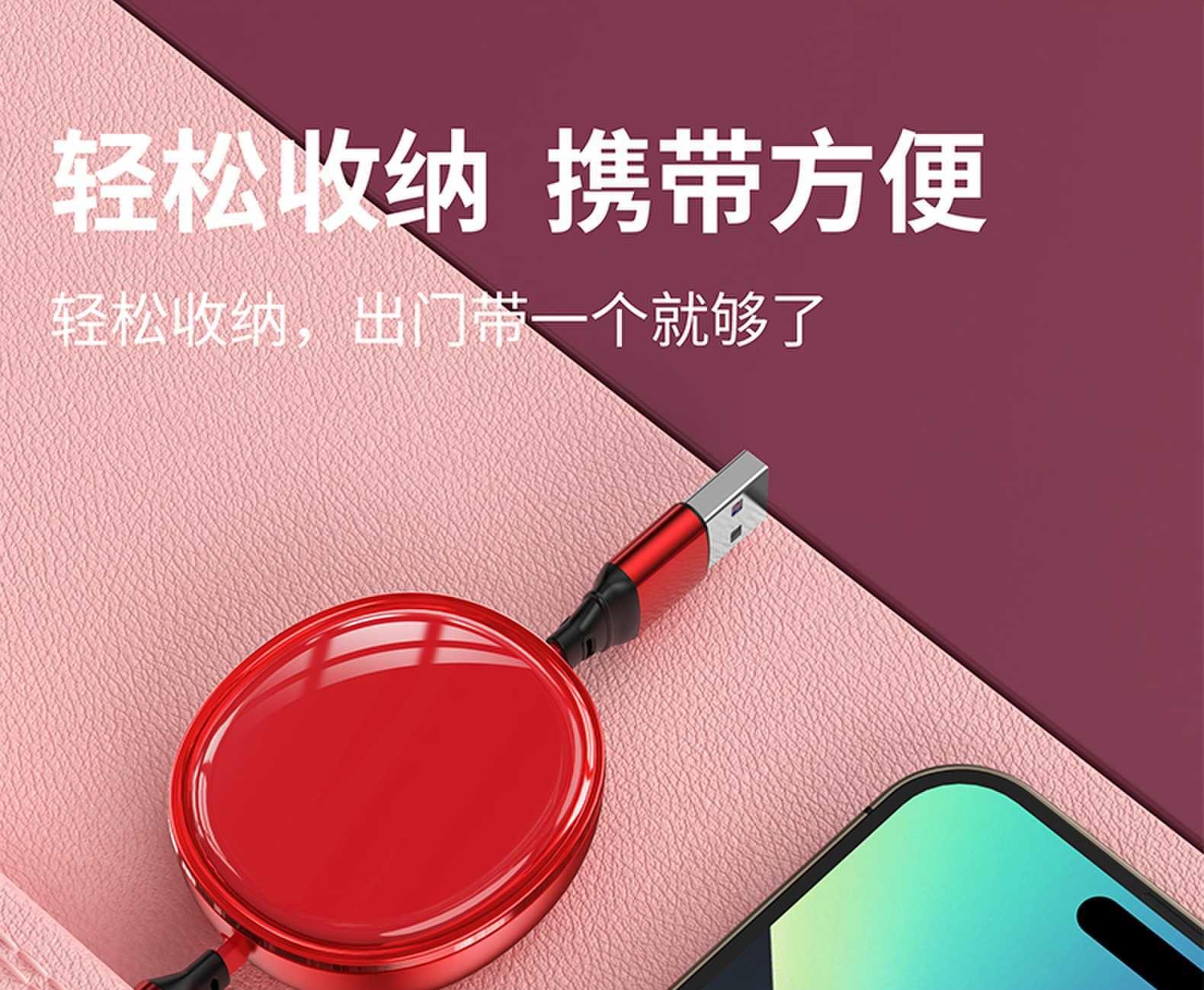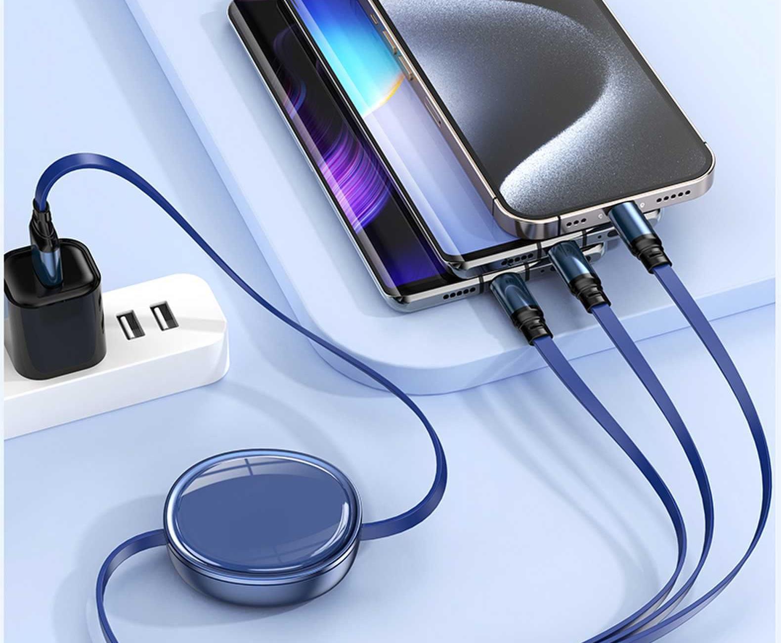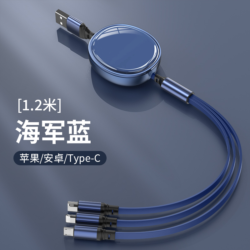 S8魔镜一拖三66W快充伸缩数据线 颜色:白色 黑色 绿色 蓝色 红色 材质:TPE 尺寸:1.2M 包装:彩盒包装 【功能特点】: 一拖三伸缩设计,兼容苹果15系列 66W超级快充,充电更快 三种接口满足各种手机 1.2米长度设计,使用方便 TPE材质耐用,不易折断 五档伸缩调节