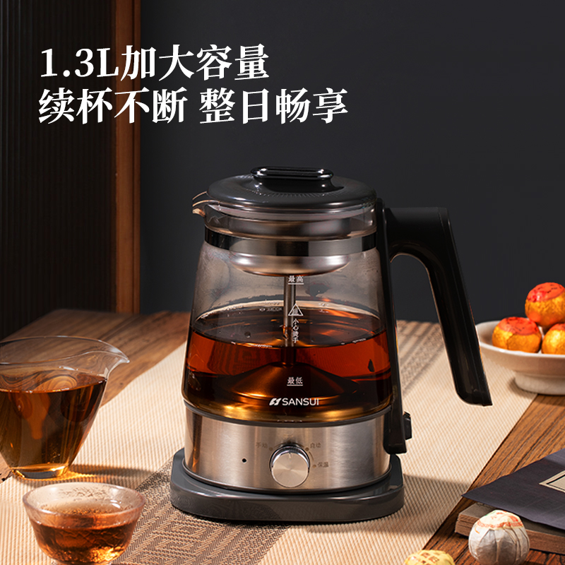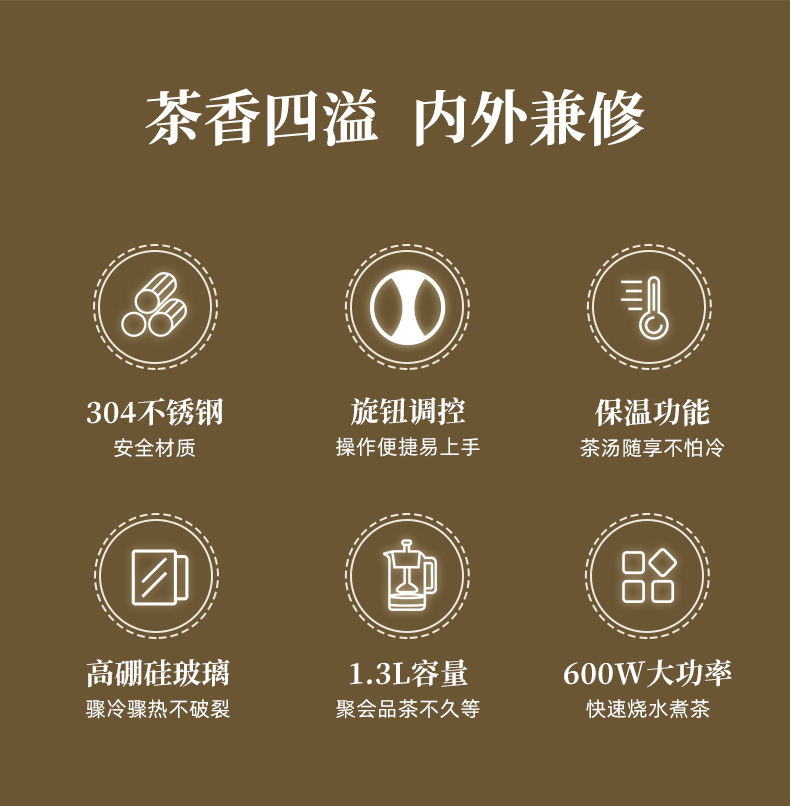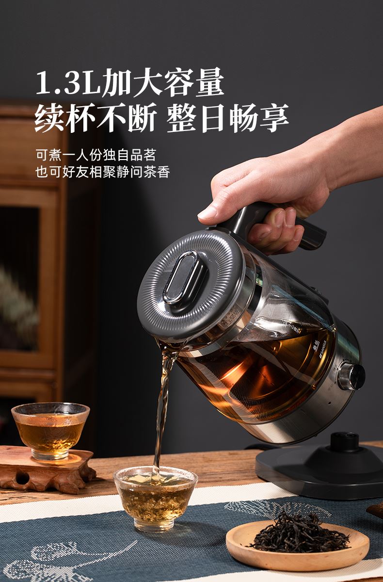 容量:1.3L 功率:600W 蒸汽喷淋萃取泡茶、茶水分离、1.3L大容量、高硼硅玻璃、食品级304不锈钢茶漏、食品级304不锈钢发热盘和上盖、旋钮操作四大功能轻松选、24小时长效保温功能、大口径设计方便清洁、600W大功率、分体式设计清洗便捷 包装方式:彩包+网购包装