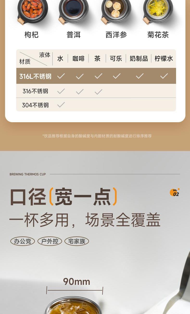 规格参数 产品说明 容量:500ml 材质:316L不锈钢 功能卖点 1、316L不锈钢,耐磨耐用耐腐蚀 2、双层真空,隔绝温度流失 3、长效保温,保温保冷