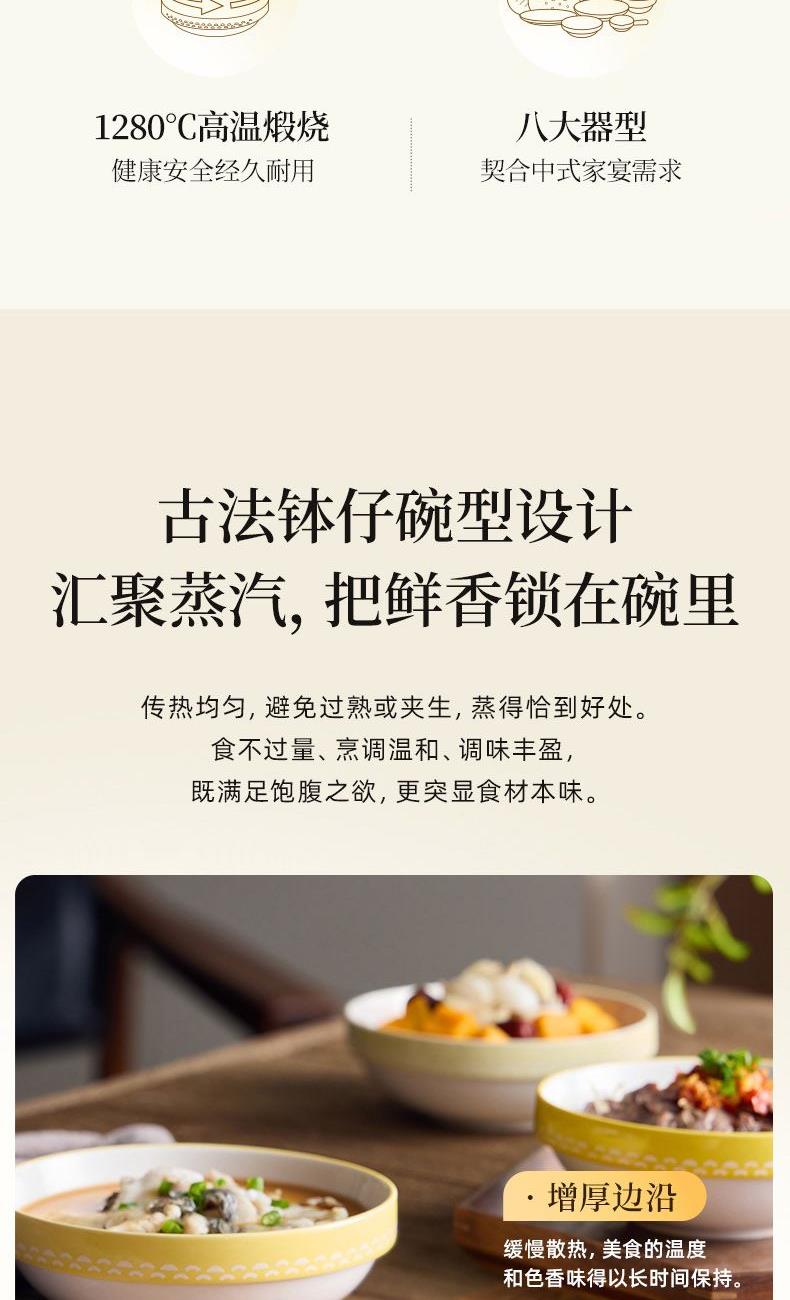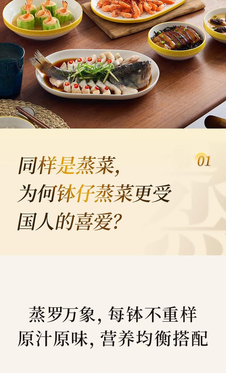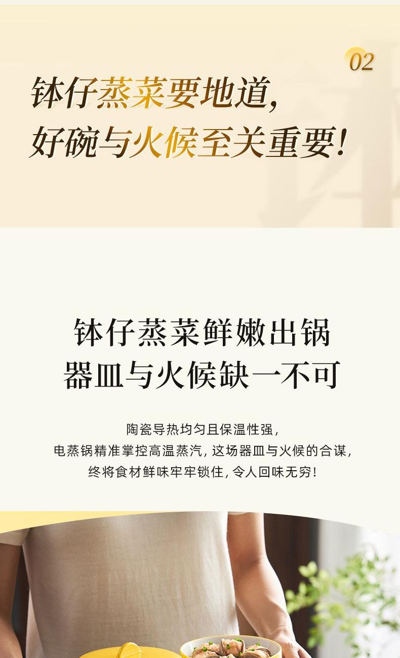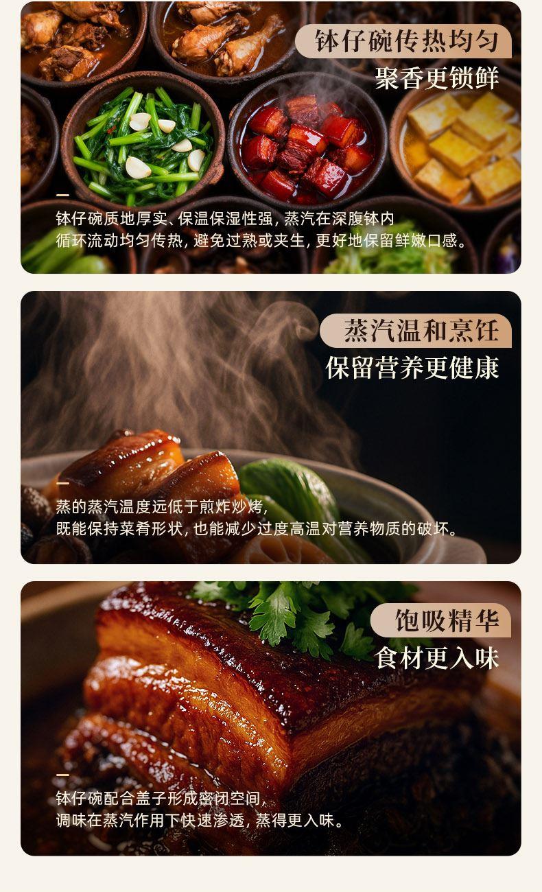 容 量: 直径120mm、深度58mm 毛 重 : 1.75kg 产 品 尺 寸: 140*140*124mm 包 装 尺 寸: 374*344*121mm 配 置: 钵仔碗*4、碗盖*1 1.特色钵仔蒸菜,套叠收纳,自成风景 2.隔绝水汽,保鲜蒸煮营养不流失3.3次1280℃高温锻烧4.可烤可蒸可微波耐冷热-20℃-250℃