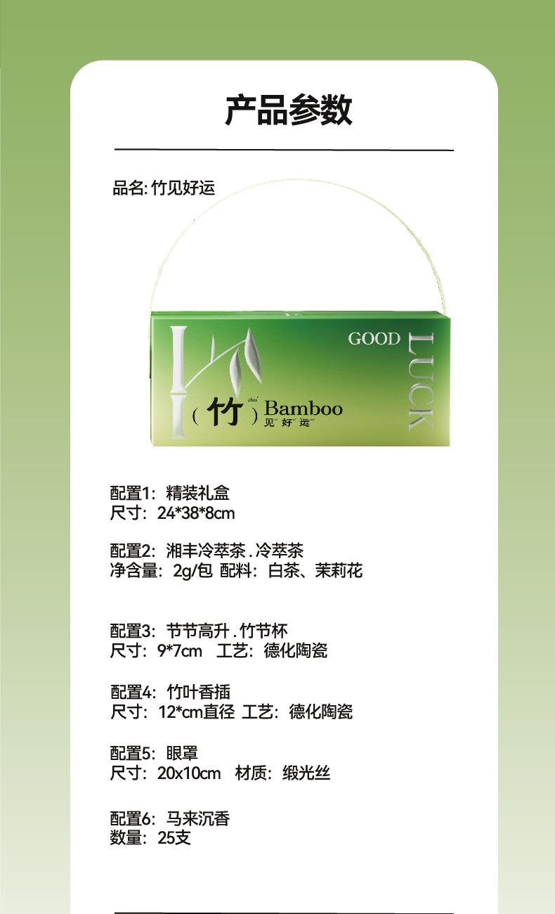 礼盒配置:精装礼盒X1、陶瓷竹节杯X1、陶瓷竹叶香插X1 马来沉香X1、睡眠眼罩件X1、湘丰·冷萃茶X10 规格材质: 竹节杯-9*7cm 德化陶瓷 竹叶香插-12*cm直径 德化陶瓷 眼罩-20x10cm 缎光丝 马来沉香-25支 湘丰·冷萃茶-净含量:2g/包 共10包 配料:白茶、茉莉花 礼盒尺寸:24x38x8cm 以竹为引,「竹见好运」礼盒携东方雅韵翩然而至 将盛夏燥热敛入幽篁深处,予你一抹沁心清凉 陶瓷竹节杯,执握间如触竹节纹理,盛一盏冷萃茶香,暑气悄然遁形 陶瓷香插搭配马来沉香,心随烟缕沉静,喧嚣归于禅意 眼罩轻覆双眸,如坠月下竹海,疲惫在丝柔中融化,独享片刻私密安宁 冷萃白茶以低温萃取时光,茶汤澄澈如露,醇,唤醒味觉的幽微诗意 以竹为名,愿清风长伴,诸事皆宜,好运渐生