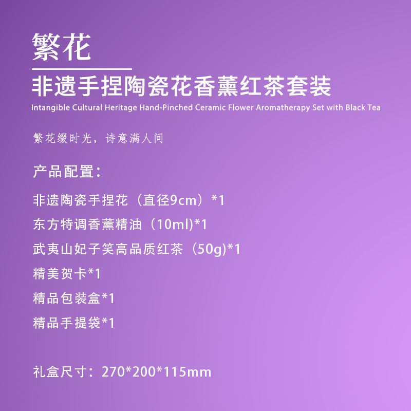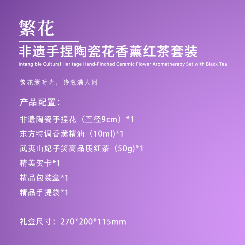 【产品配置】 非遗陶瓷手捏花(直径9cm) *1 东方特调香薰精油(10ml)*1 武夷山妃子笑高品质红茶(50g)*1 精美贺卡*1 精品包装盒*1 精品手提袋*1 【产品说明】 1、9cm非遗手捏陶瓷花,兼具文化价值与艺术装饰性; 2、武夷山妃子笑红茶,口感醇厚有保障; 3、一套涵盖茶品与东方特调香薰,营造雅致生活氛围; 4、“繁花”主题+紫色调,传递诗意氛围感; 5、配套精美包装与贺卡,仪式感拉满。