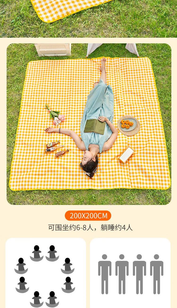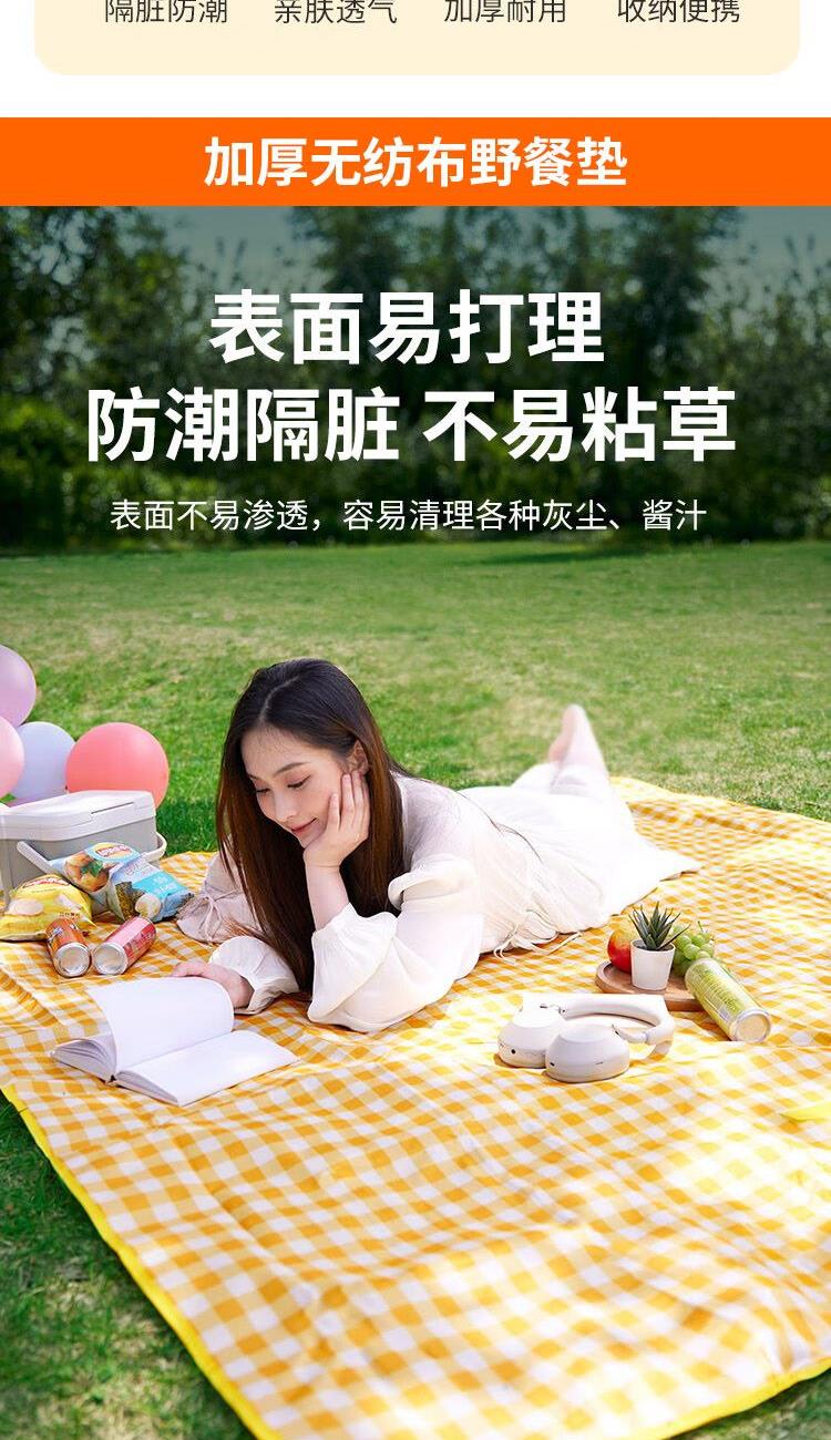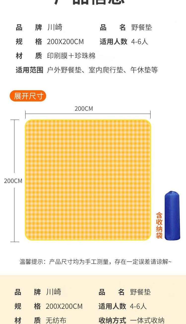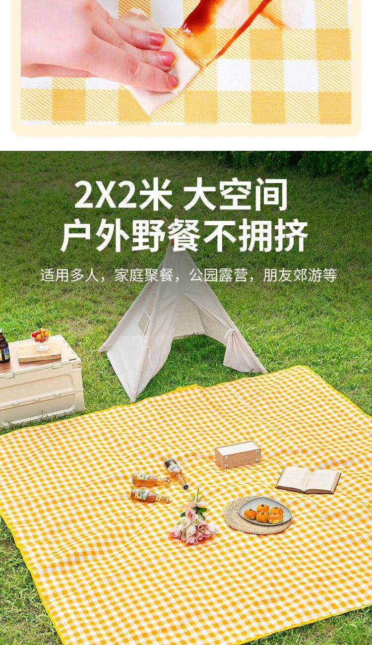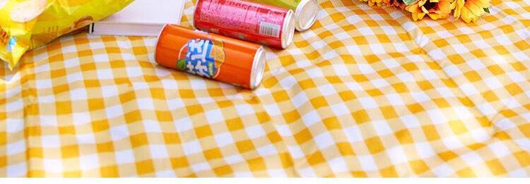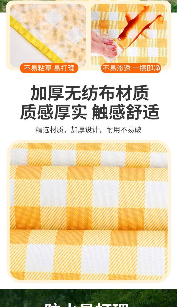 颜色:黄色格子纹 规格:200*200cm 材质:110克无纺布 产地:广东 1.新风尚,多功能野餐垫 2.牛津布柔软舒适,可折叠方便携带 3,加大尺寸防水防潮,表面材质不沾草,清爽干净 4.轻便包装,减小体积,使垫子更加便于携带