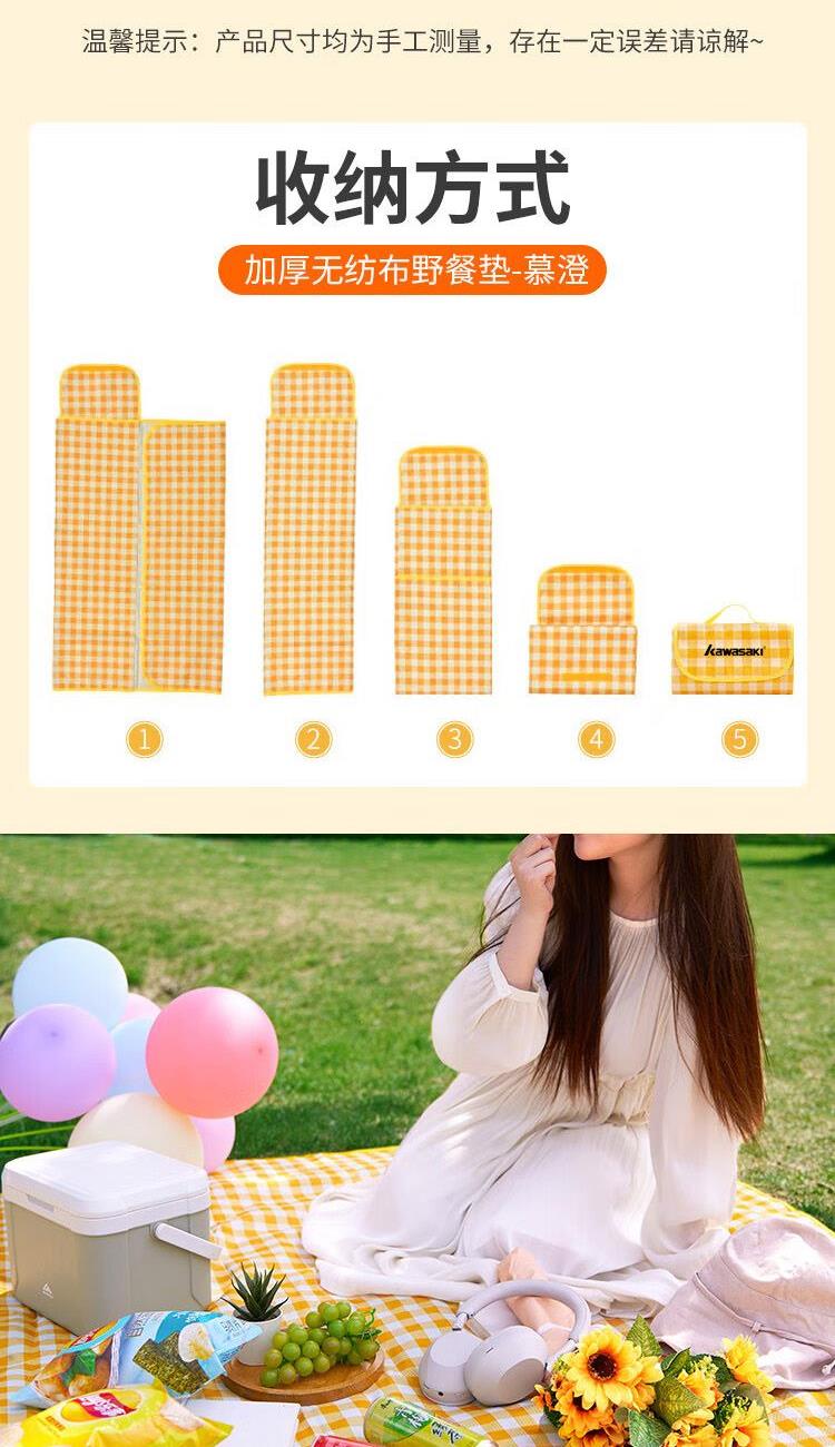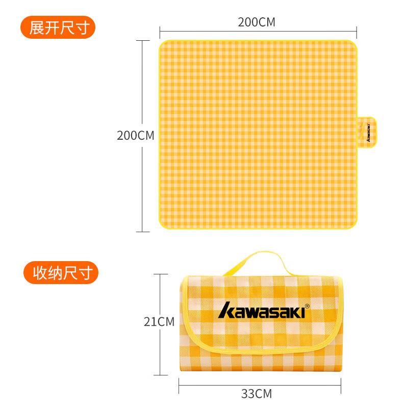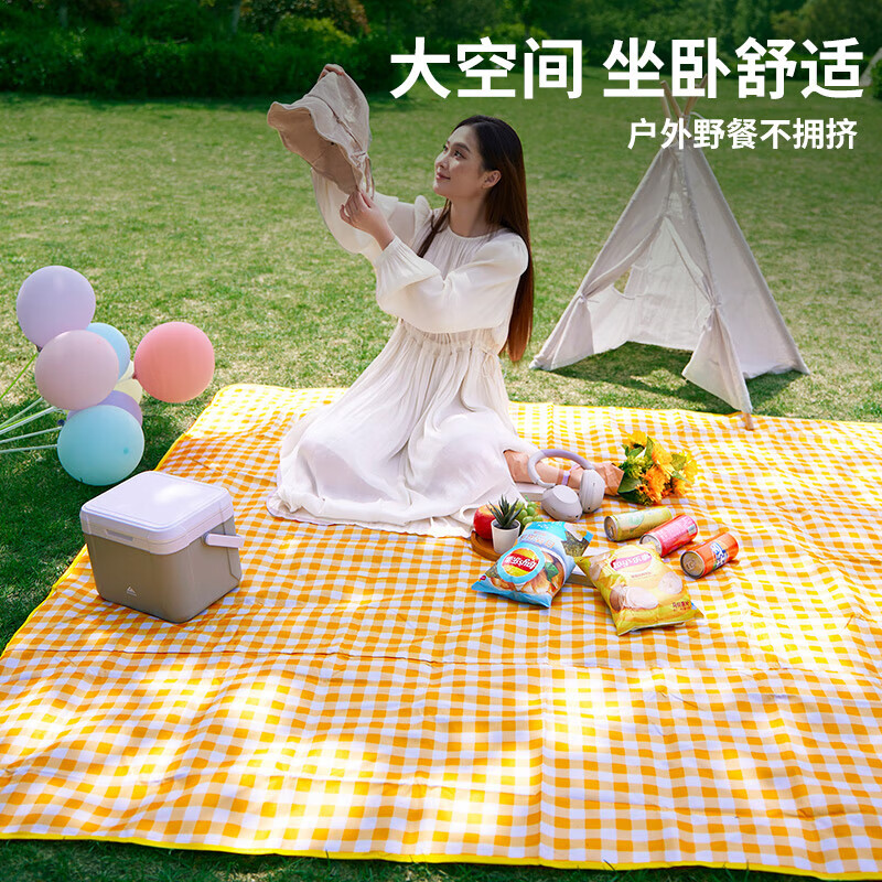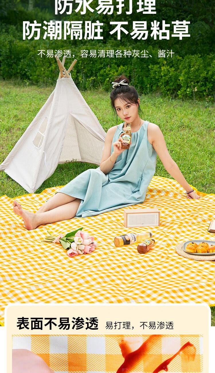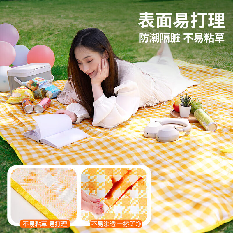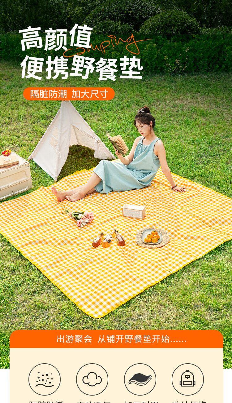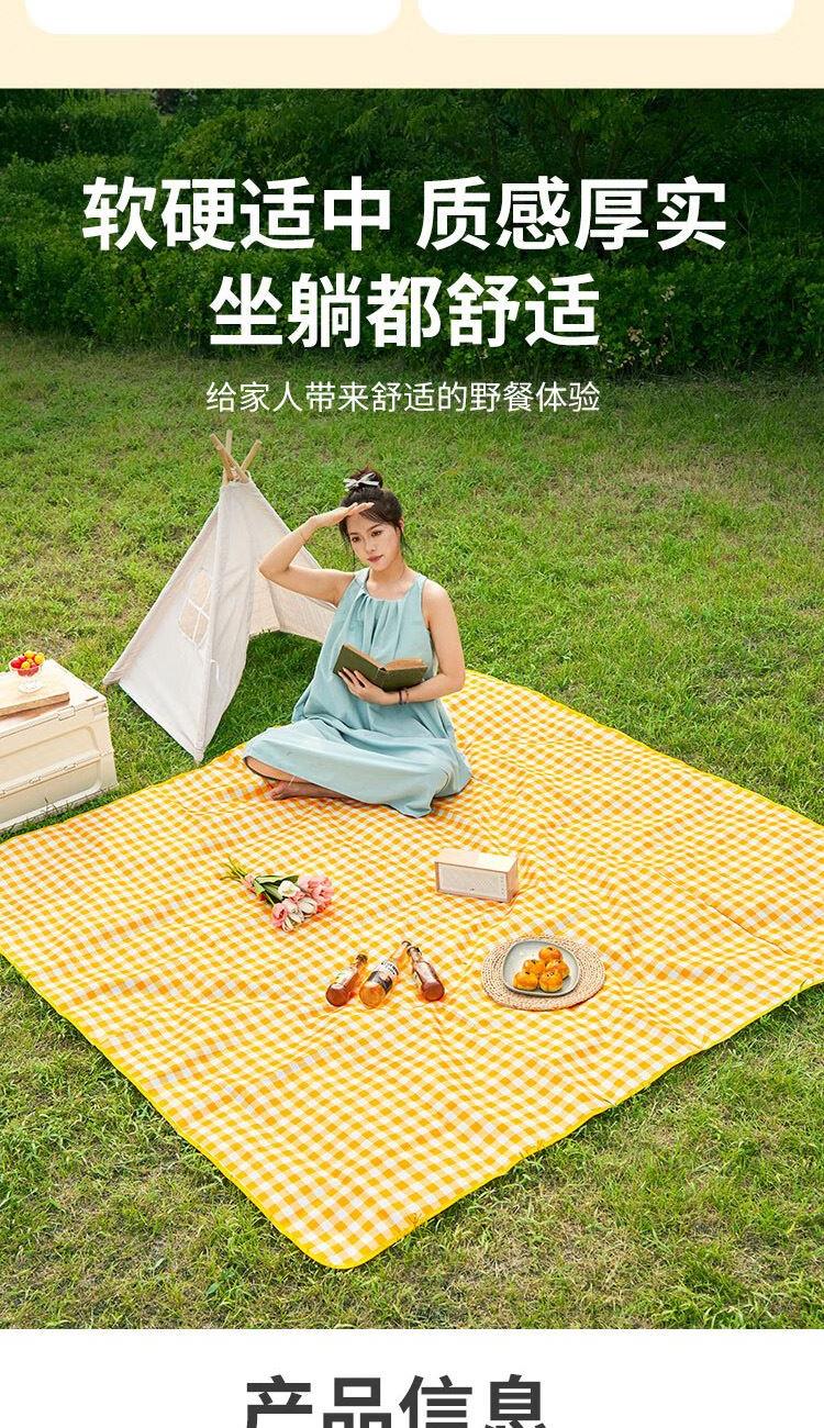 颜色:黄色格子纹 规格:200*200cm 材质:110克无纺布 产地:广东 1.新风尚,多功能野餐垫 2.牛津布柔软舒适,可折叠方便携带 3,加大尺寸防水防潮,表面材质不沾草,清爽干净 4.轻便包装,减小体积,使垫子更加便于携带