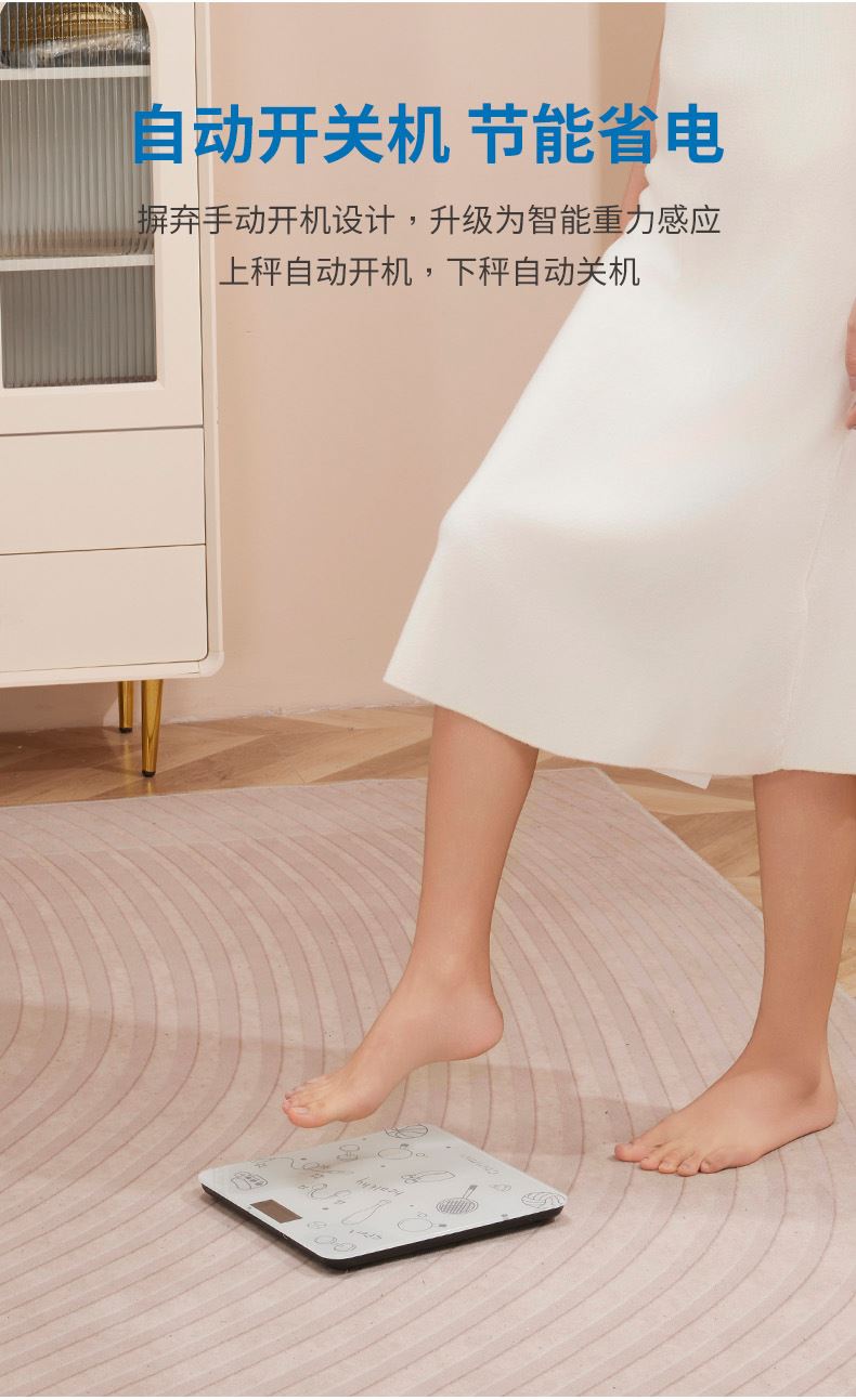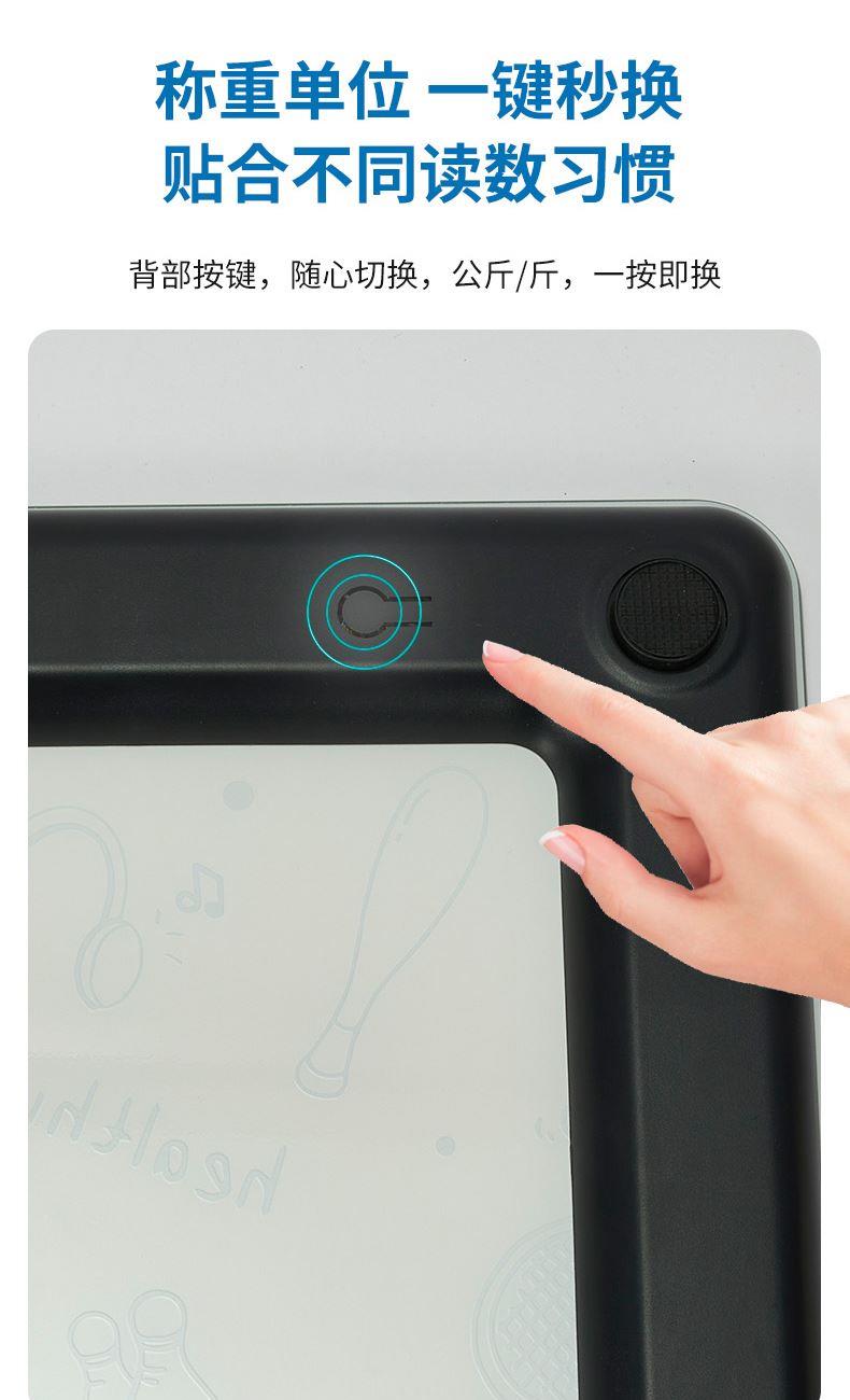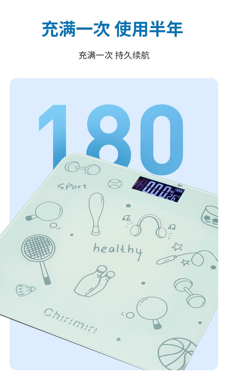 输入电压:DC 5V 额定功率:0.2W 单位选择: kg/斤 产品材质:钢化玻璃 称量范围:0.2-180kg 显示方式:4位液晶显示 产品尺寸:260*260*21mm 传感器测量,微小的进步,也值得被看见 精雕细琢每一面,轻薄不单薄,承重可达360斤 液晶显示屏,清晰读数,无惧黑夜 智能感应开关,节能省电,充一次用半年 助你尽情开练,重塑自信轮廓,雕刻出属于自己的高能时刻!