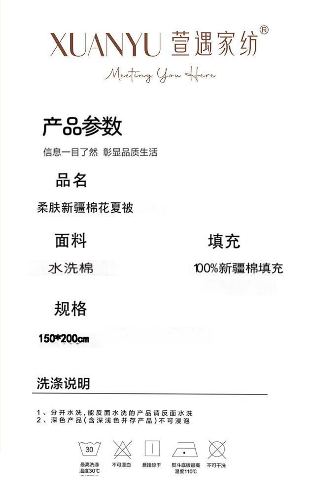 尺寸:150*200cm 面料:水洗棉 填充:新疆棉花 执行标准:GB/T22796-2021 安全类别:GB18401-2010 B类 1.面料选用细腻水洗棉,触感软糯亲肤,越洗越柔,不发硬、不起球,贴身舒适。 2.填充甄选新疆优质棉花,棉朵蓬松饱满,保暖透气不闷汗,天然无异味。 3.整体轻盈不压身,吸湿透气,恒温保暖,裸睡也安心。