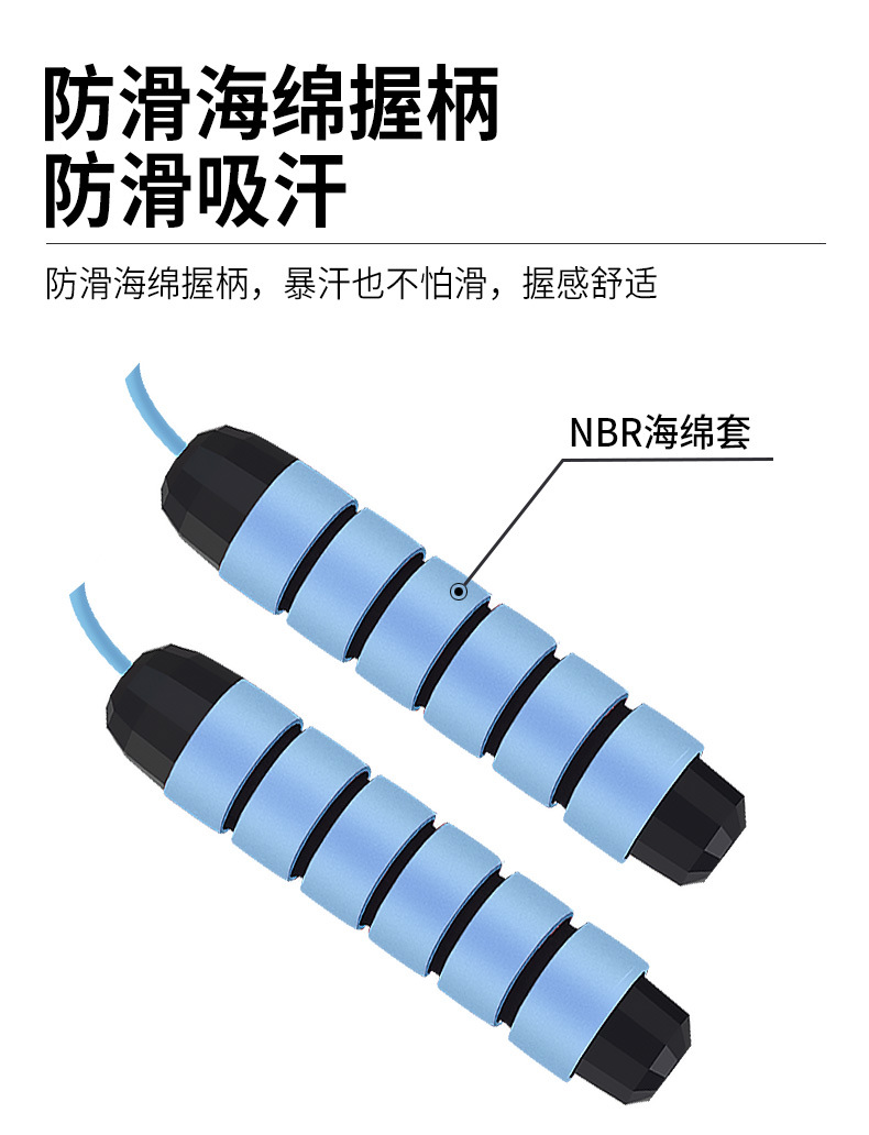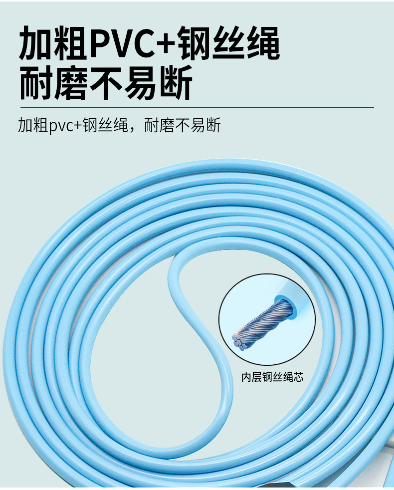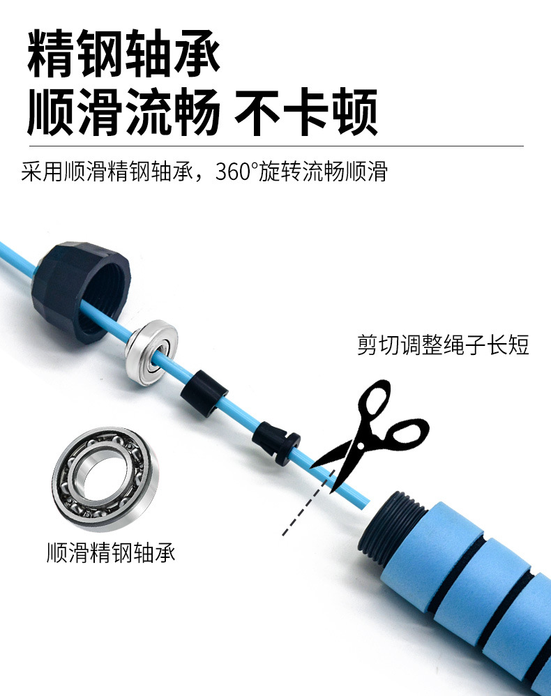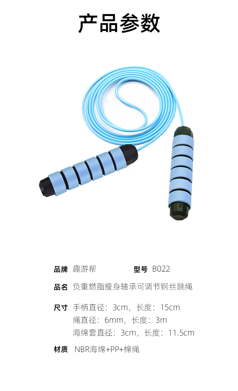 材质 NBR海绵+PP+棉绳 颜色 蓝色 尺寸 手柄直径:3cm,手柄长度:15cm 绳直径:6mm,绳长度:3m 海绵套直径:3cm,海绵套长度:11.5cm 重量 0.19kg 精钢轴承,加粗绳体,耐用更耐看 防滑海绵握柄,暴汗不怕滑,握感舒适 加粗PVC+钢丝绳,耐磨不易断 精钢轴承,360°旋转顺滑流畅,不卡顿
