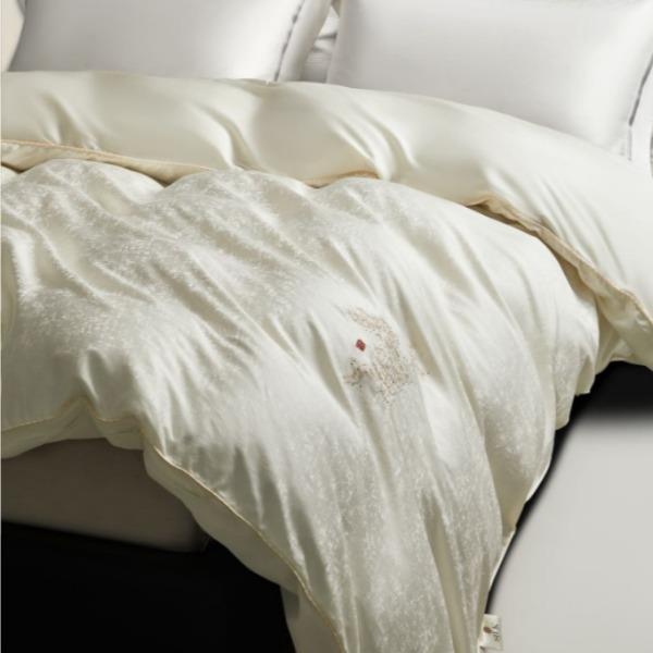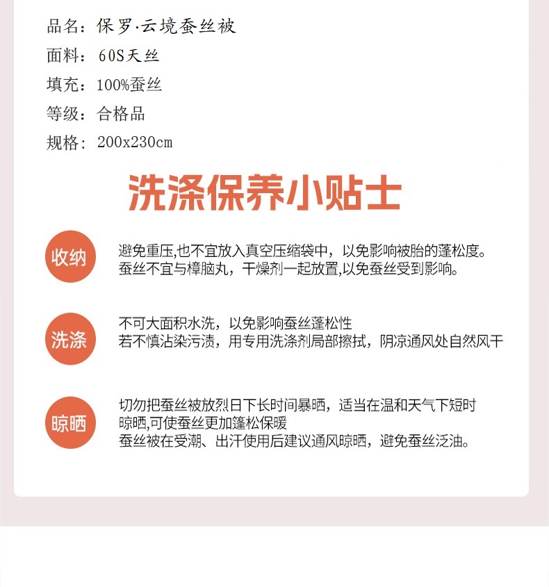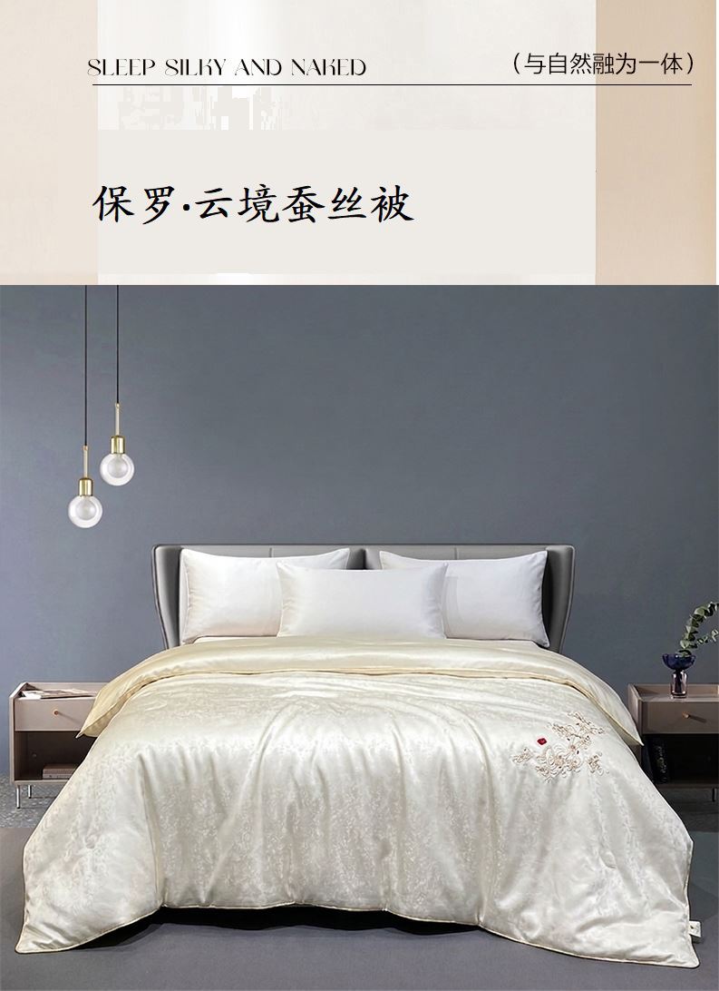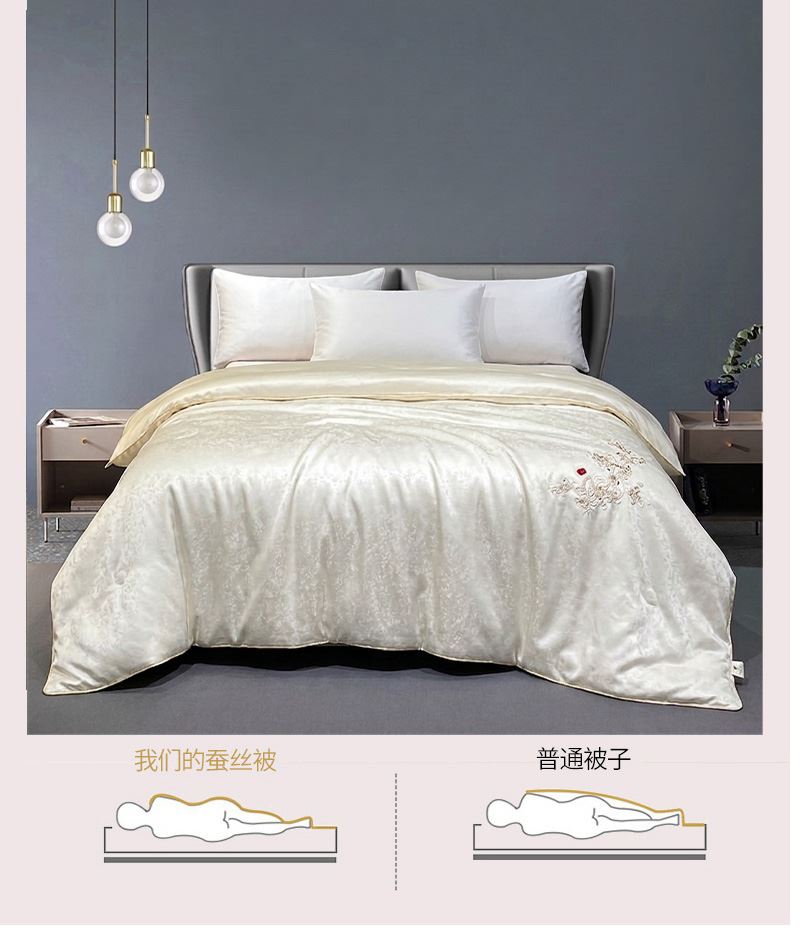 面料材质:60S天丝 填充:蚕丝 产品规格:200*230cm 克重:1900g 产品特点: 享爱蚕丝柔滑,享受拥享睡眠。会呼吸的面料,舒适软糯,躺在床上的一瞬间,感受渗透全身的惬意。