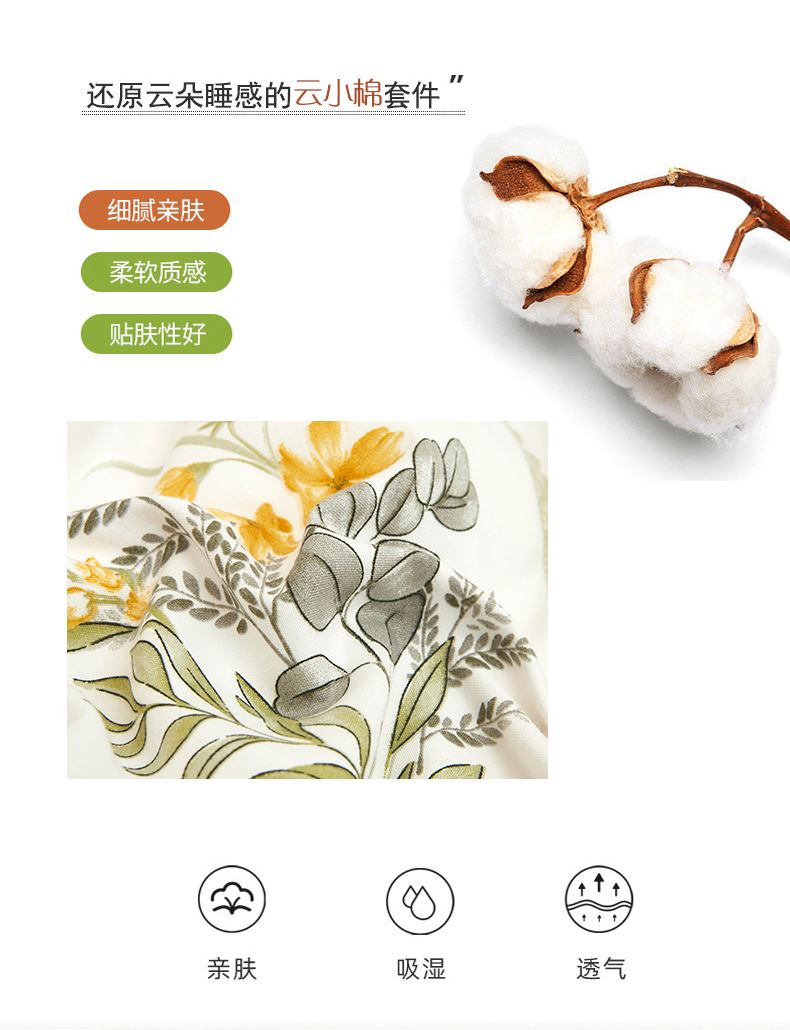 被套:200*230cm 床单:230*245cm 枕套:48*74cm*2 面料:云小棉(聚酯纤维) 执行标准:GB/T22796-2021 安全类别:GB18401-2010 B类 1.优质云小棉面料,纤维韧性强,拉力强度高,透气舒适贴身。种植物纤维织物,手感柔软,舒适质感丰厚,而且有厚重感,不褪色,不缩水,容易打理。 2.做工精制细腻,美观大方,朴实耐用,是您享受健康科技睡眠的必选佳品。