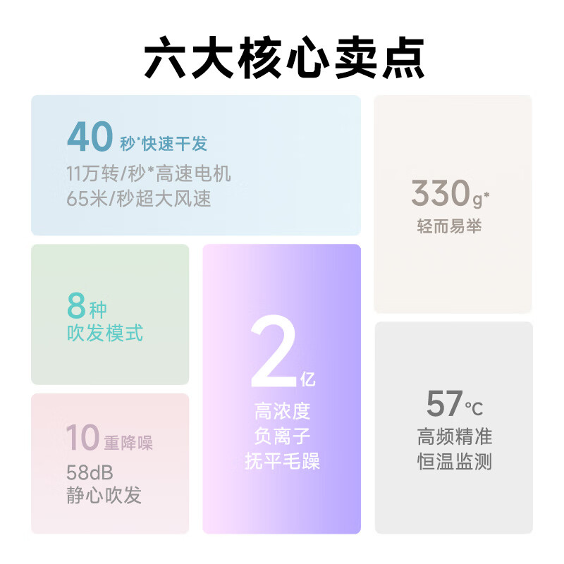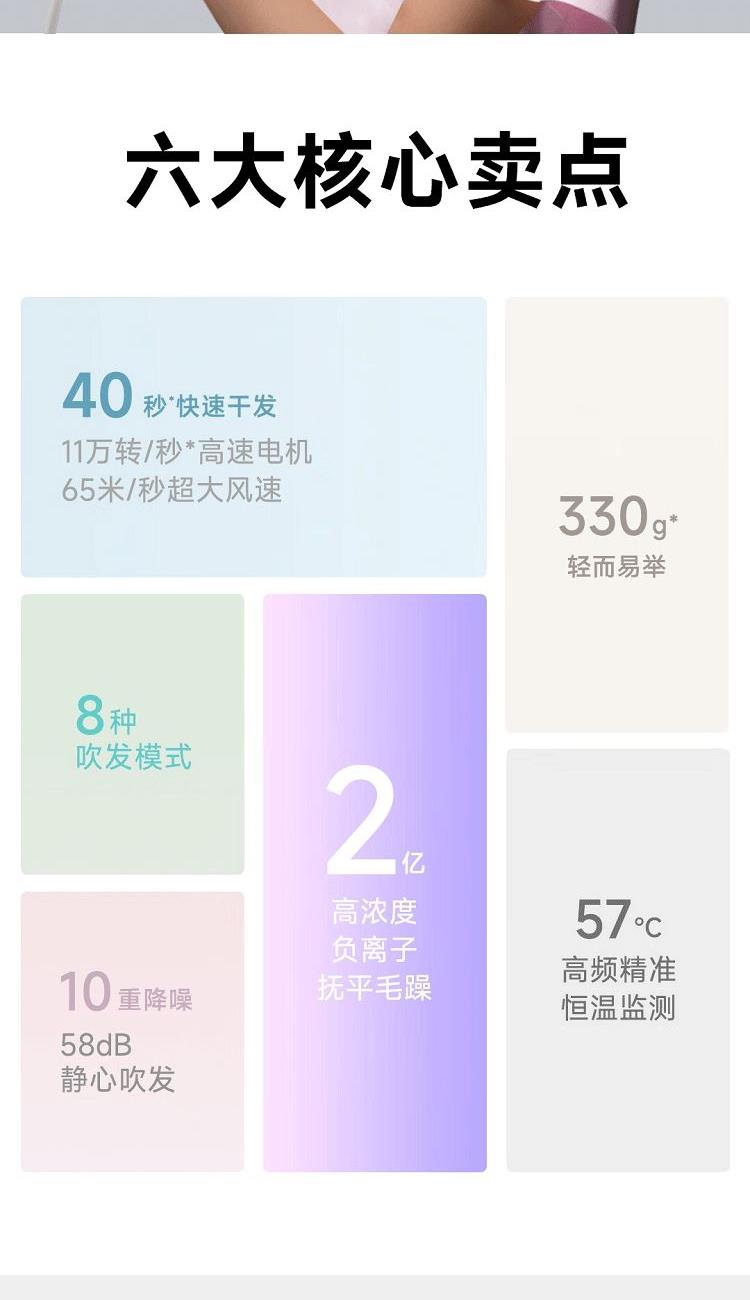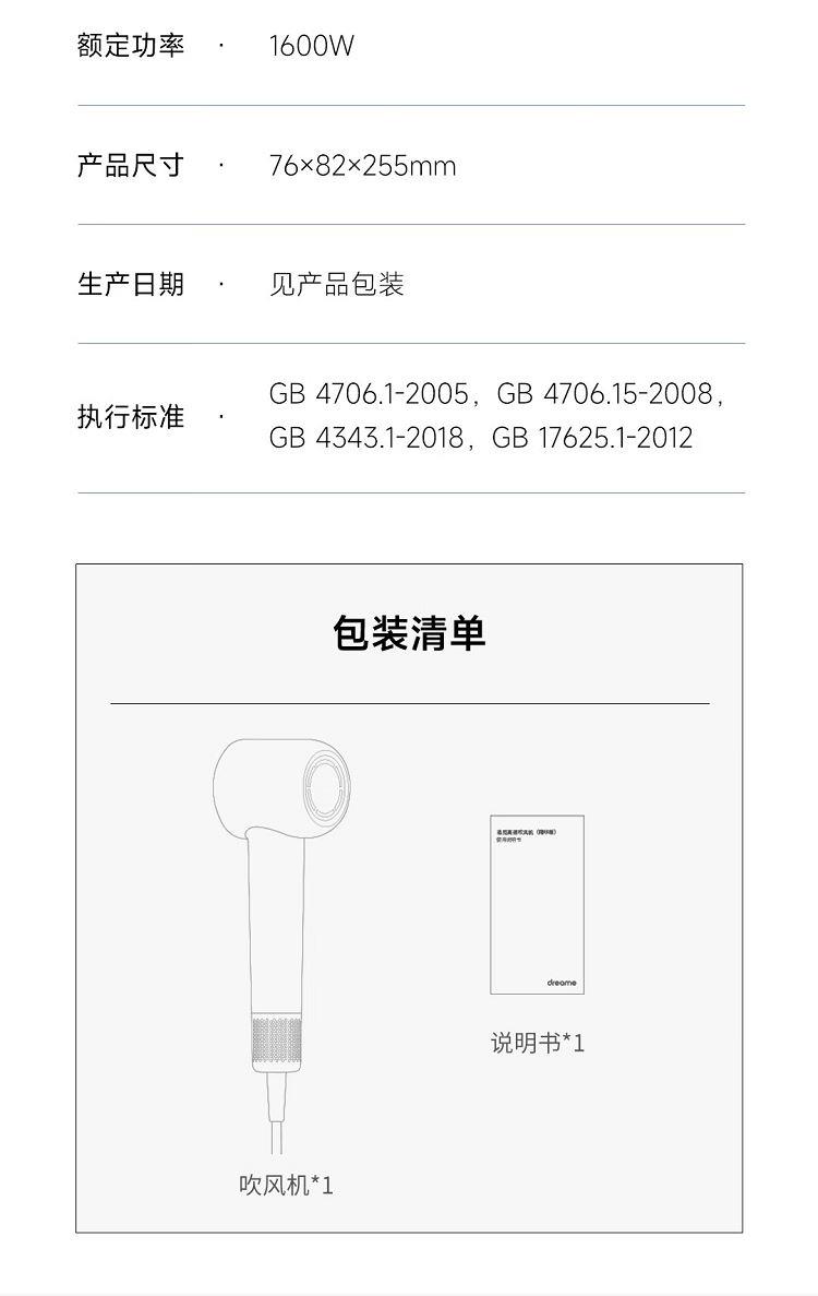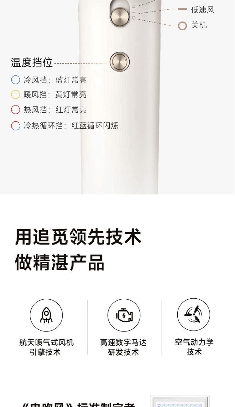 型号:AHD12A-WH 颜色:白色 功率:1600W 电机转速:11万转/分钟 风速:65米/秒 负离子:2亿 模拟航天喷气式风机引擎技术,提高吹发效率 强劲风速,快速干发 200次/秒控温,避免烘烤 2亿高浓度负离子抚平毛躁 330g,比一杯咖啡还轻