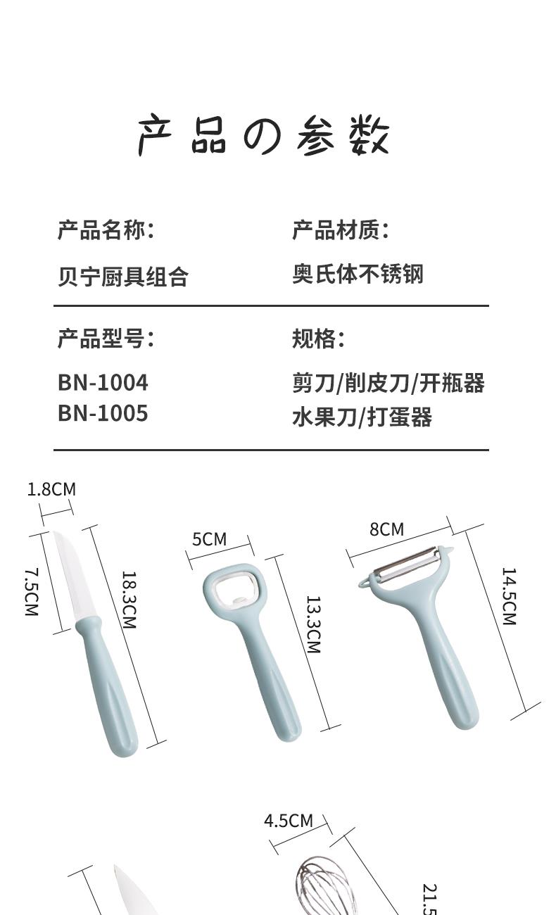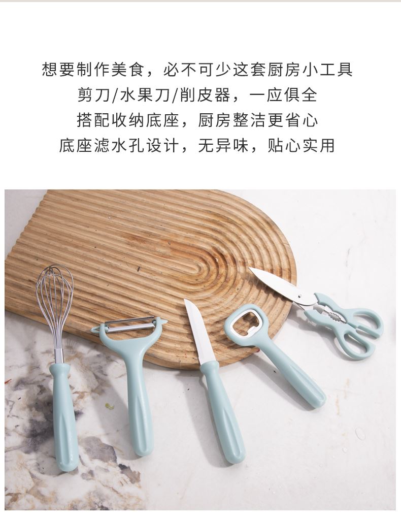 实用厨房套件,小巧多样、功能齐全,家庭生活理想之选 PP手柄不脱手、易用力,减少长久使用带来的疲劳感 独特湿式开刃,采用先进淬火热处理工艺,持久锋利