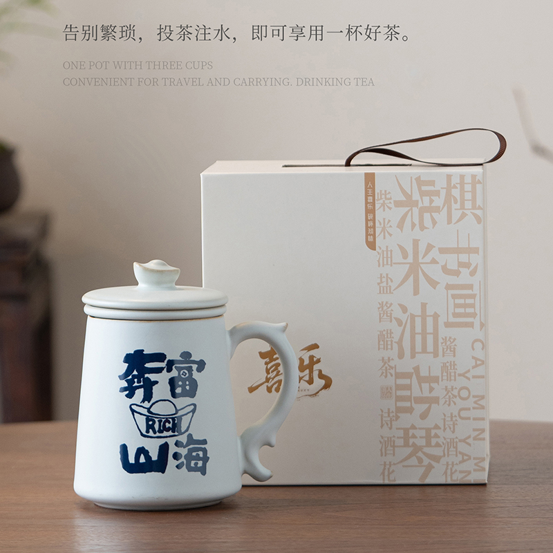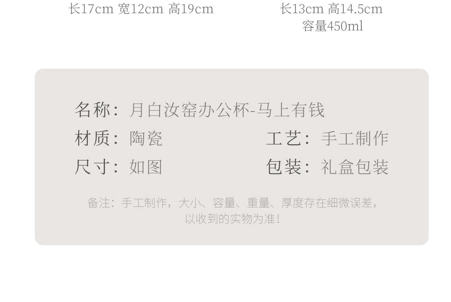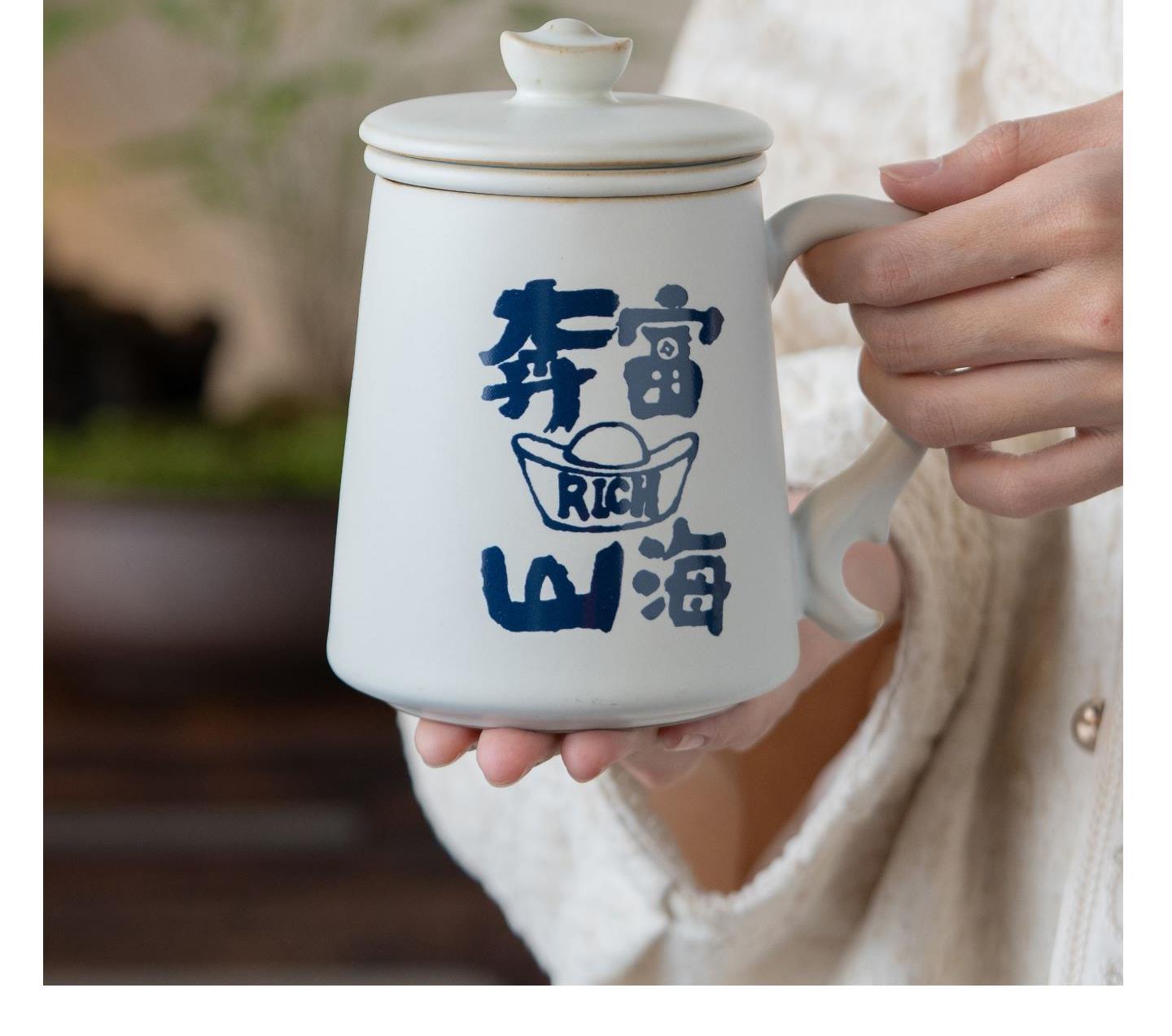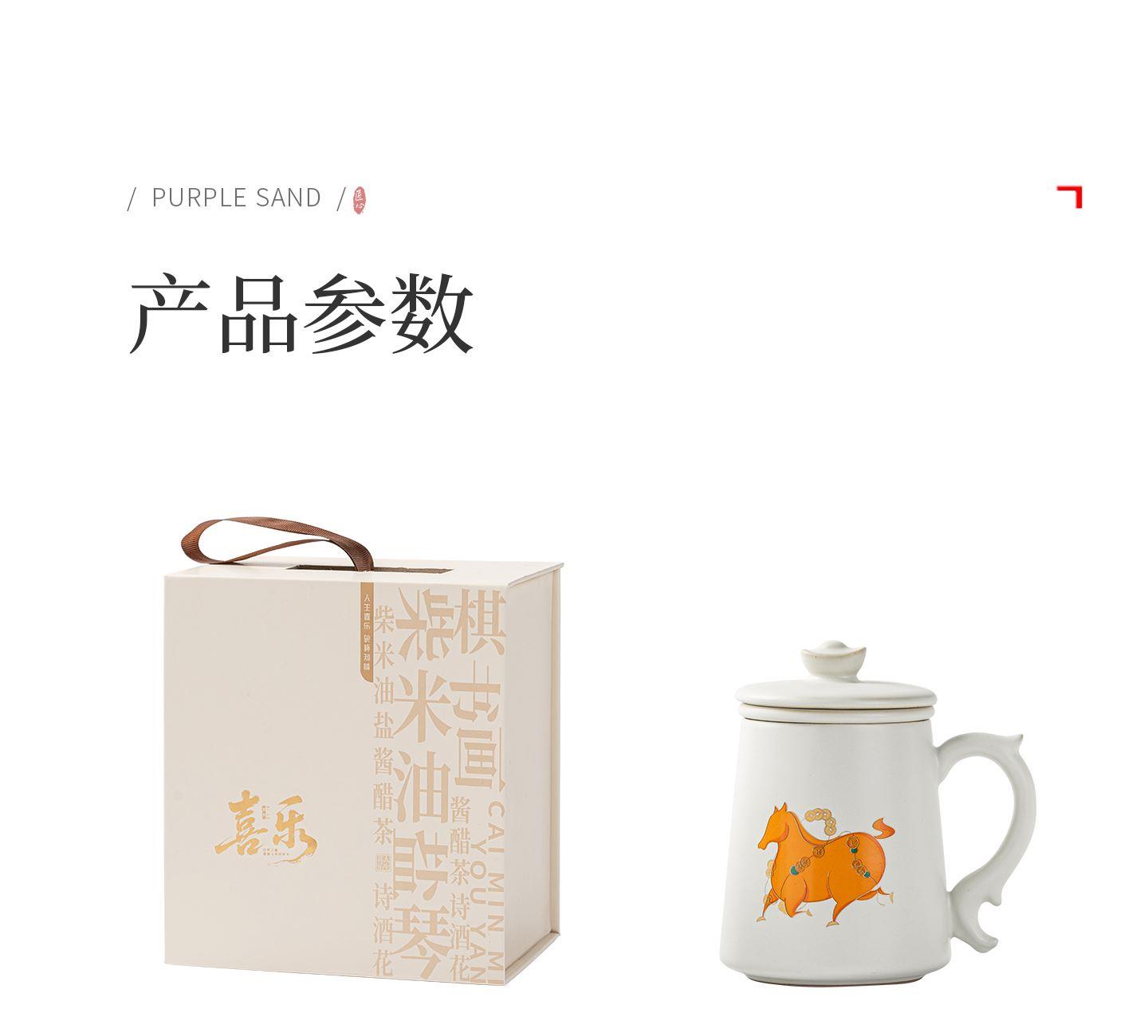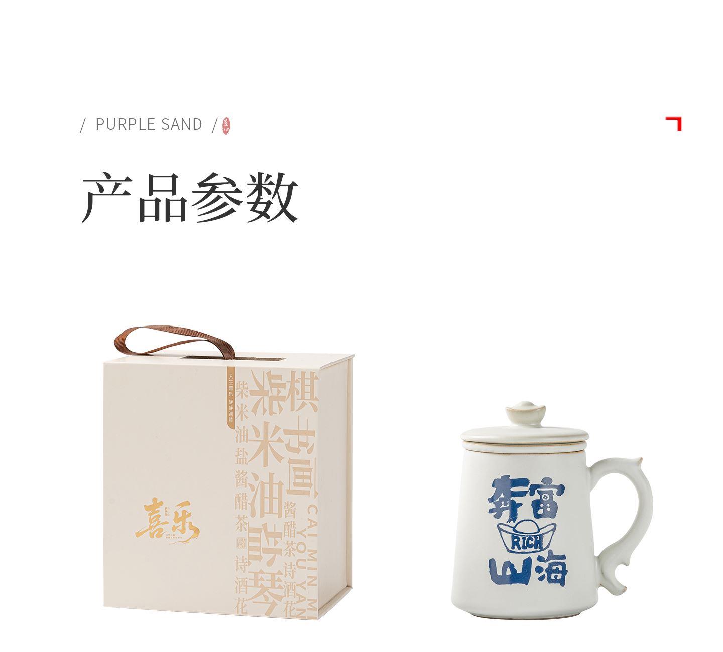 配置:办公杯*1,礼盒*1. 尺寸:办公杯长13cm高14.5cm容量450ml, 礼盒:长17cm宽12cm高19cm。 款式:暴富系列/马上有福系列。