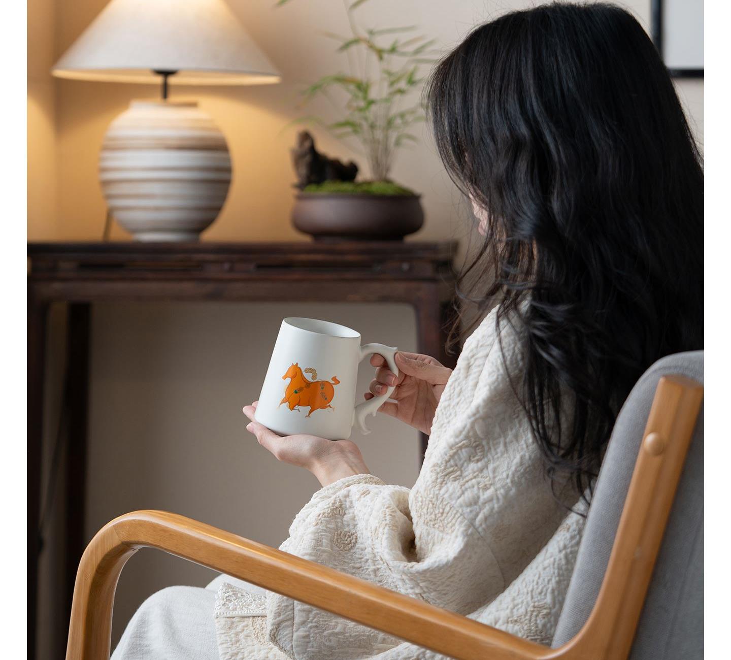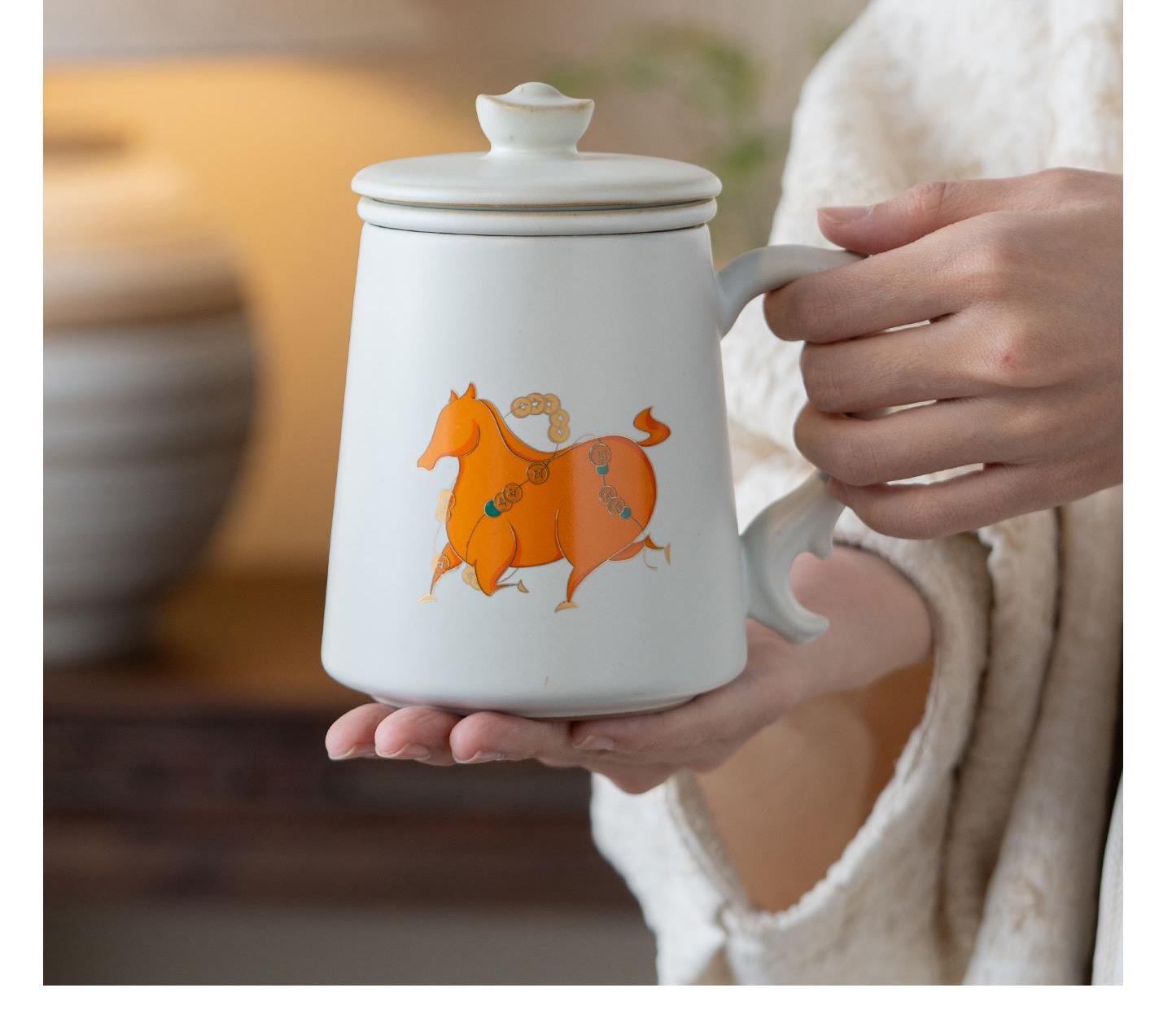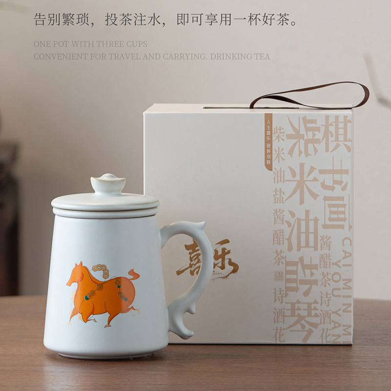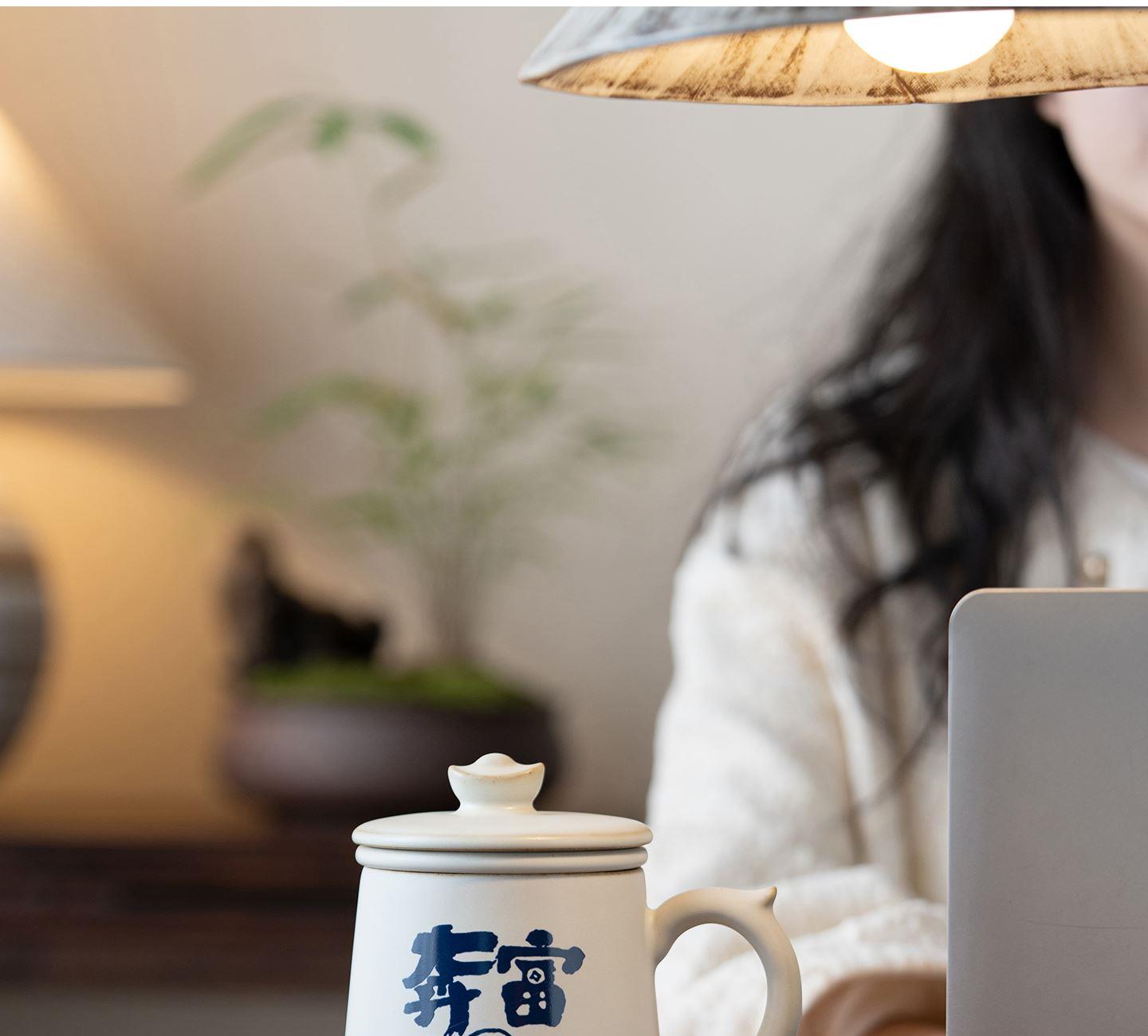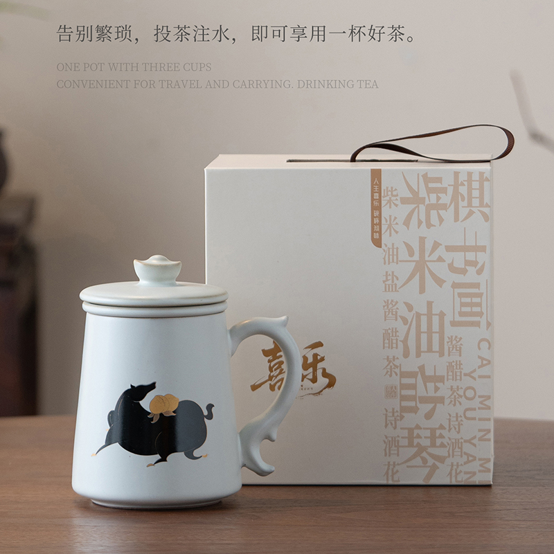 配置:办公杯*1,礼盒*1. 尺寸:办公杯长13cm高14.5cm容量450ml, 礼盒:长17cm宽12cm高19cm。 款式:暴富系列/马上有福系列。