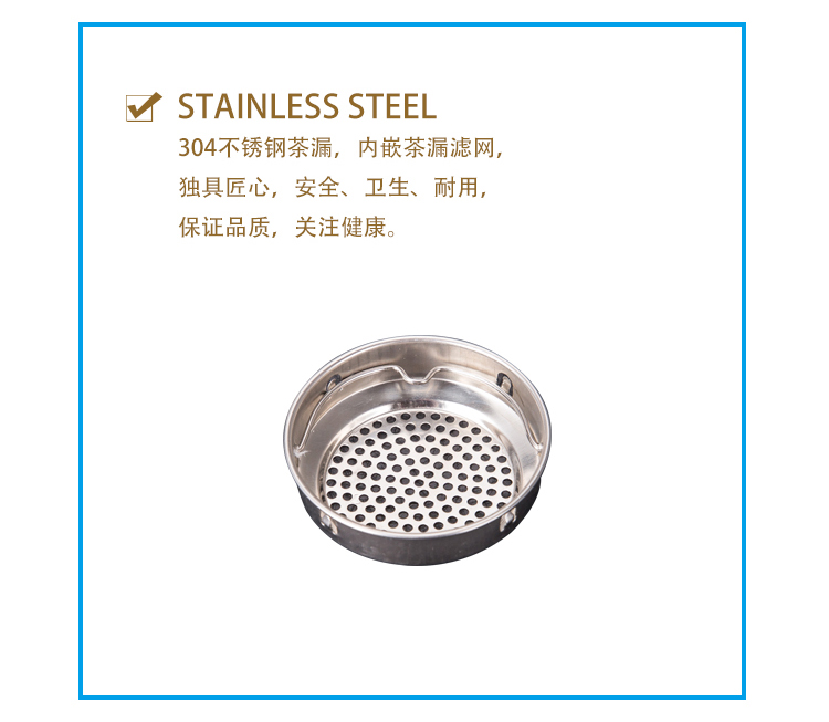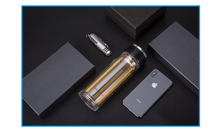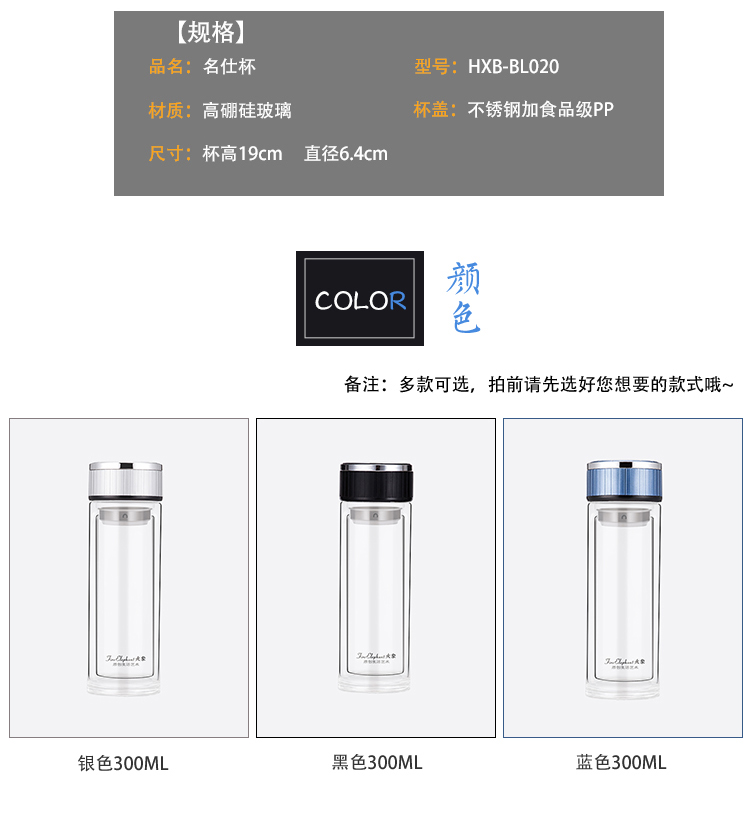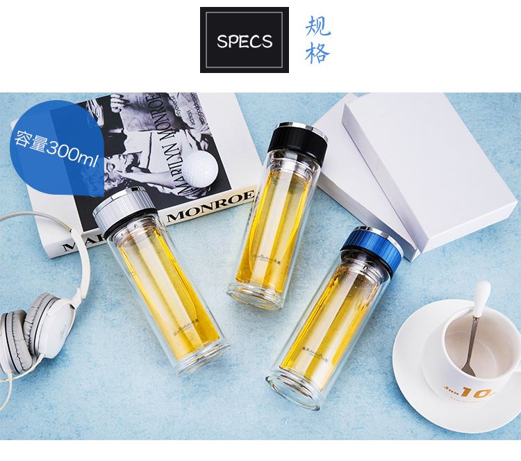 产品规格:300ML 产品材质:高绷硅玻璃 产品颜色:黑色 (银色、蓝色定制) 彩盒尺寸:L7*W7*H20.5CM 外箱尺寸:L44*W37.5*H22CM 1.杯盖食品级PP+不锈钢杯盖,健康材质,安全卫生。 2.胶圈食品级硅胶材质,防漏,耐高温,抗老化,经久耐用。 3.圆润杯口,细腻的工艺,加厚设计,给您舒适的饮水体验。 4.304不锈钢茶漏,内嵌茶漏滤网,独具匠心。