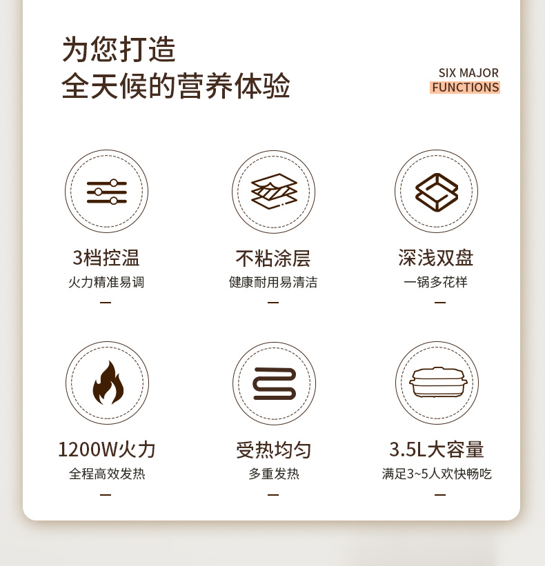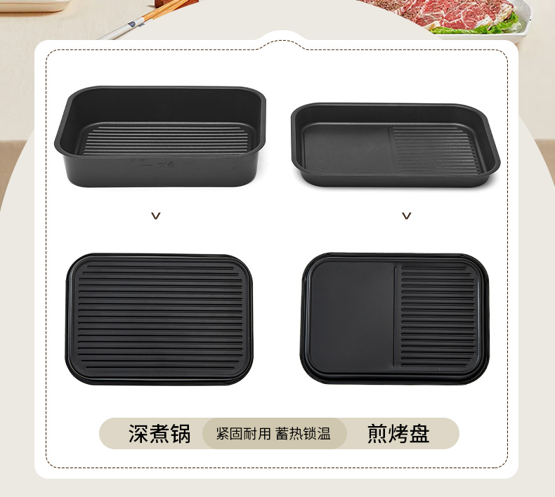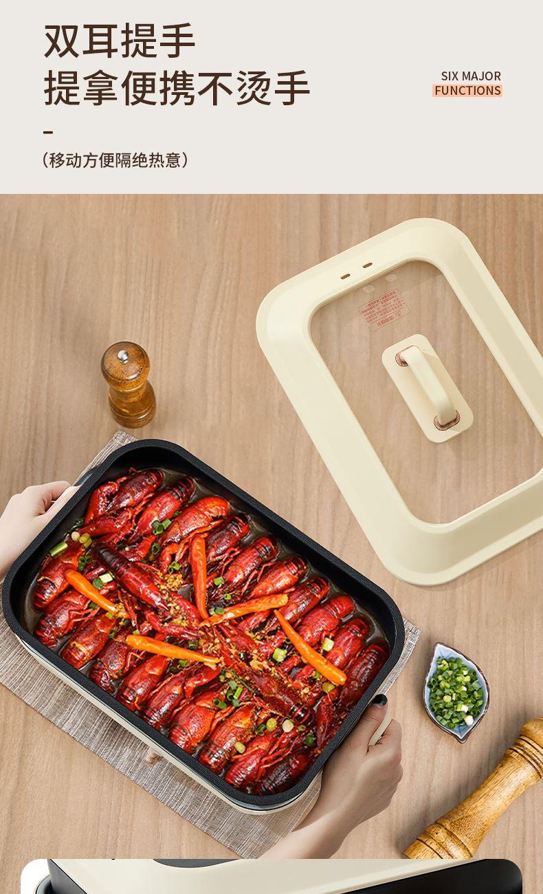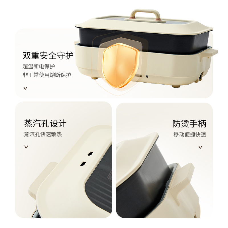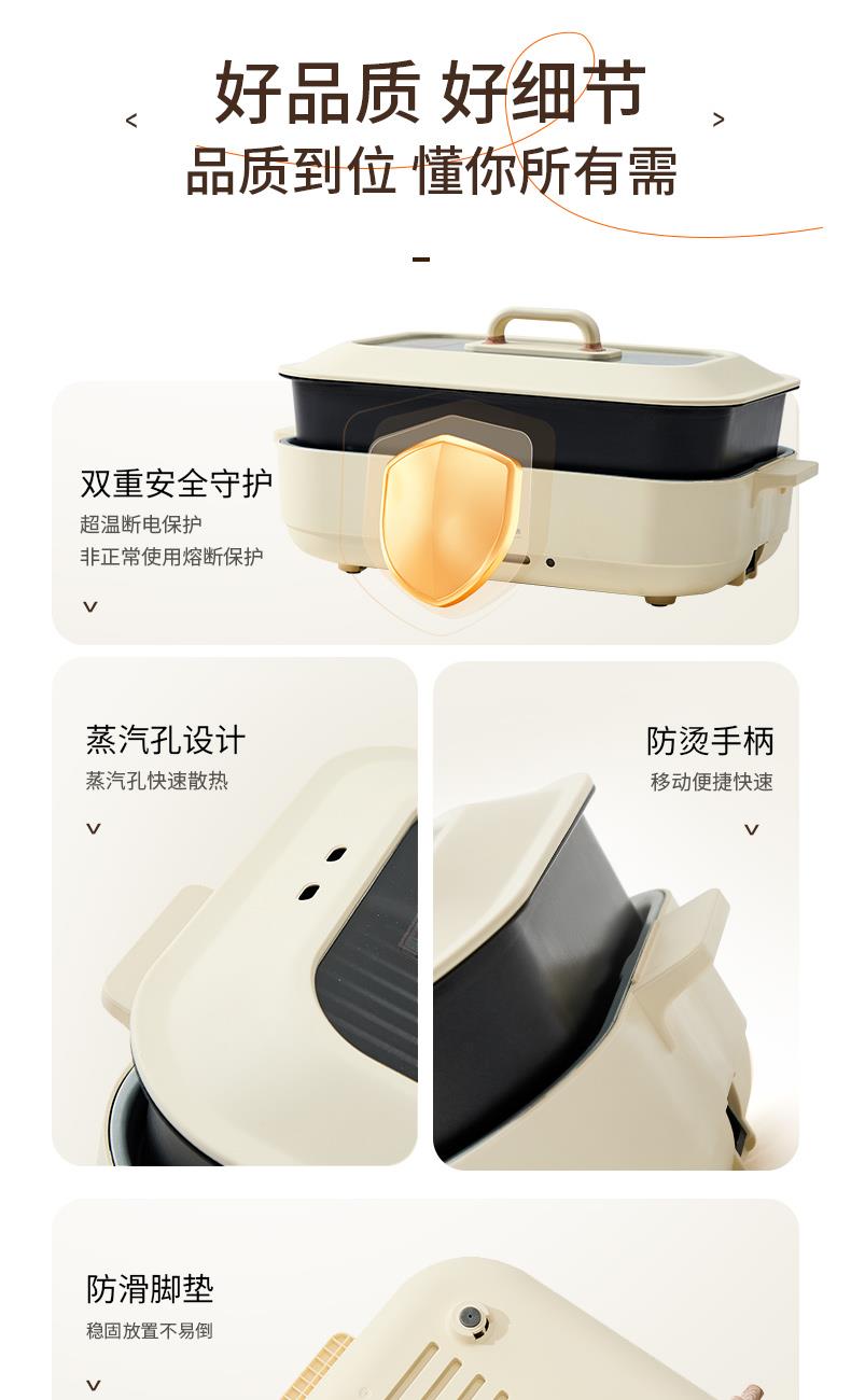 产品参数: 额定电压:220V 额定频率:50Hz 额定功率:1200W 额定容量:3.5L 净重:2.99kg 毛重:3.63kg 产品尺寸:388*235*187mm 彩盒尺寸:420*275*190mm 外箱尺寸:570*440*595mm 产品卖点: 深煮盘+煎烤盘 同时满足3-5人份量 双耳提手,提拿便携不烫手; 防干烧/高温自动断电; 360°整圈发热,发热更均匀。
