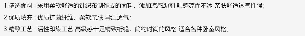 货 号 :HXB-2613 面 料 :小冰格针织布(加凉感助剂) 填 充 :抗 菌纤维 规 格 :200*230cm 重 量 :1400g 包装尺寸 :48x36x13.5cm 装 箱明细 :8床/箱或50条/包 1.精选面料 : 采用柔软舒适的针织布制作成的面料,添加凉感助剂 触感凉而不冰 亲肤舒适透气性强; 2.优质填充 : 优质抗 菌纤维,柔软亲肤 导湿透气; 3.精致工艺 : 活性印染工艺 高 级感十足精致绗缝,简约时尚的风格 适合各种卧室风格;
