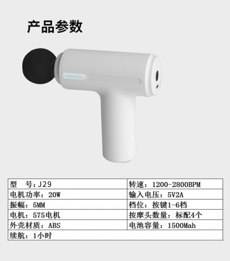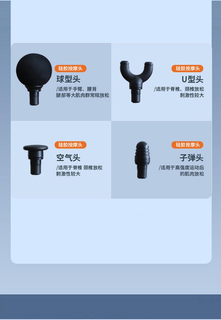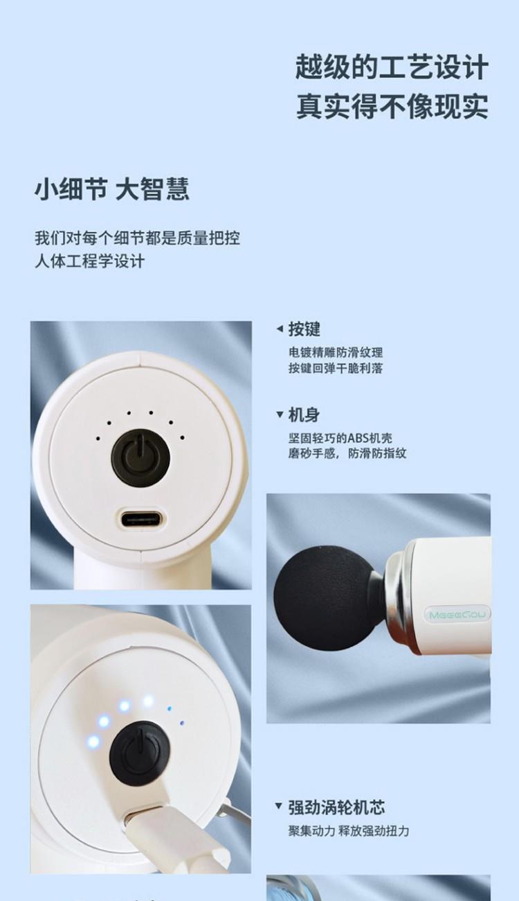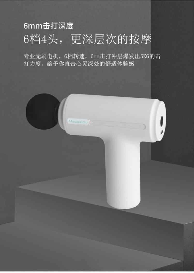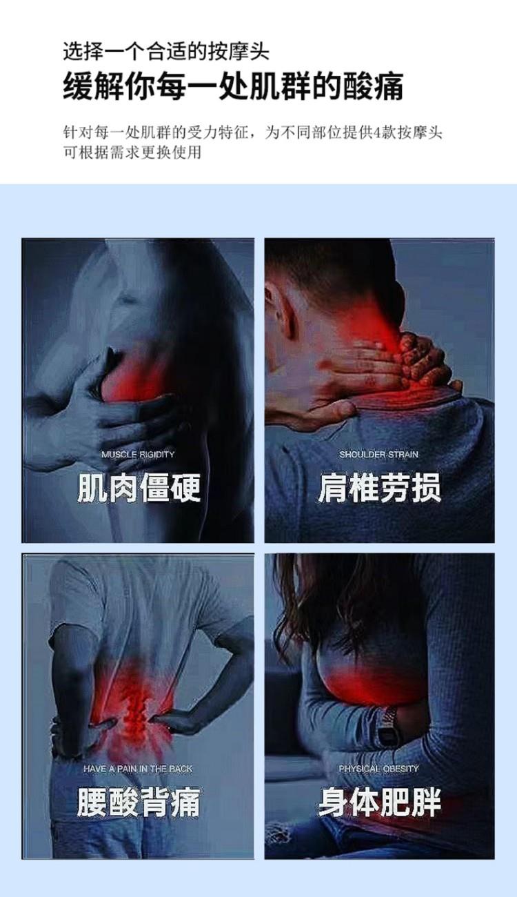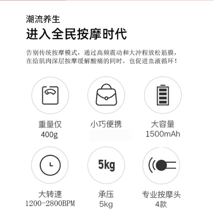 筋膜枪: 1、小巧轻盈,久用手腕不易酸,外出差旅,锻炼运动,携带方便 2、强劲涡轮机芯、 Type-c充电、防滑手柄设计 3、6档4头,更深层次的按摩,专业无刷电机,6档转速,6mm击打冲层爆发出5KG的击打力度,给予你直击心灵深处的舒适体验感 颈部按摩仪: 1、方便携带,戴脖子上 轻巧无重力感 2、6种按摩手法模式,9档力度调节 3、缓解僵硬肿胀(六大按摩手法:推拿、针灸、刮痧、脉冲、拔罐、叩击) 4、弹性臂技术回弹好韧性强,深度贴合颈部