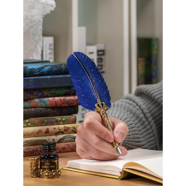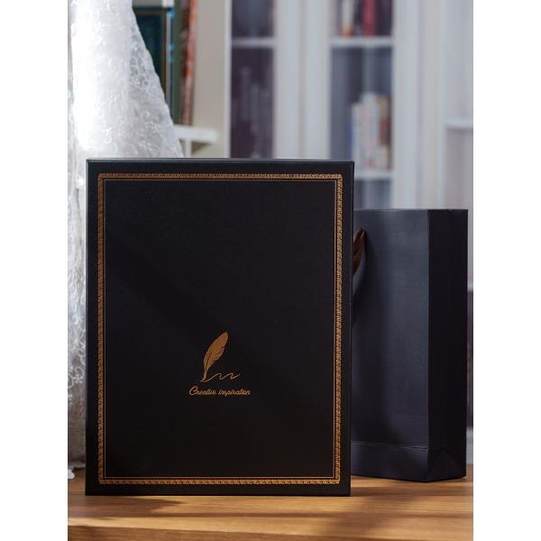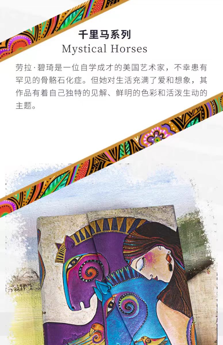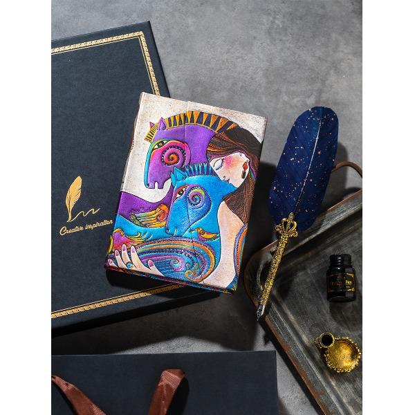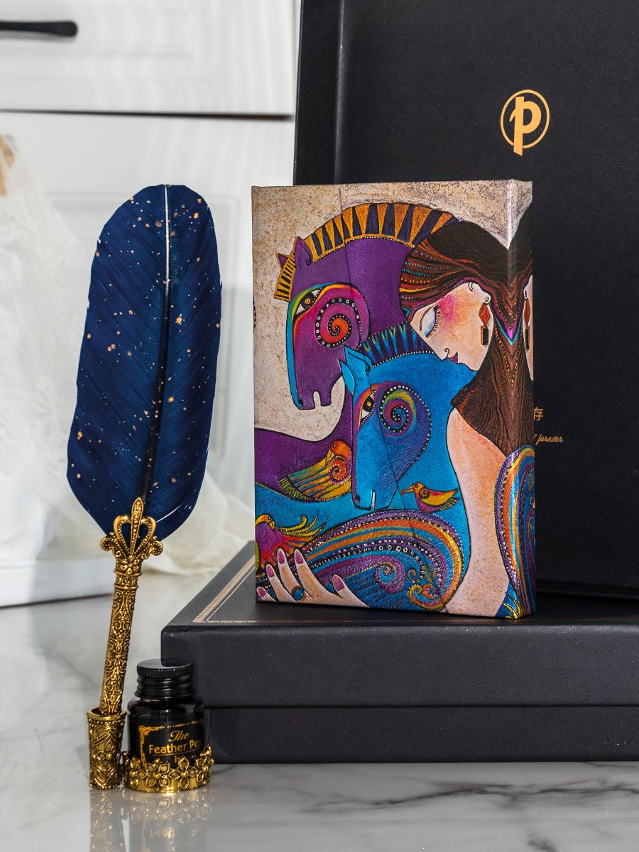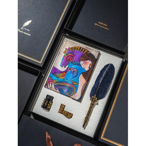 产品:千里马羽毛笔笔记本礼盒套装 创作灵感:封面重现了美国艺术家劳拉.碧琦的绘画作品《玛利亚和马雷斯》。 礼盒组件:羽毛蘸墨笔、金属笔座、15ml墨水、中本笔记本、礼袋 礼盒尺寸:290*230*54mm 礼袋尺寸:300*250*60mm 本子尺寸:125*180mm 本子页数:144页 纸张材质:120克重无酸纸